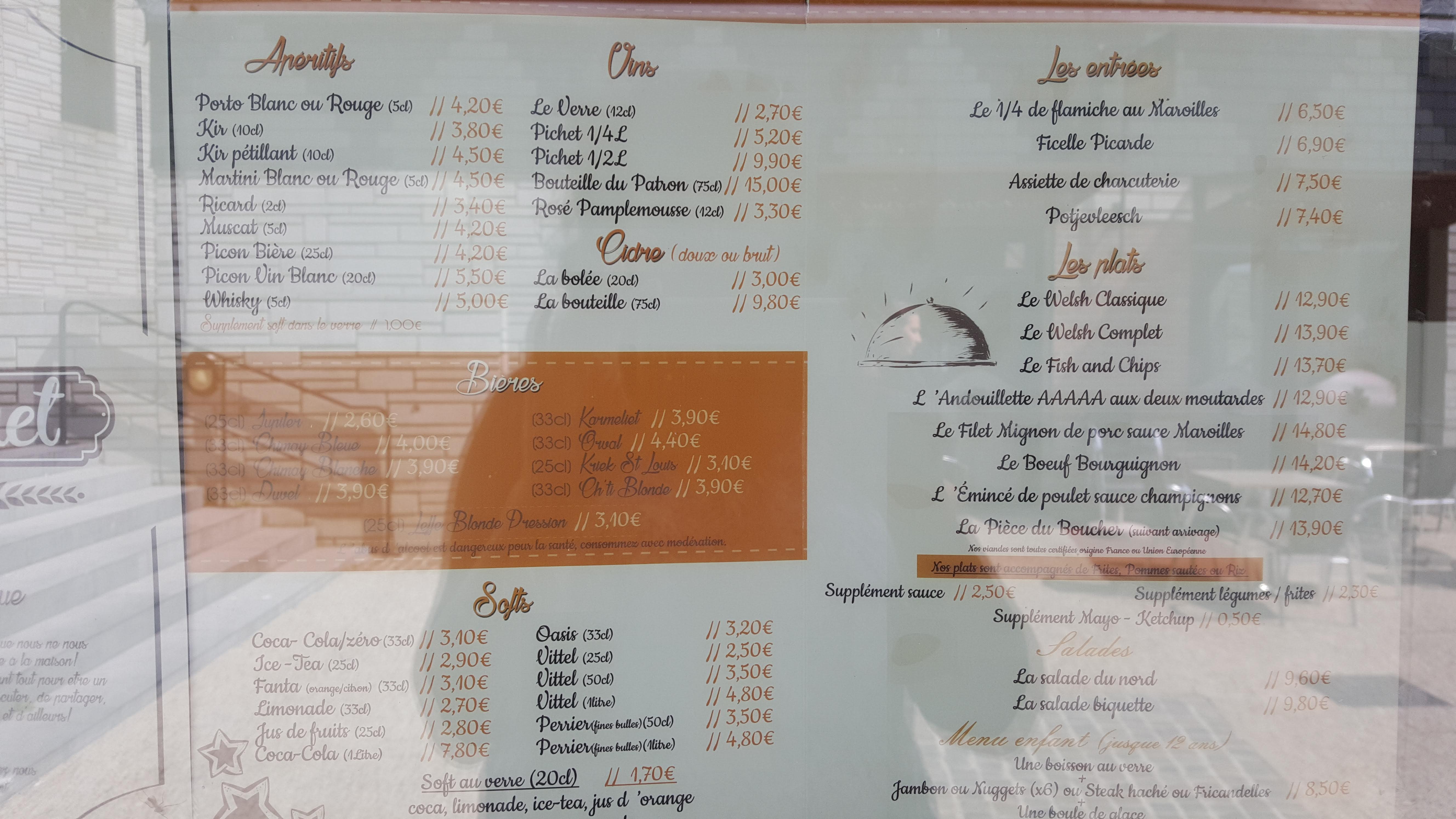 Nous sommes allés au restaurent le 10/07/2016 pour la final de l'euro. Nous somme arrivés à 20h pour être servit à 21h et voir des gens arrivés après nous être servit avant. Leur menu très peu garni ne proposé qu'une viande et le comble, à 21h ils n'en n'avaient plus. Nous avons prit une flamiche aux maroilles sans gout. J'ai dû faire changer mes deux couverts sale. En fin de soirée je leur demande un pichet d'eau et j'ai dû me déplacer une demi heure après pour leur redemander car ils avaient oubliés. Et pour finir, ils se trompe dans la note en voulant nous faire payer, en plus de la notre, celle de la table d'à cotée. Un service exécrable, vraiment déçu. Je n'y retournerais plus jamais.