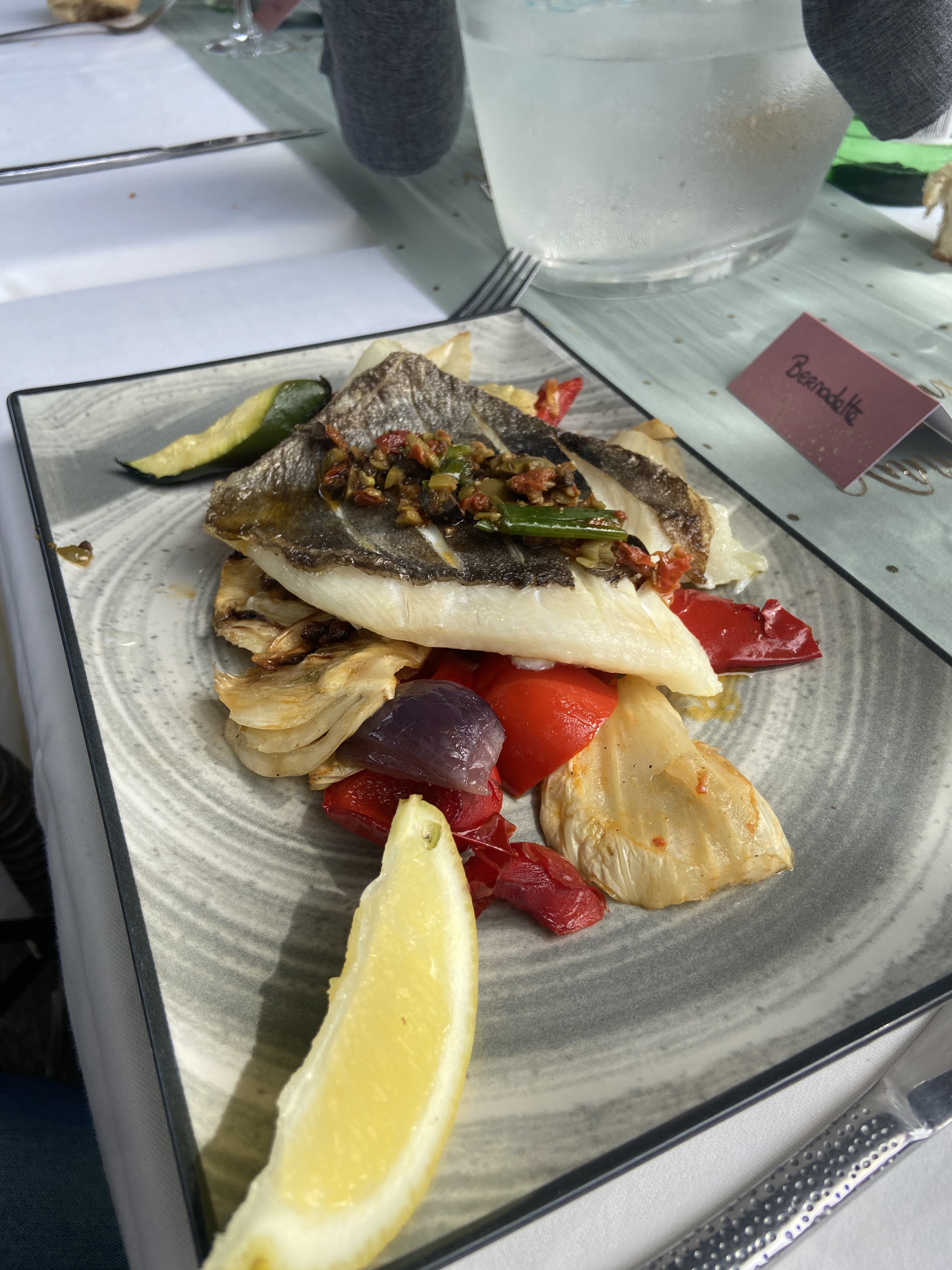 Nous avons dîner pour la première fois dans ce restaurant, belle situation devant le lac et aux pieds du rocher de Roquebrune sur argens, on nous proposer une table en terrasse au bord de l'eau, la situation des tables n'étant pas proche les unes des autres, cela permet une petite intimité, pour le repas, nous avions choisi le tartare de saumon en entrée, finement préparé et agréable saveur, en plat, on a choisi de l'espadon et ses légumes, plat bien préparé et bonne cuisson, très fin, goût fin et délicat, très peu salé, parfait pour nous, et pour le dessert, un tiramisu, belle portion et fait maison, bonne crème, mais le goût de café dans le biscuit n'était pas assez présent, pour le vin, on nous conseiller le Plavet, parfait pour notre repas, petit bémol en fin de repas, l'envahissement d'une nuée de moucheron, qui nous contraint de partir un peu rapidement.
