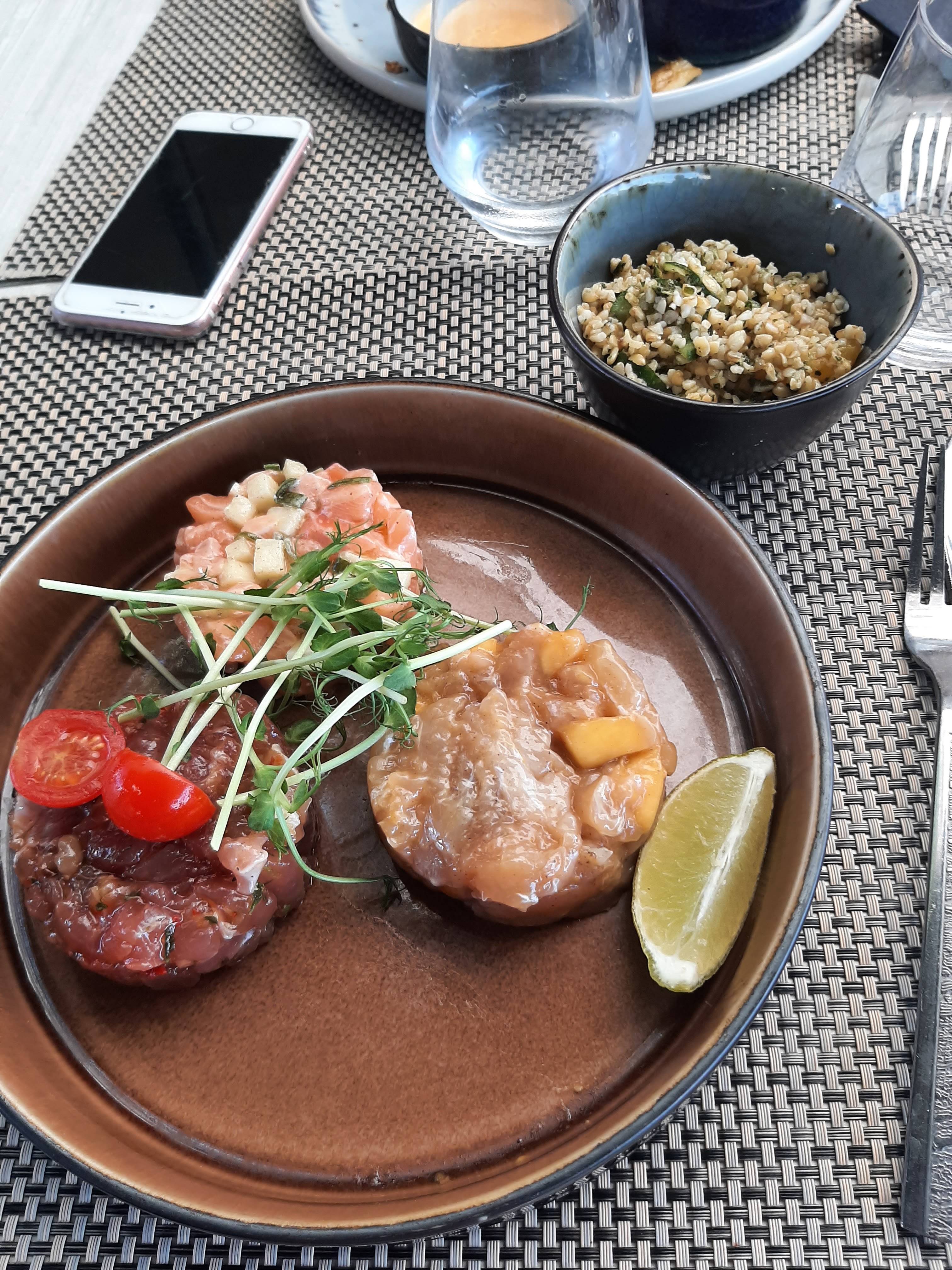 La seule bonne chose à propos de cet endroit est la terrasse et la vue. Les serveurs n'étaient pas attentifs, la nourriture fade et trop chère pour ce que c'était. J'ai eu le risotto noir aux coquilles Saint-Jacques, et mon partenaire le trio de tartare de poisson. 2 boissons et une petite bouteille d'eau gazeuse ajoutées à 69 €. J'hésiterai avant d'y retourner.