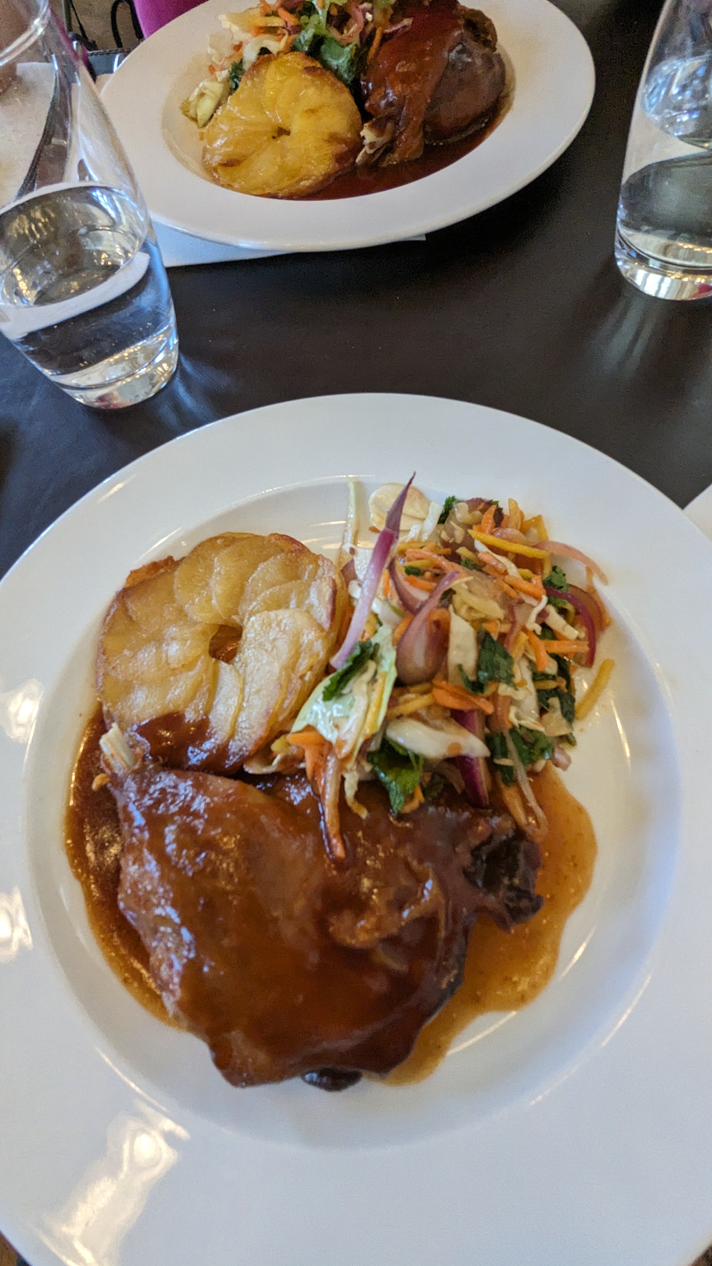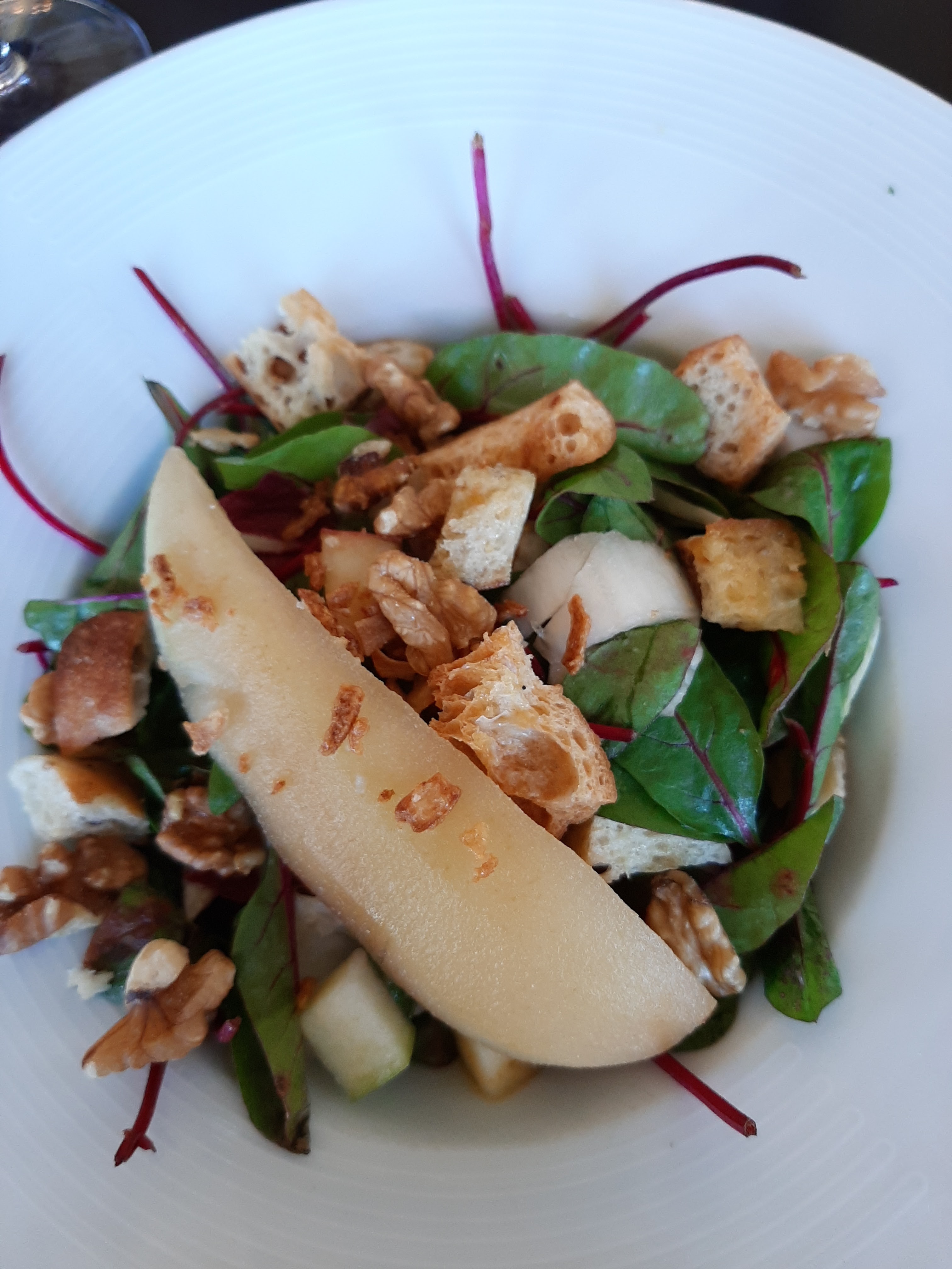 très joli cadre, bonne service pas trop d attente même à midi un dimanche. entré tres correcte et vin aussi et pommes de terres bonnes et fraidms. mais très decus du plat d agneau dans le menu. ne semble pas frais, me rappelle des plats télé de viande de qualité douteux d.autre fois. la serveuse confirme, lorsque nous demandons. c est du sous vide. il y a sous vide et sous vide. couleur texture et gout pas au rdv. apparament le couple dans une table a cote avait fais une observation semblable. je ne recommande pas un plat de viande ici. la salade cesare est très correcte.