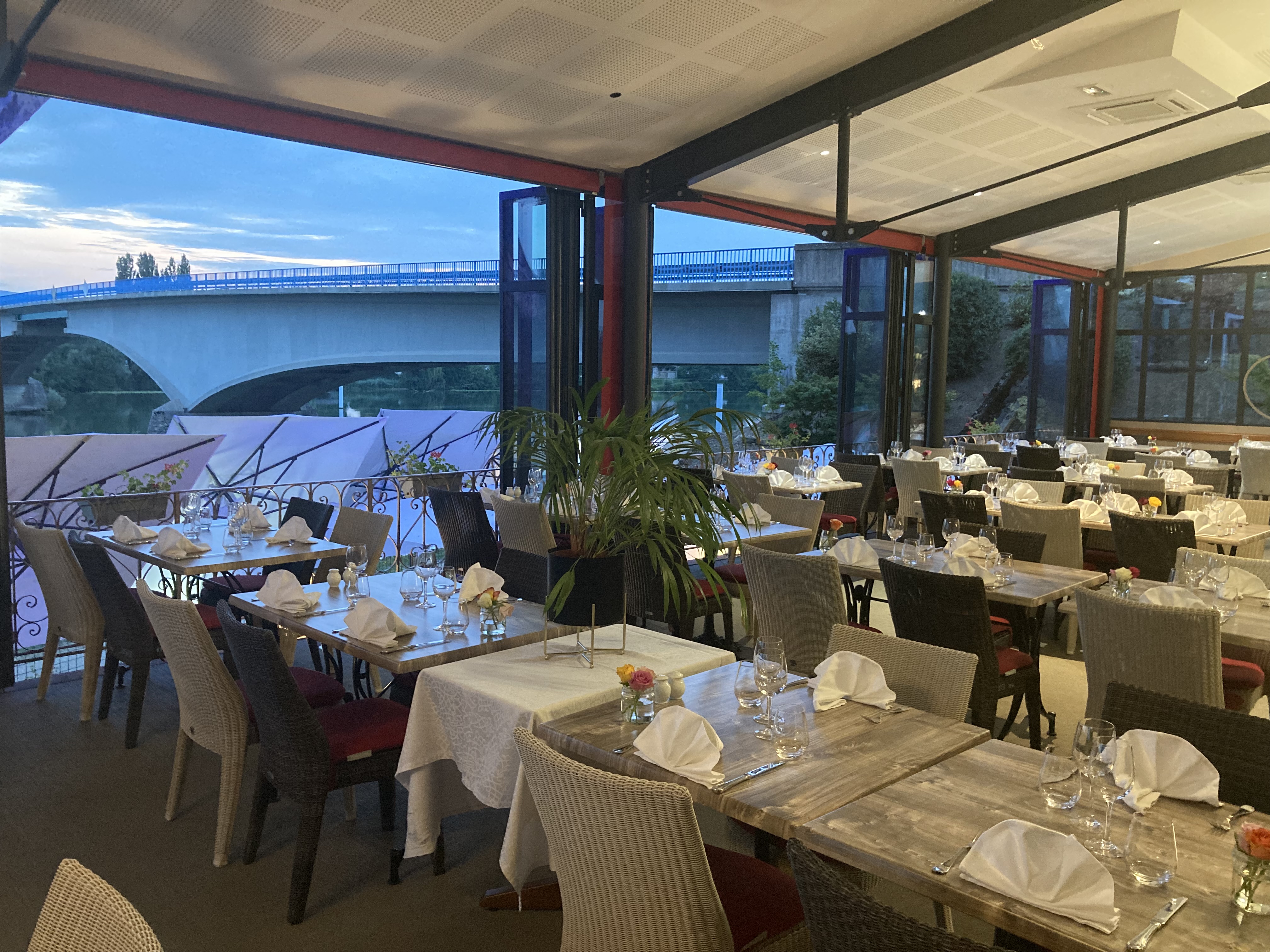 Magnifique restaurant avec superbe vue sur le fleuve. Le menu a 42€ est très généreux avec amuses bouche, entrée très fine (foie gras excellent avec les fraises), plat délicieux (grenouilles et volaille) mais légumes à l’eau pas extraordinaires, fromage et dessert (beaucoup de choix). Service très agréable.