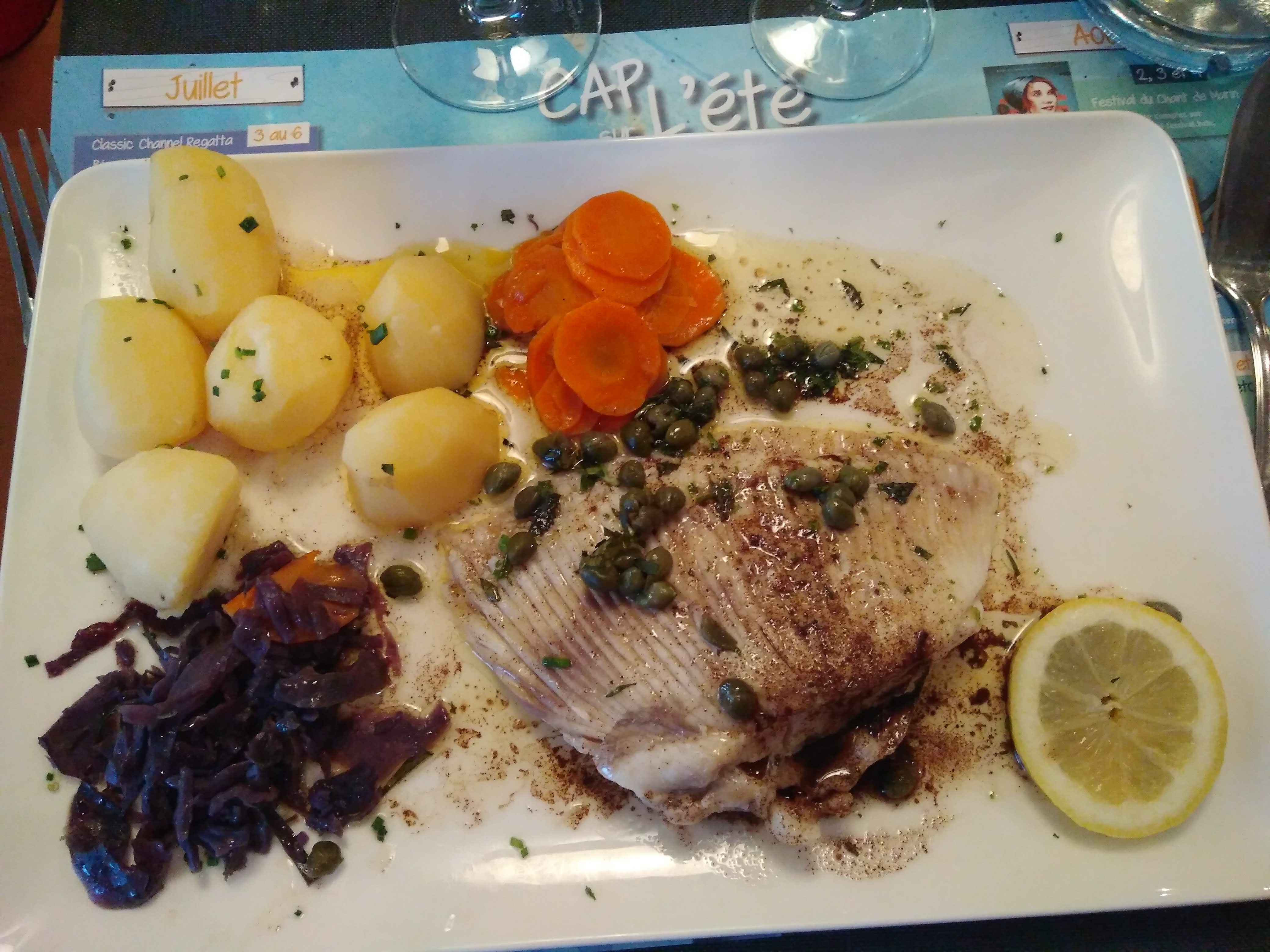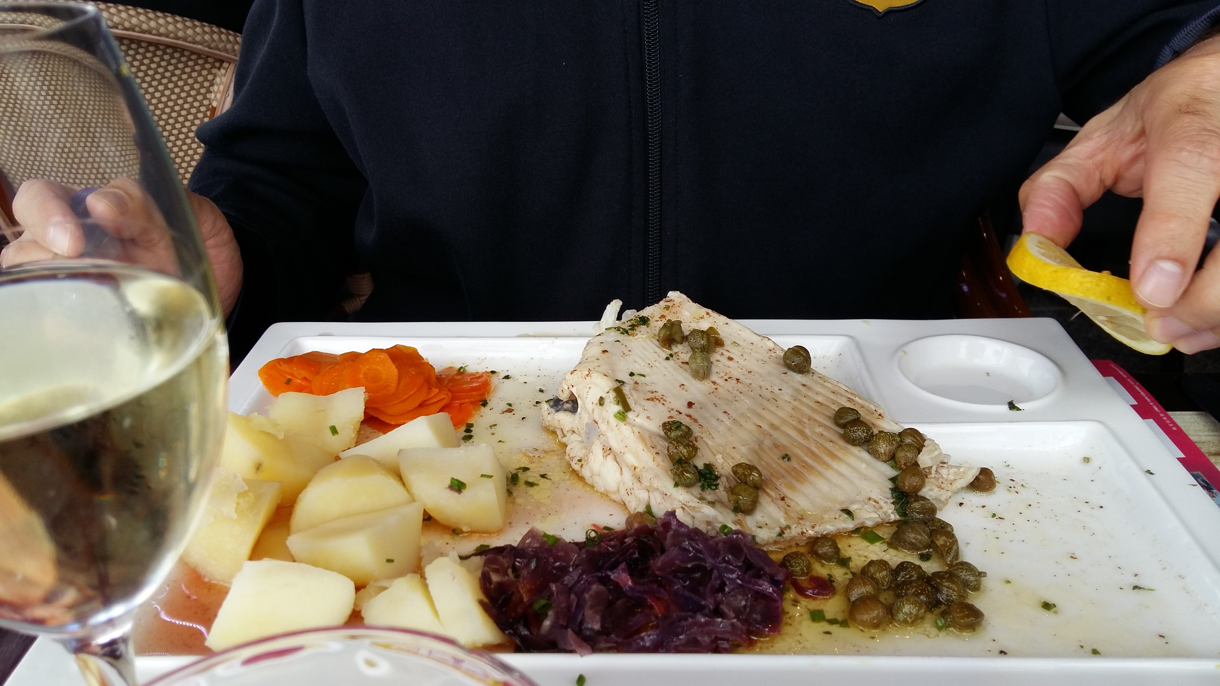 We took saumon poche au beurre blanche and aile de raie and it was excellent. Highly reccomend ;)