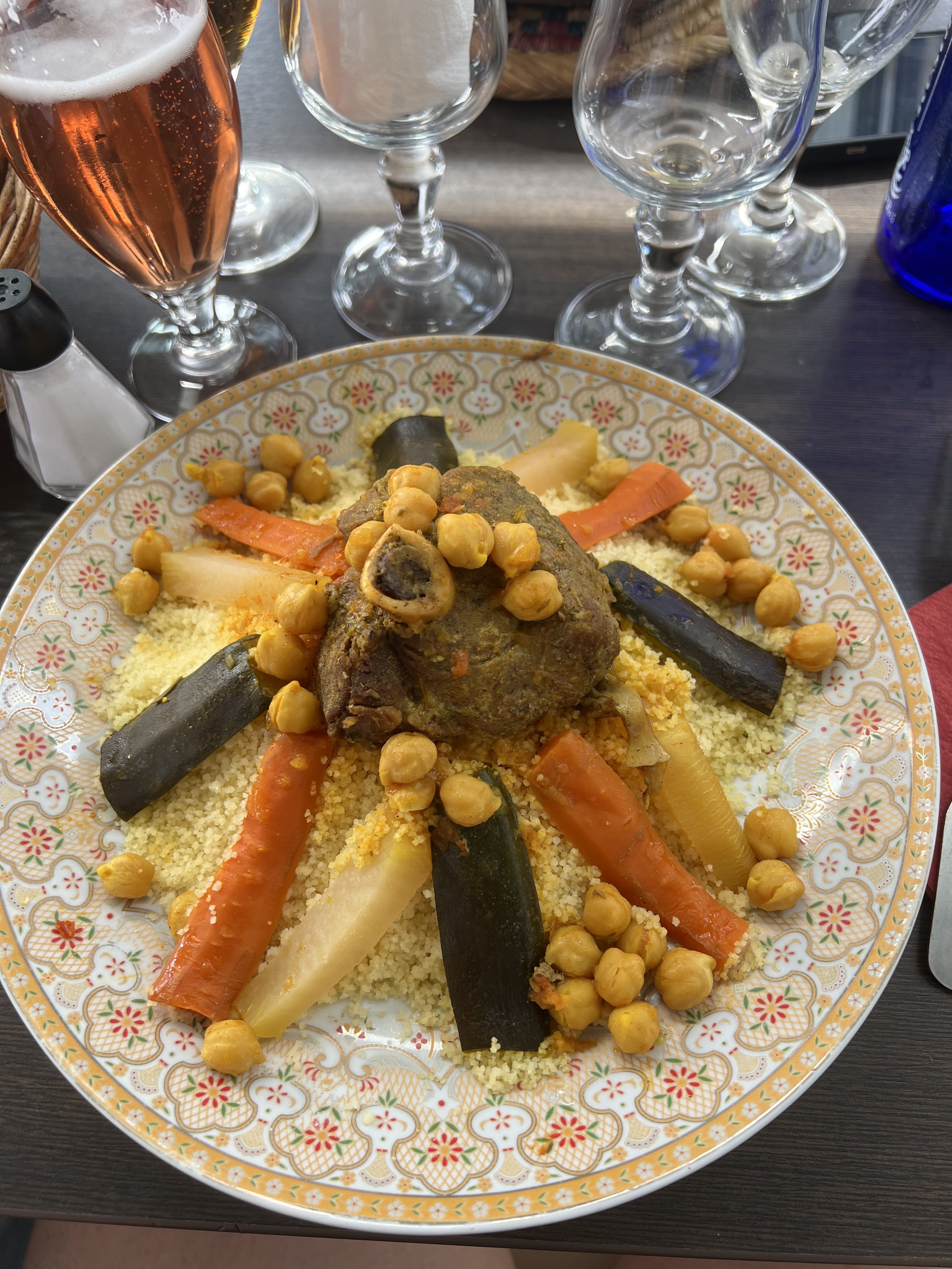 Déjà à l'apéro demandé 2 muscat et 1blanc moelleux,servi 3 muscadet,quand on a fait la réflexion,il nous a été répondu,moi je n'y connais rien je ne bois pas d'alcool, entrée la salade,2 crevettes et du surimi,quant au tagine aucune saveur,tout cuit à l'eau avec des petits pois en boîtes,nous avons tout laisser et sommes partis avant le dessert,nous avons payé quand même. A fuir absolument !