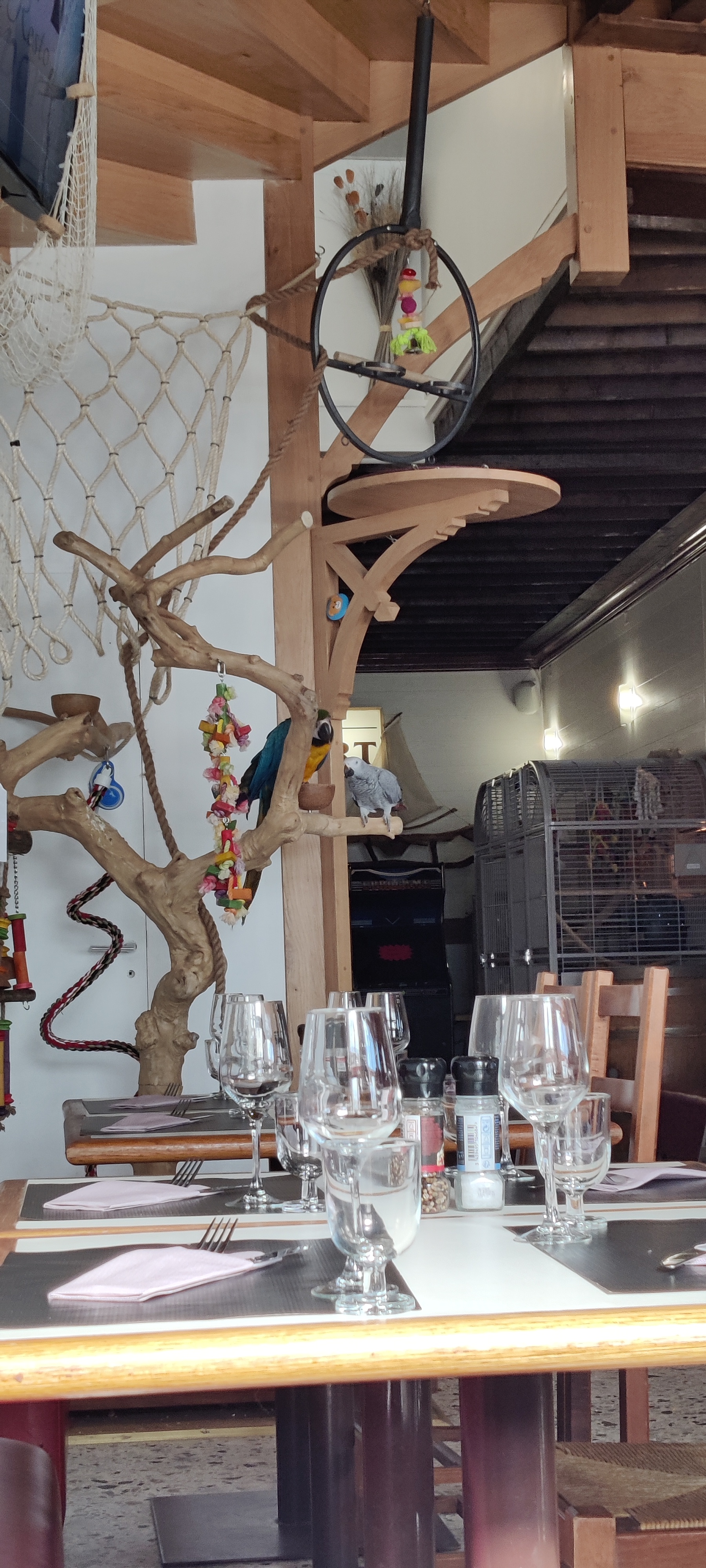 Restaurant avec la présence d'un perroquet 🤦 quid de l'hygiène ? Ce Soir là, il n'a pas arrêté de crier et c'est très agaçant de l'entendre pendant tout le repas. Les plats sont juste passables et les profiteroles à 7,5€ ( non faites maison)