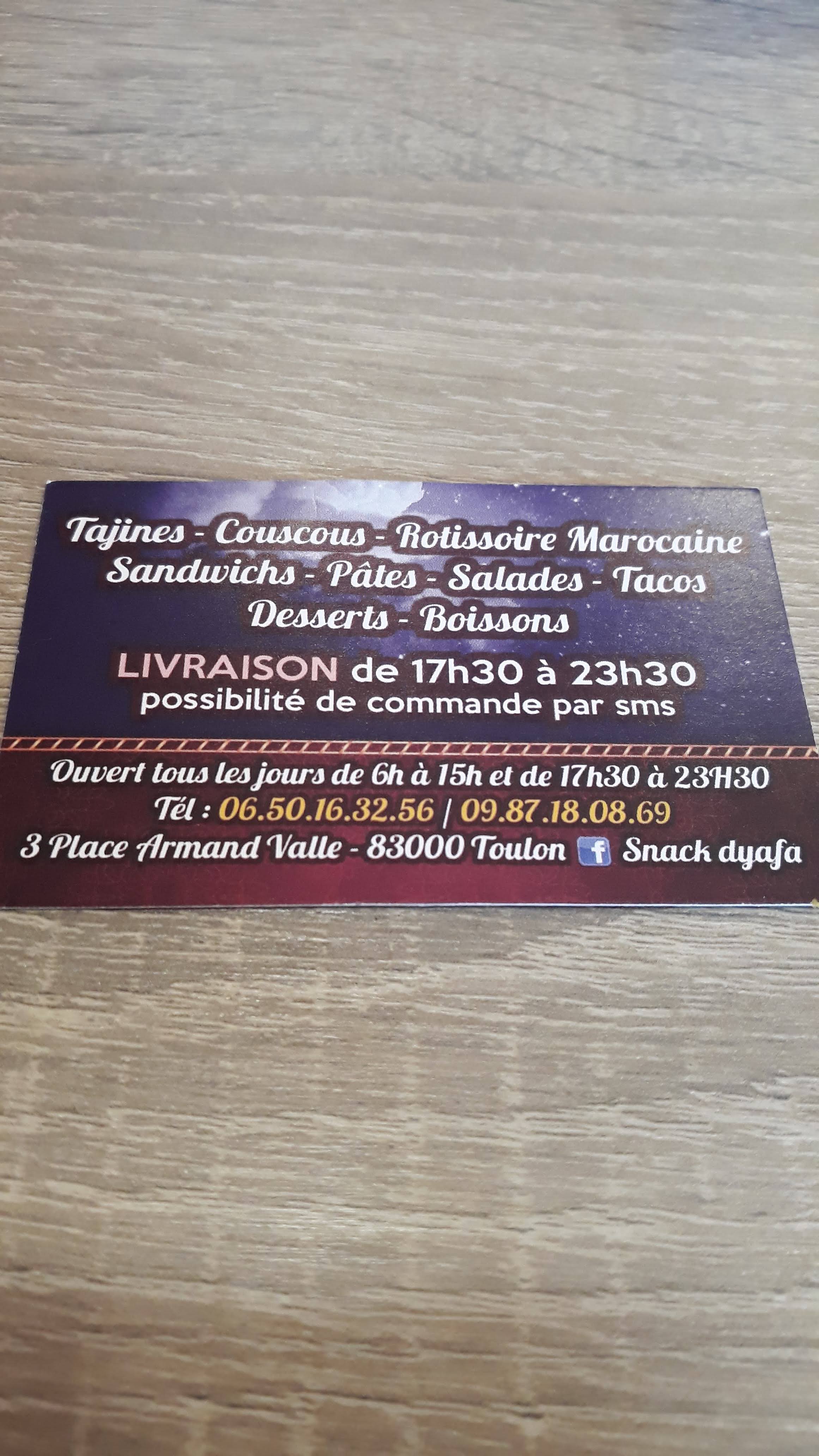 Voici toutes les informations sur le Restaurant Restaurant dyafa spécialité marocaine qui ce trouve au 3 Av. de Besagne, 83000 Toulon (83). Sur cette fiche vous trouverez les photos, l'adresse, les horaires d'ouverture, le numero de téléphone et les avis clients.Vous pouvez églement rédiger un avis si vous le souhaitez en bas de page.