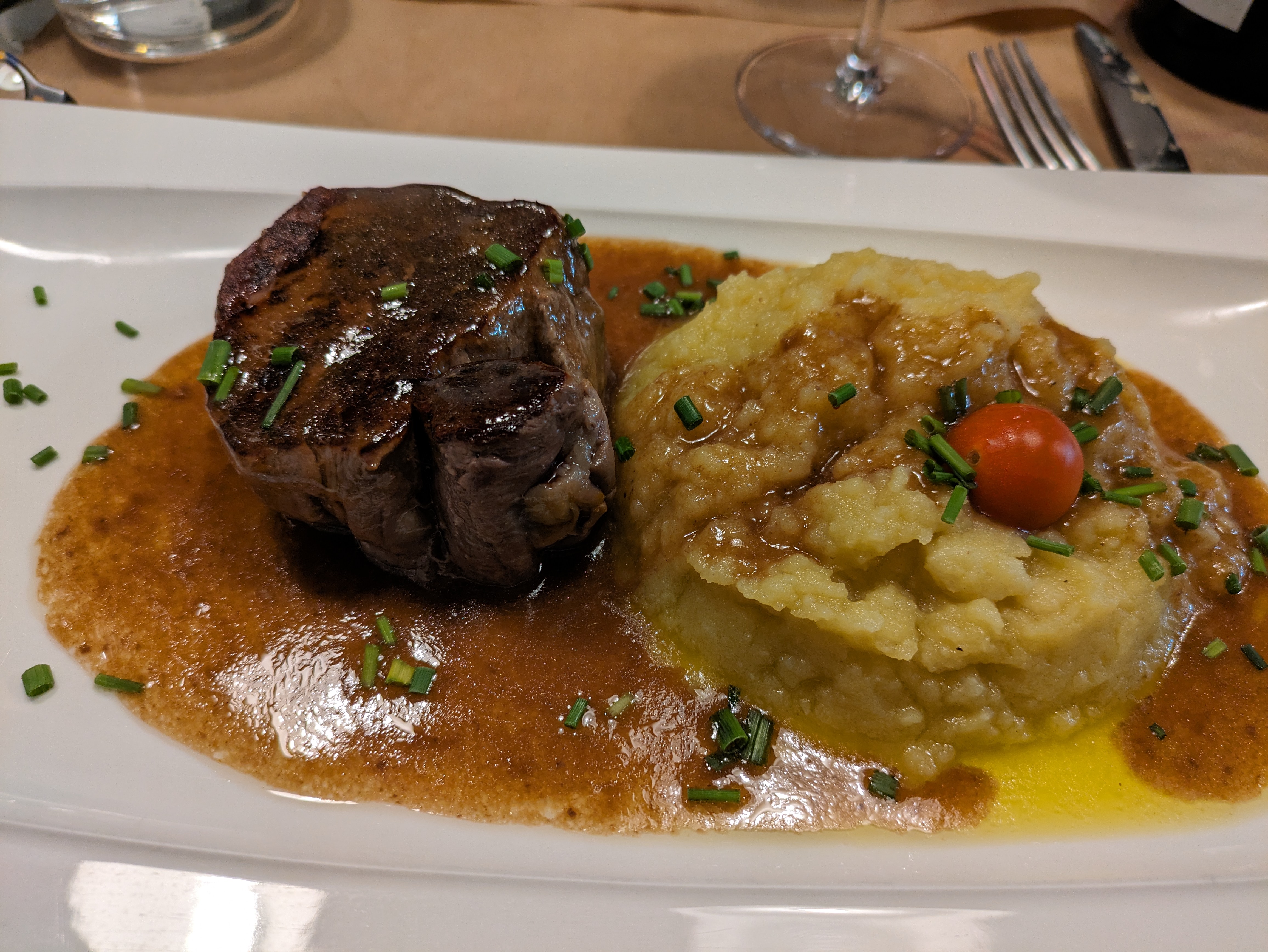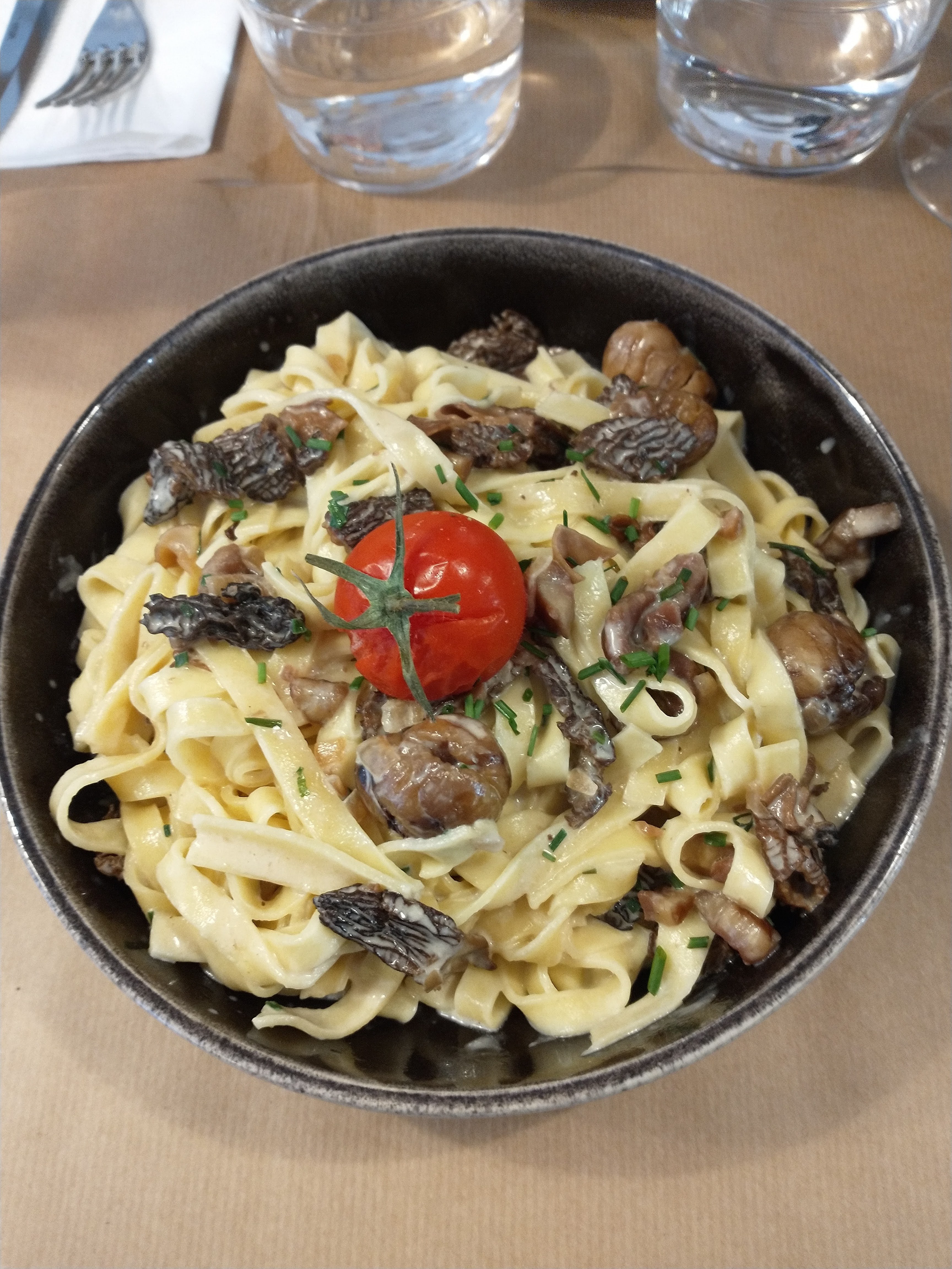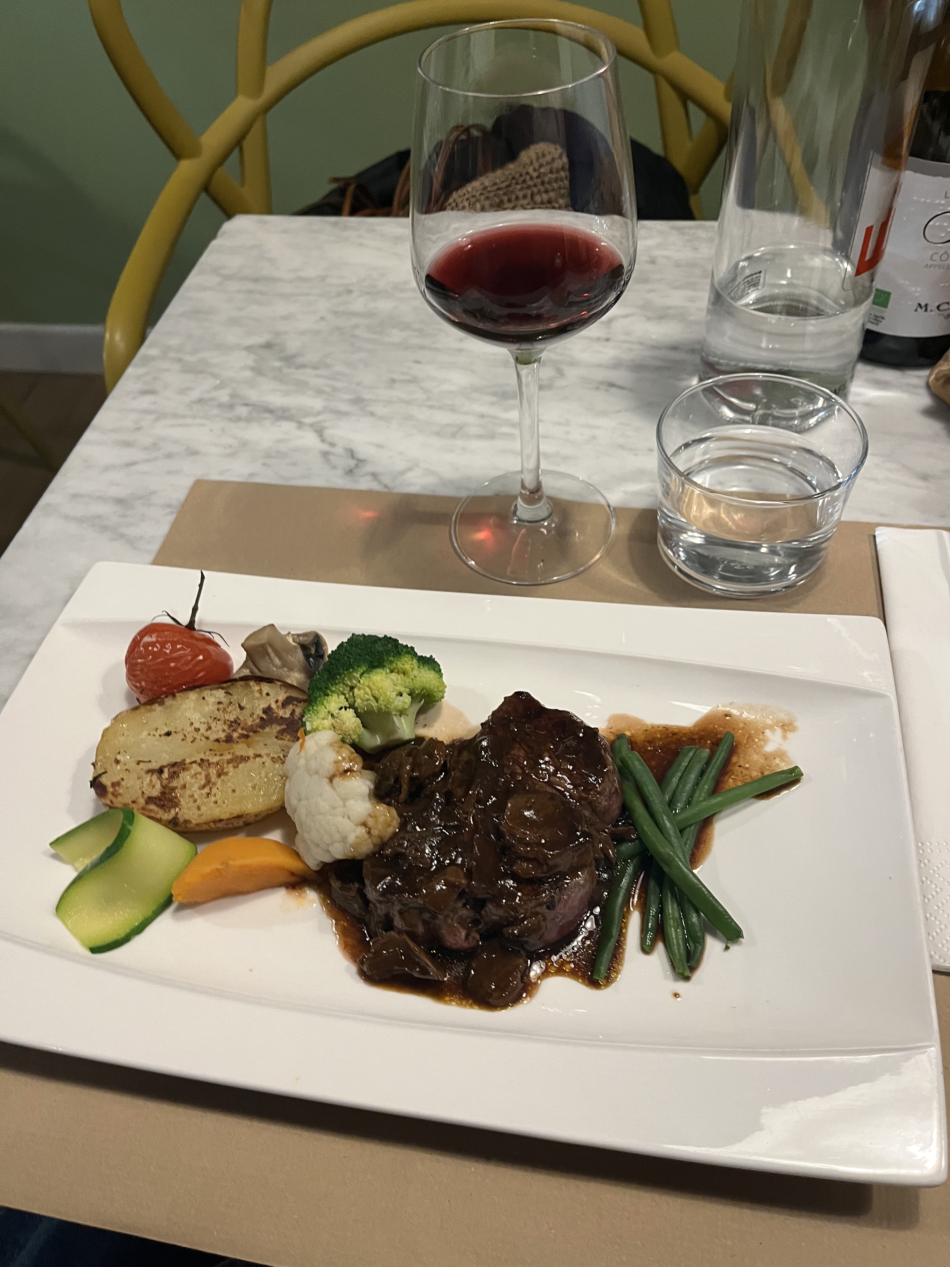 Le restaurant était super. Nous nous sommes assis dehors pour le dîner et la table était bien rangée. Nous avons partagé le plat de pâtes tagiatelles et la sauce crémeuse aux champignons était délicieuse ! 🍄 L'entrée de courge était très bonne aussi. Notre dessert était la crème brûlée et nous avons également eu la meringue au citron. La crème brûlée était de la crème de marrons à l'intérieur au lieu de la vanille, mais toujours excellente. 🌰 La meringue au citron était le MEILLEUR dessert que j'ai jamais mangé pendant notre voyage. J'adore ce restaurant.