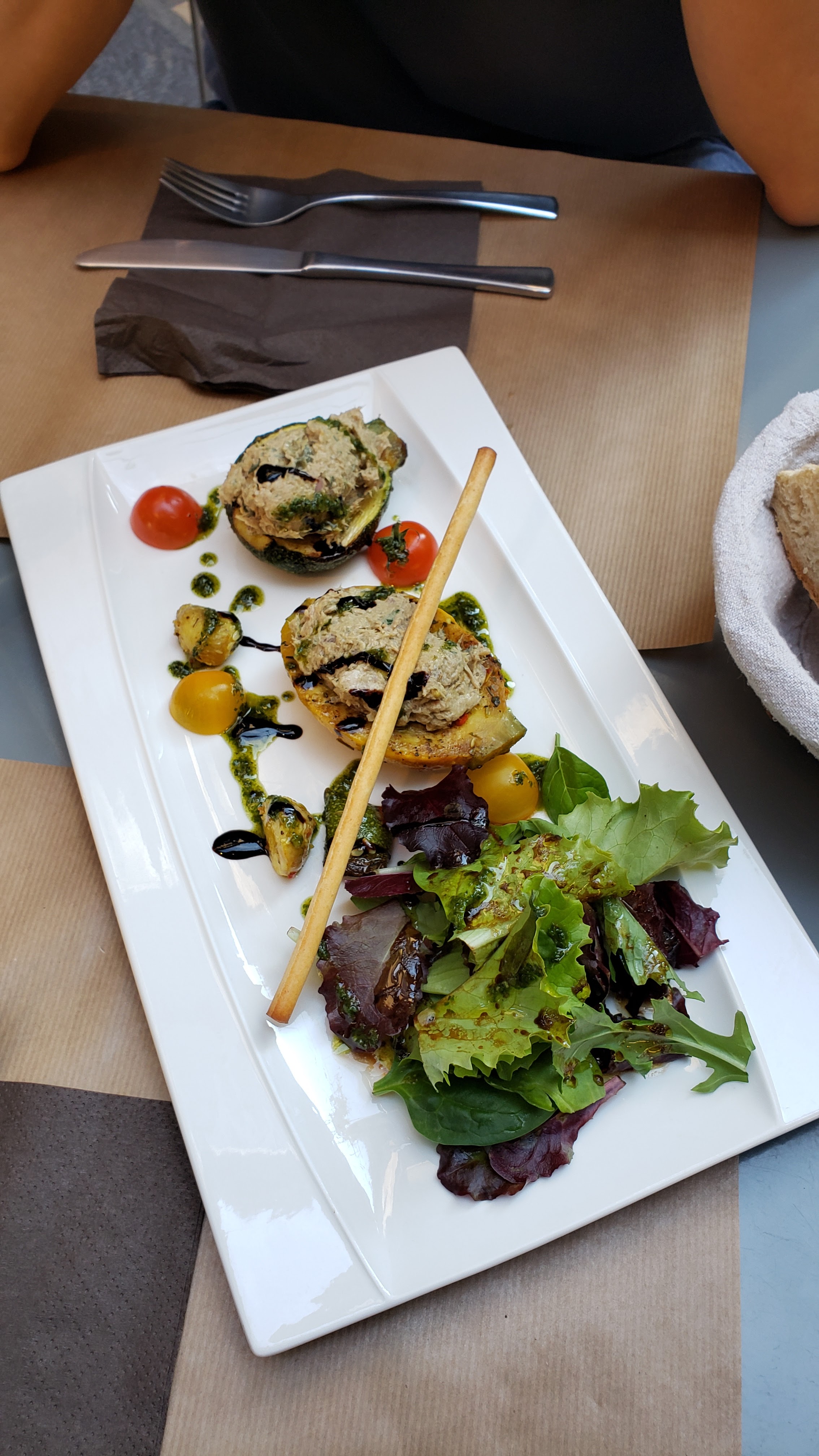 C'est l'un des rares restaurants de la ville à être ouvert le dimanche et je suis passé par hasard pour un déjeuner rapide. Mon conjoint et moi étions assis sans réservation, même si le restaurant s'est vite rempli! Nous nous sommes assis dehors à une table dans la jolie petite rue et avons profité de l'ombre du soleil. Nous voulions quelque chose de léger, nous avons donc commandé seulement 3 entrées : les légumes rôtis farcis, le tartare de thon et la tarte aux courgettes. Tous étaient si délicieux et frais, et nous étions facilement rassasiés car les portions étaient de taille raisonnable. Commandez un verre de vin rosé local, il fait vraiment mouche.