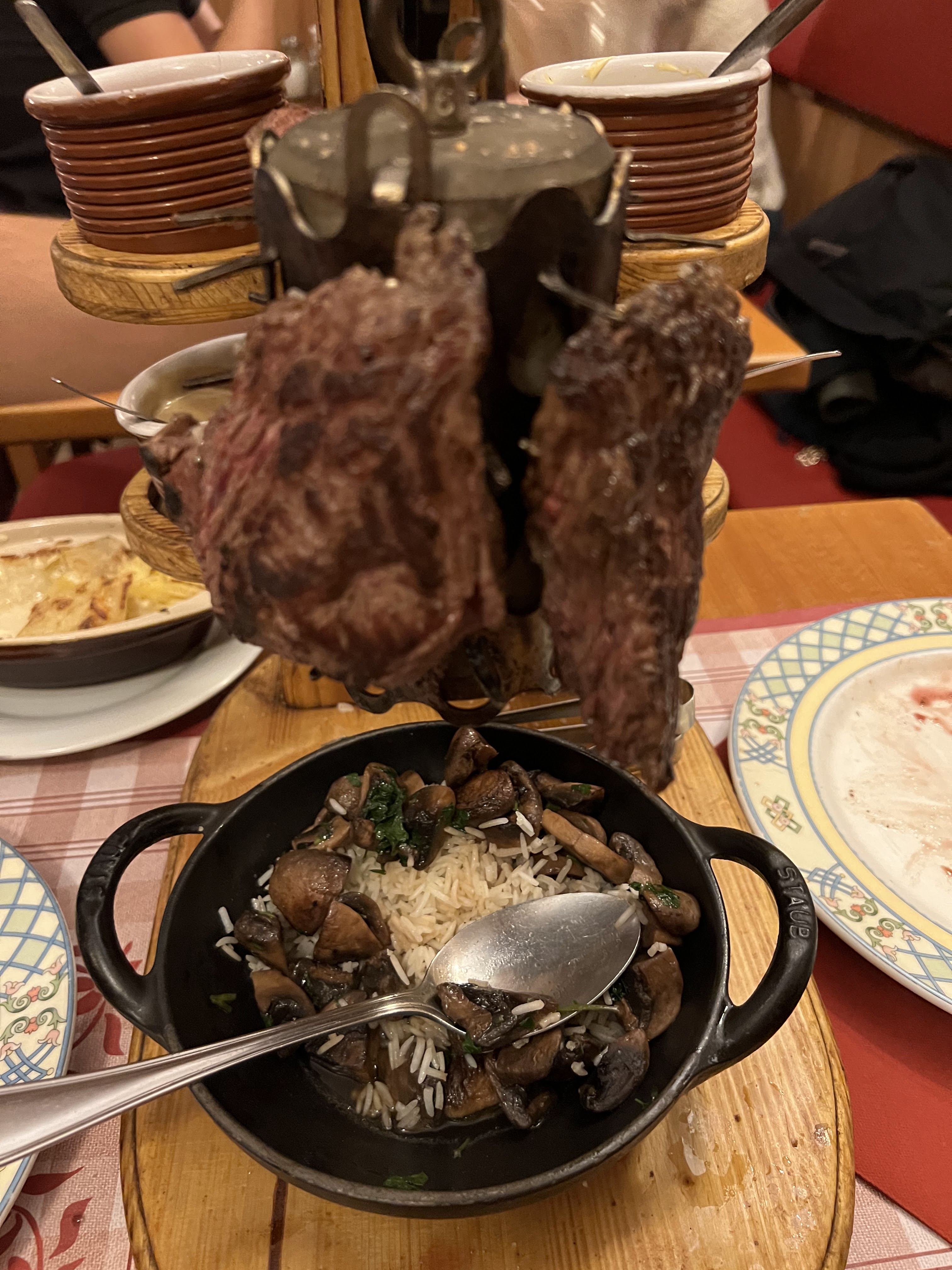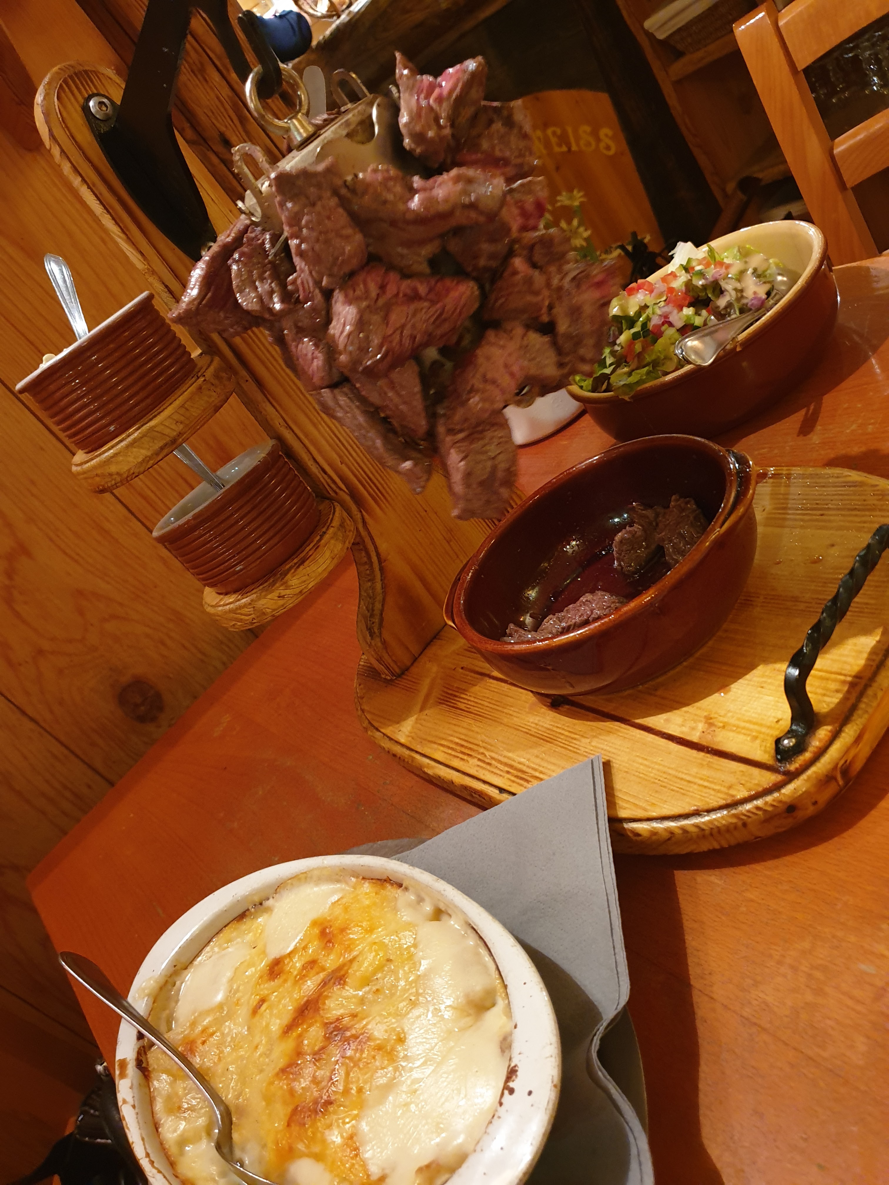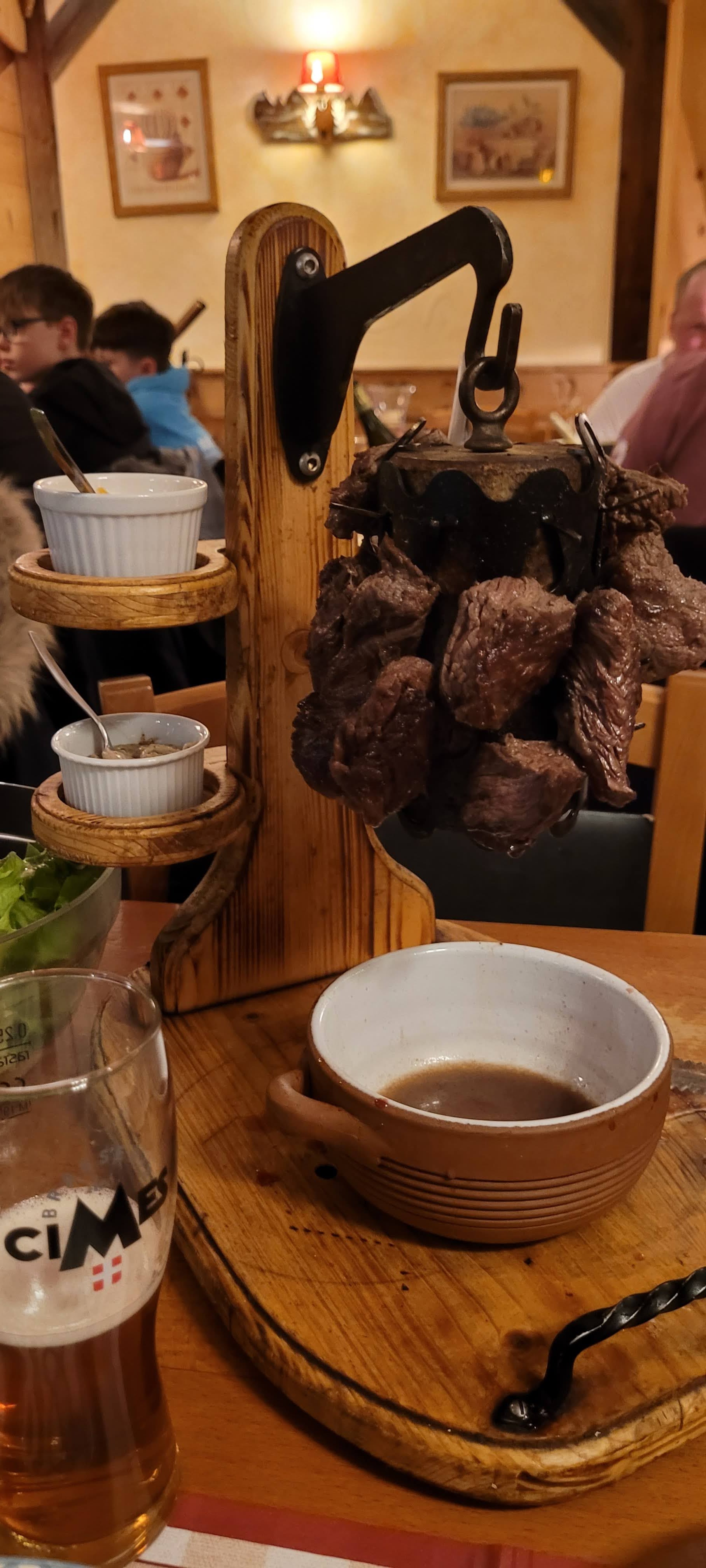 Restaurant typique avec une ambiance de montagne chaleureuse. Nous avons pris (comme à chaque fois) la potence de boeuf ! Un plat à partager qui vaut le détour avec une viande flambée au cognac, des sauces délicieuses, un gratin dauphinois et du riz au champignons. Toujours aussi bon !