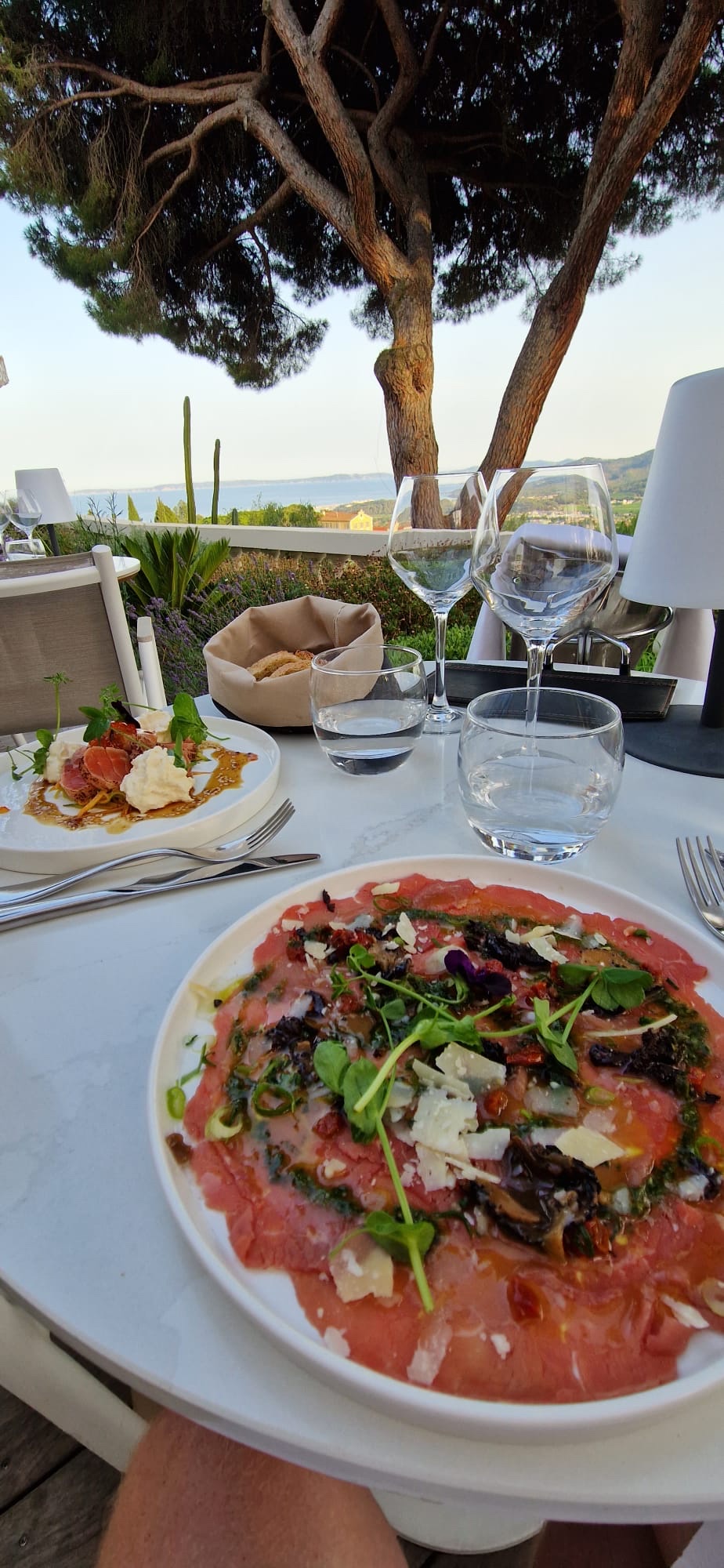 Soirée exquise dans un cadre magnifique avec une vue magnifique sur la baie de Bormes... Le repas est raffiné, exquis, vous régale les papilles... et la serveuse qui s'est occupé notre table, souriante et extrêmement avenante toute en délicatesse et humour... Vraiment un agréable moment !!!