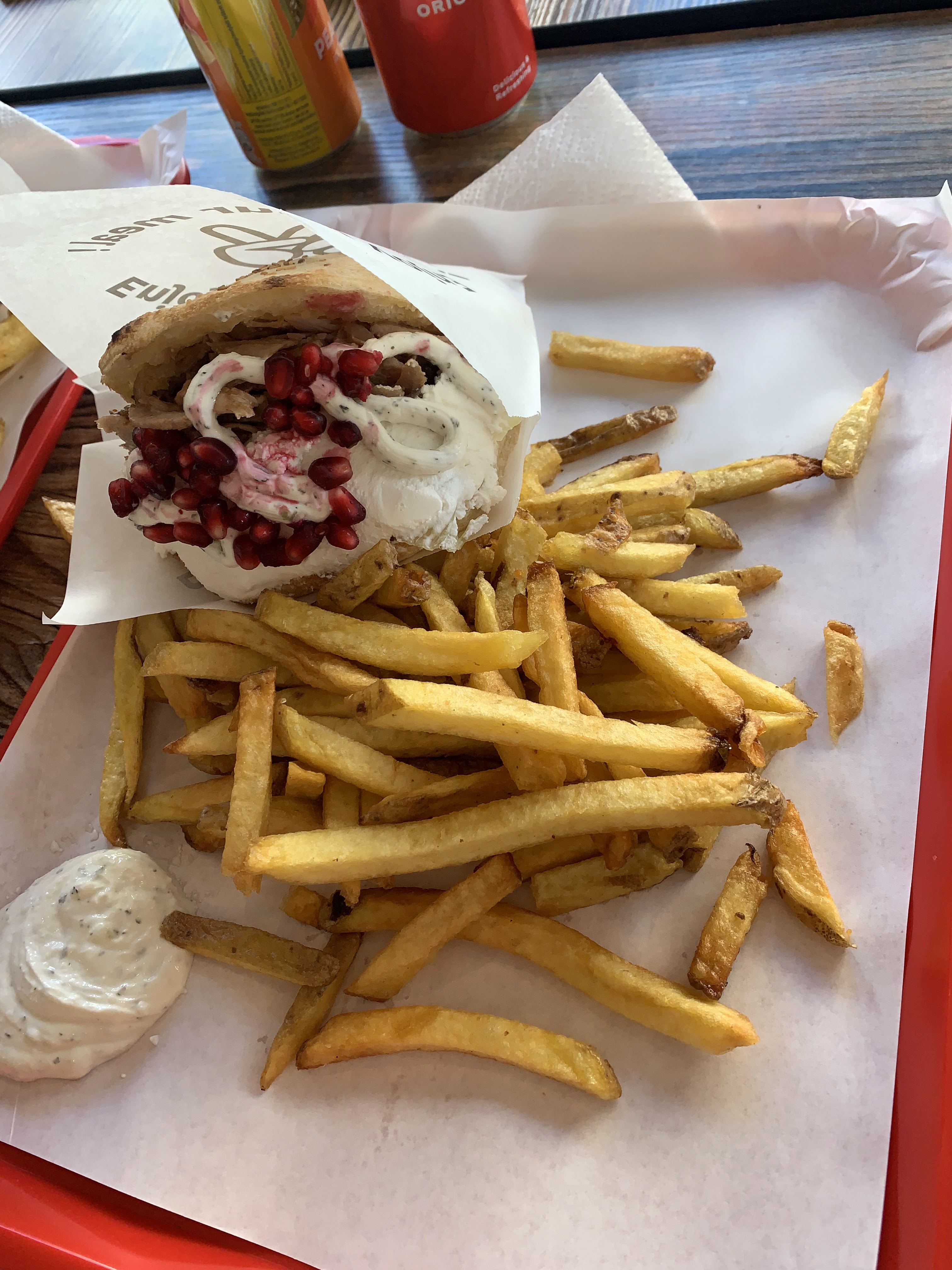 Grec servi froid, l’impression qu’il sortait du frigo. Beaucoup d’ognon, bcp de salade mais peu de viande, présence de grenade dans mon sandwich. Je viens pour manger d’la viande, pas pour une salade de fruit. Manquerait plus que je trouve une clémentine à côté des frittes. Je mets une étoile pour la canette fraîche.