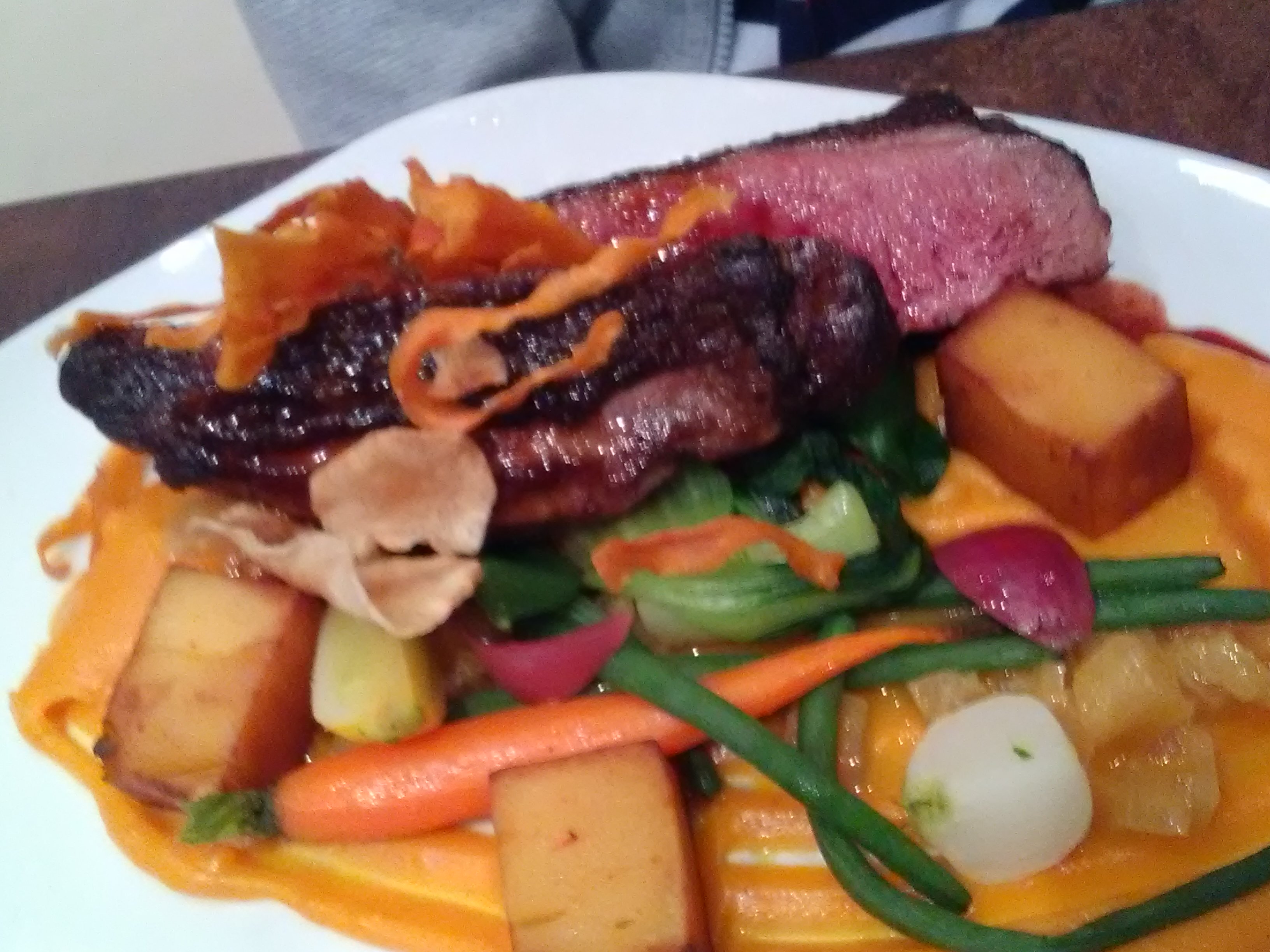 Nous avons déjà eu une meilleure expérience, mais les plats délicieux et le service excellent. La décoration n’a rien de spécial mais le restaurant est propre et les tables sont toujours prêtes à recevoir des clients ! Le magret de canard était un peu dur à manger et froid au bout de quelques minutes (peut être faudrait t’il le servir dans une assiette chaude ?), il manquait les couteaux à viande aussi… mais à part ça, la sauce au miel, et l’accompagnement de légumes avec la purée étaient vraiment excellents ! Le saumon en entrée et le moelleux aussi, rien à dire ;) ! Le soufflé Grand Mariner n’avait pas de Grand Marnier mais de la glace vanille ?