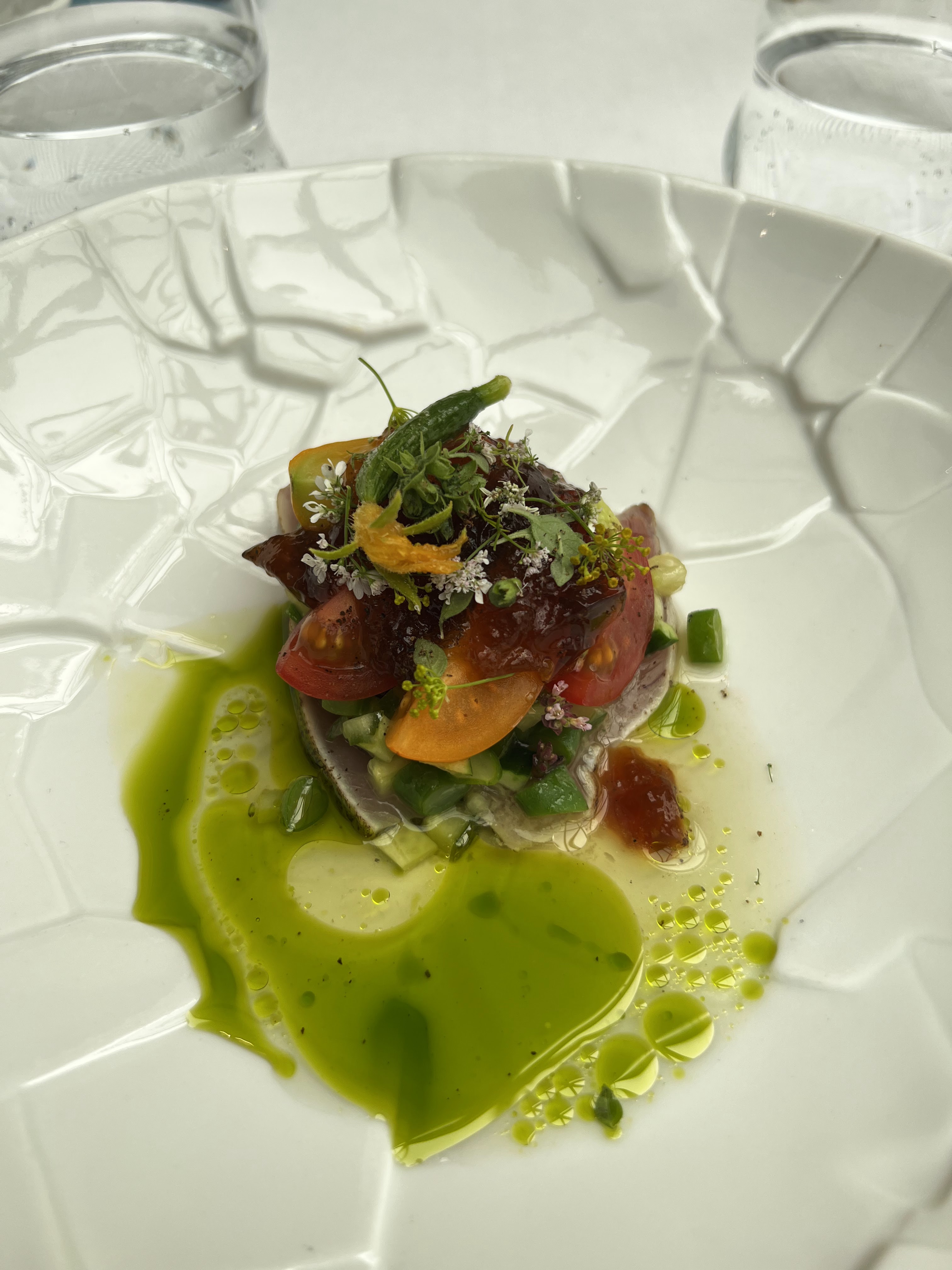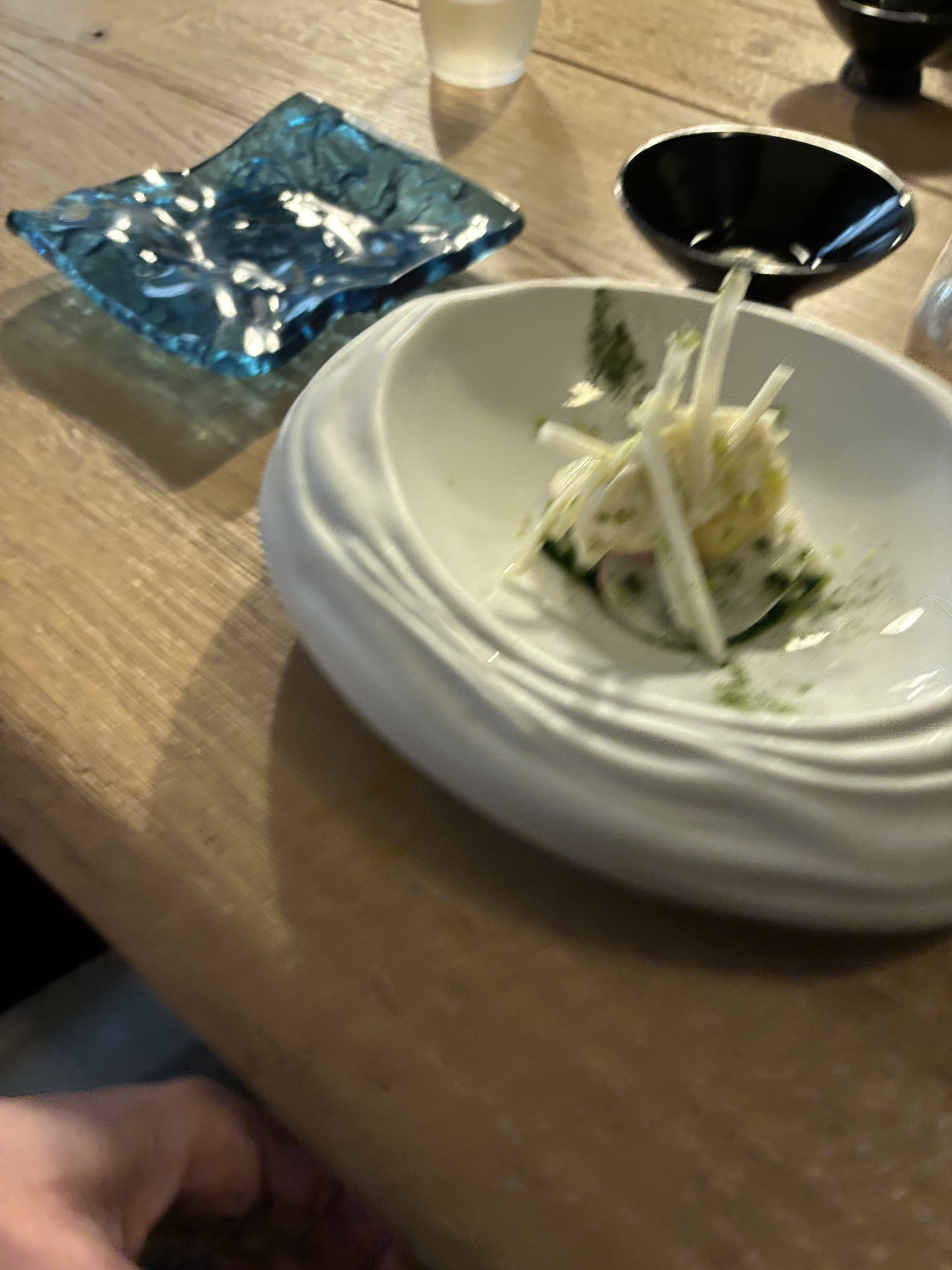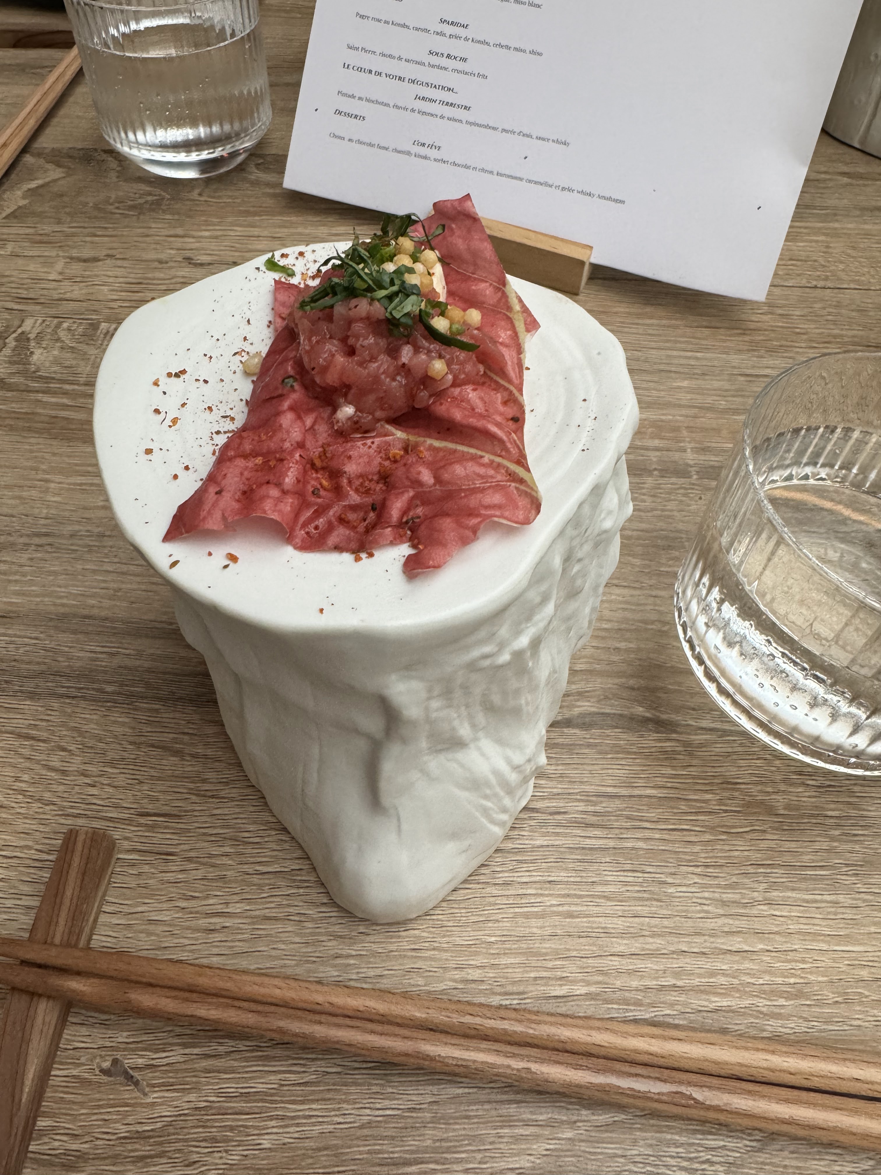 Accueil parfait, ambiance très chic Nous n'avons malheureusement pas été transporté par la cuisine Beaucoup de plat sans grand intérêt et pour moi à part le tataki il n'y avait rien de ouaou ... les quantités (pour le plat ) sont vraiments petites et on reste sur sa faim ... On aurait pu aller manger une glace après 😅 On nous l'avait fortement recommandé mais apparemment entre temps le chef a changé 😢