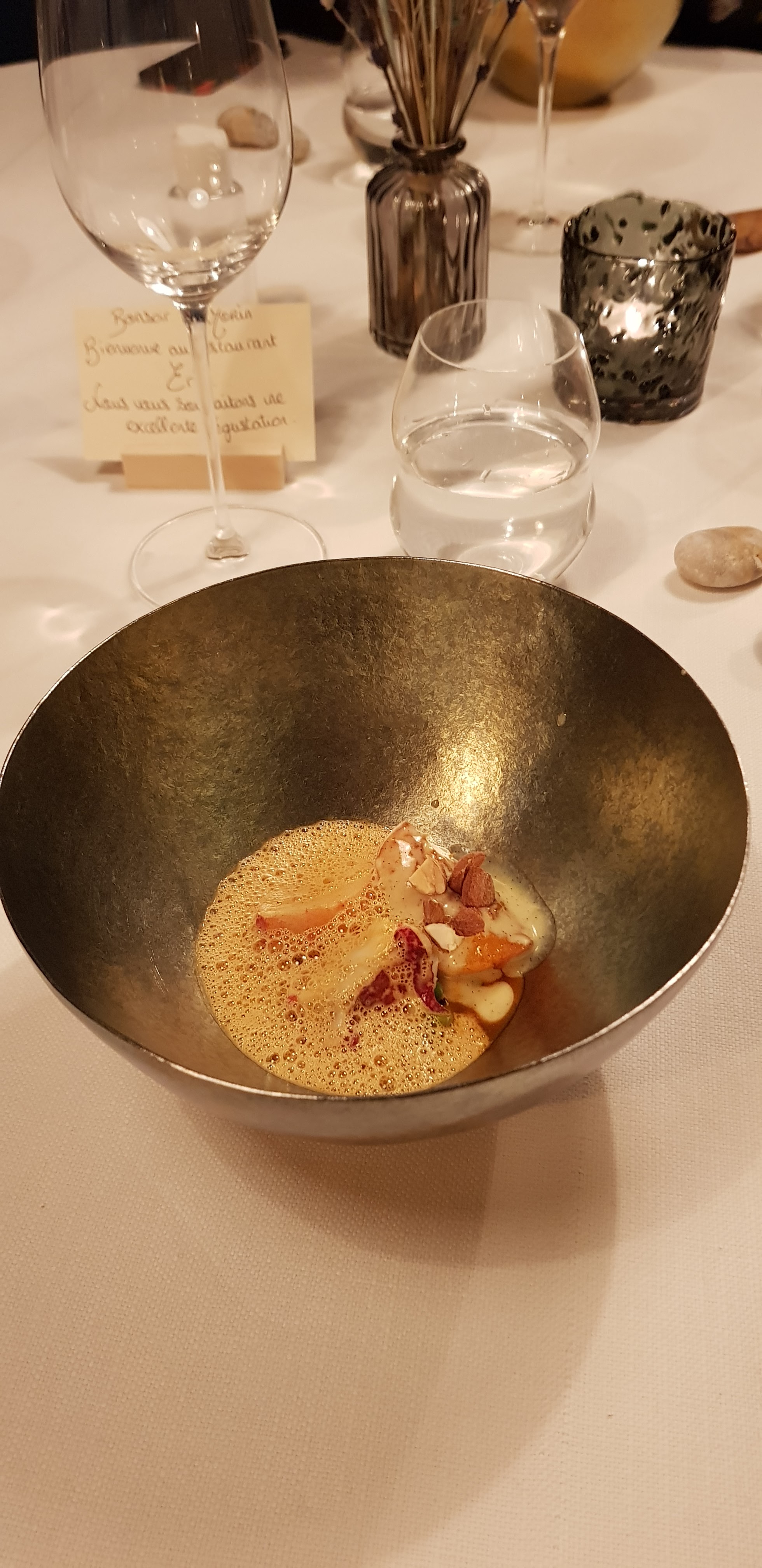 Que dire ? Si la perfection existe dans ce monde j’ai eu la chance de la vivre hier soir ! Surprenant, d’une grande finesse, saveurs étonnantes et aériennes bref UN PARADIS ! Merci pour cet exceptionnel et inoubliable dîner !