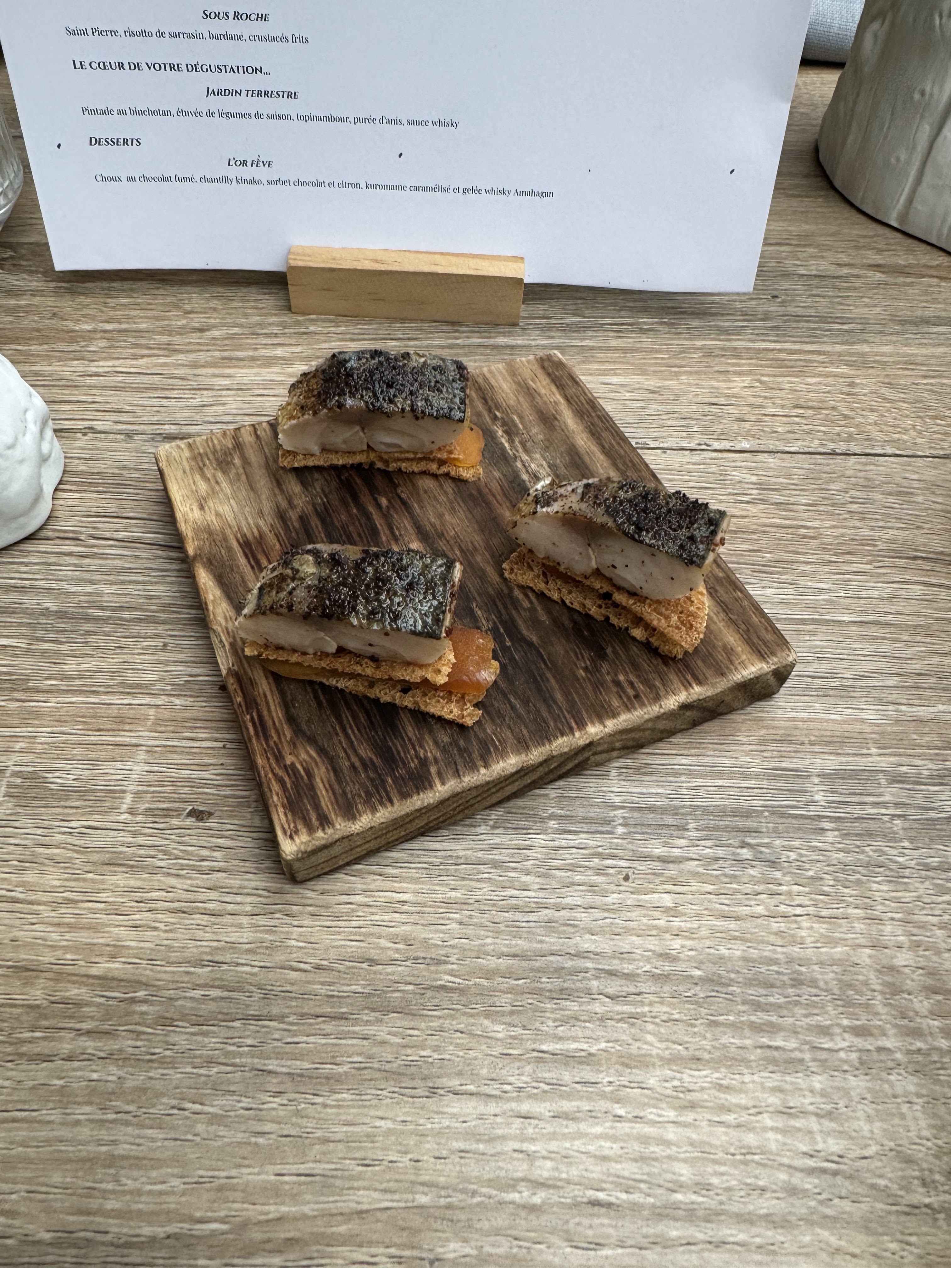 Chaque bouchée est délicieuse et nous transporte de la France au Japon … bravo pour cette réussite ! Seul bémol : verres de vin très peu remplis ( dommage vu le prix …. )