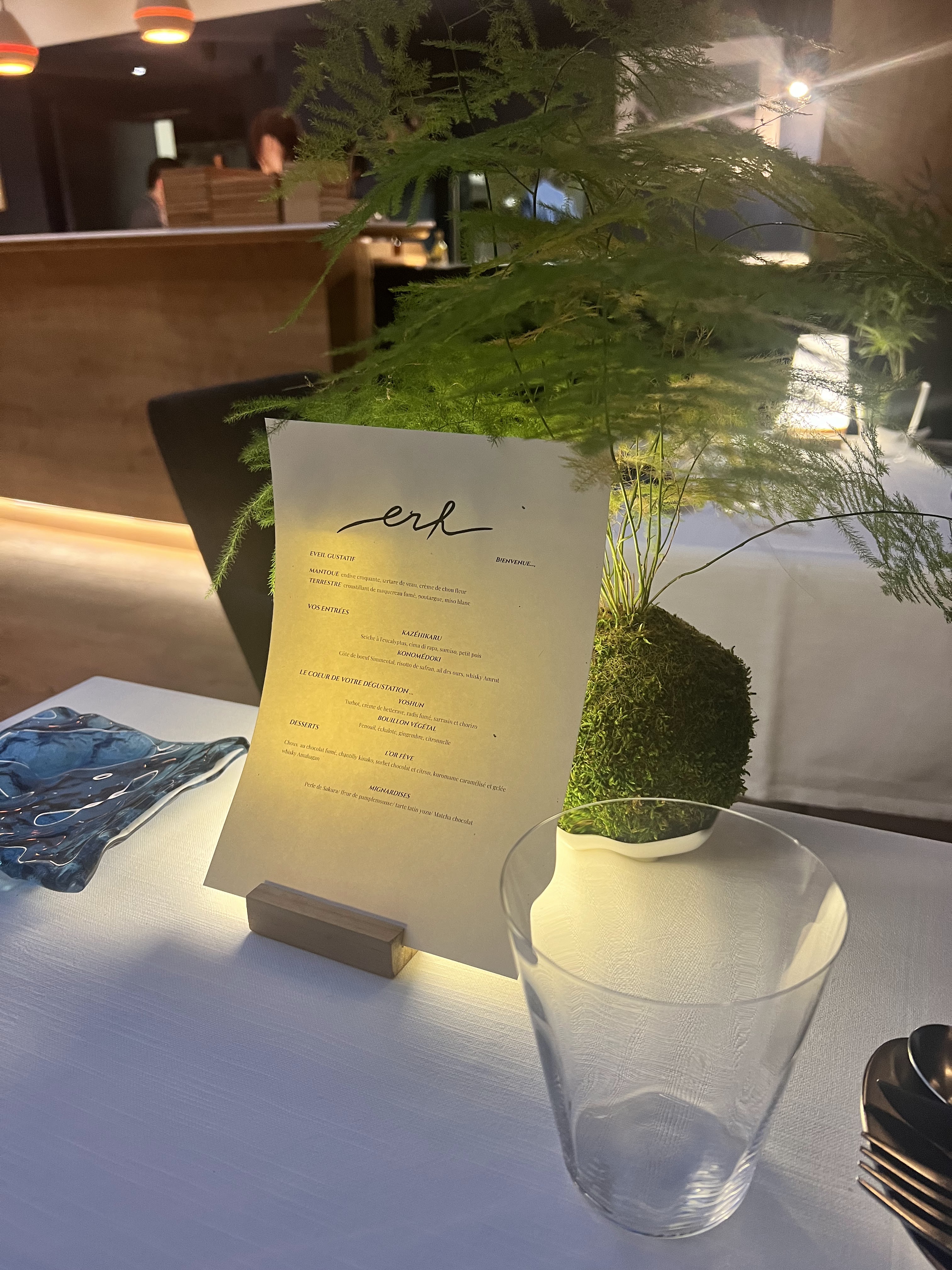 ERH ce sont les acronymes pour Eau, Riz et Homme ce sont les 3 ingrédients pour faire du saké. Ce resto est donc spécialisé dans le saké qui est servis comme dans un verre de vin. Le notes asiatiques sont retrouvés tout au long du diner La décoration du restaurant est sobre chic et minimaliste à la japonaise. Nous avons beaucoup aimé l’experience de venir dîner a ERH. J’ai trouvé que certains plats etaient assez salé et souvent assez gras donc un un peu lourd mais tout dépend des préférences. Nous sommes ressortis et nous n’avions plus du tout faim pour le coup coup de coeur pour la seiche qui est aliment assez inhabituelle et donc une bonne surprise en bouche. Merci à l’équipe qui a ete au petit soin pour nous ce soir en service