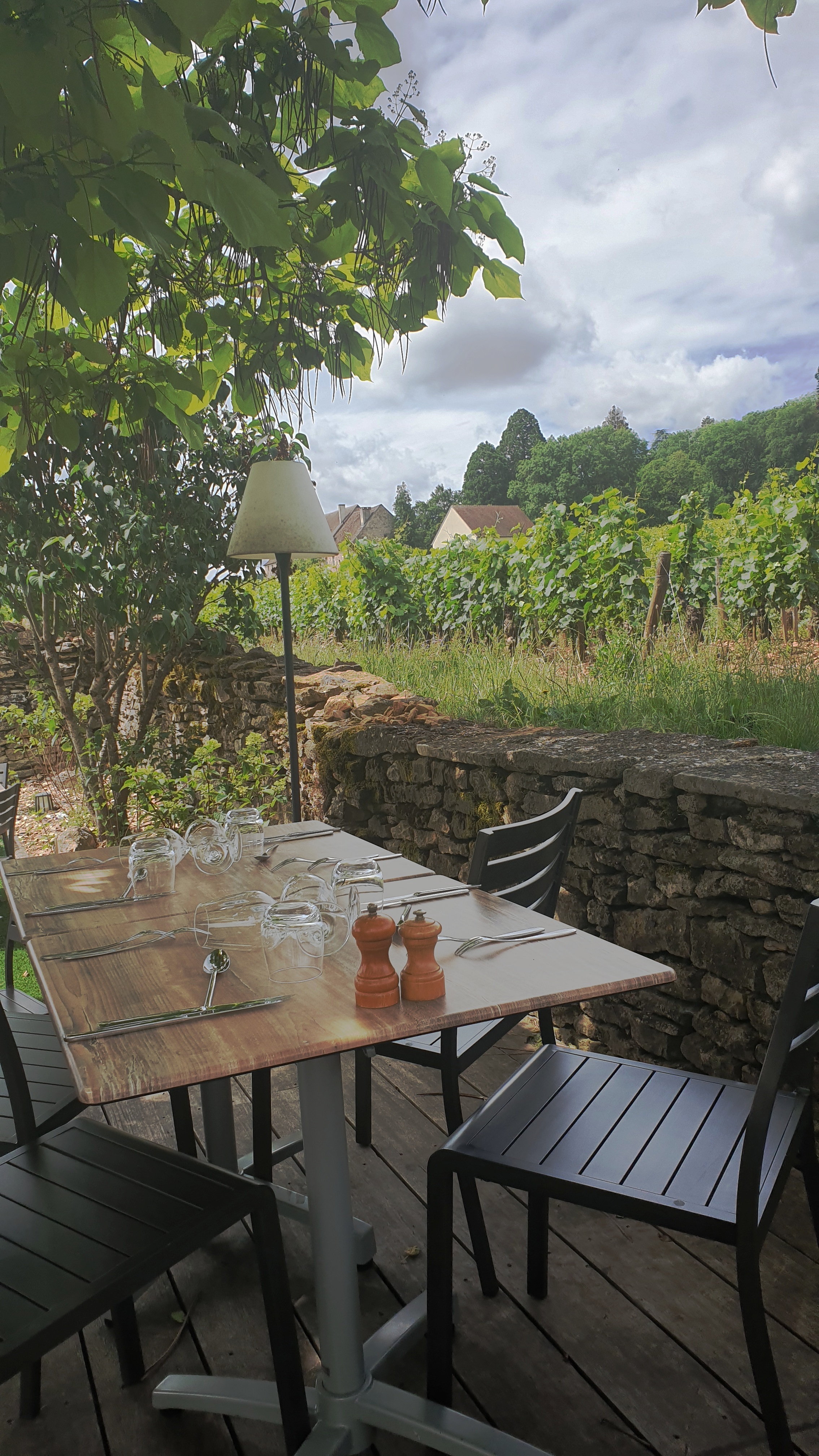 Très bien, très belle terrasse ombragée à côté de la vigne. Nous étions invités et tout était excellent : jambon persillé, poulet en sauce, fromages, et poirier avec champagne 2009, Rully et Pommard....