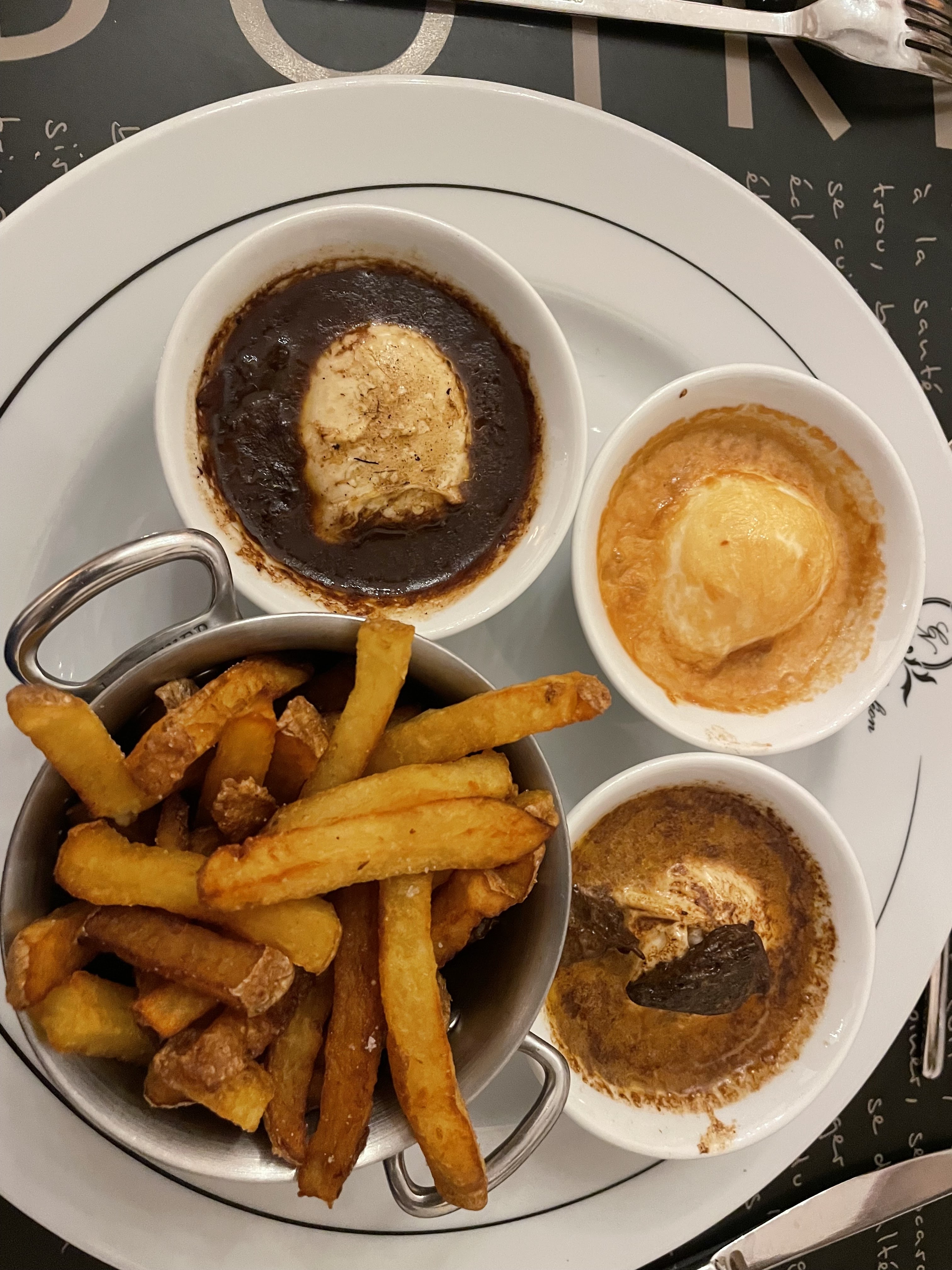 J'ai mangé la trilogie d'oeuf meurette avec des frites, dommage il manquait des croûtons et pas de grosse cuillère