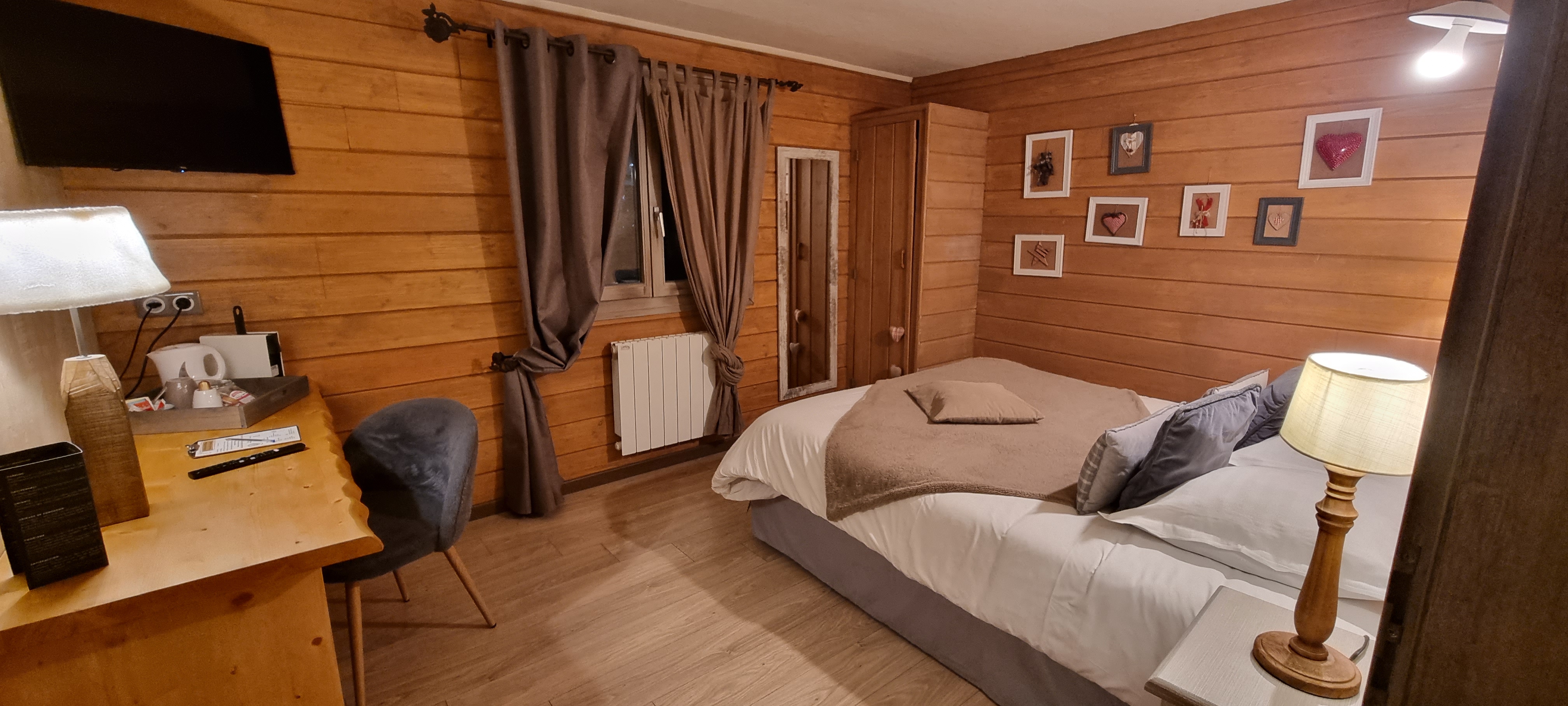 Très jolie chambre, chaleureuse, beaucoup de bois. Propreté et bonne qualité de la literie. Personnel agréable et professionnel. On a également apprécié le restaurant, plats savoureux, maison et service de qualité.