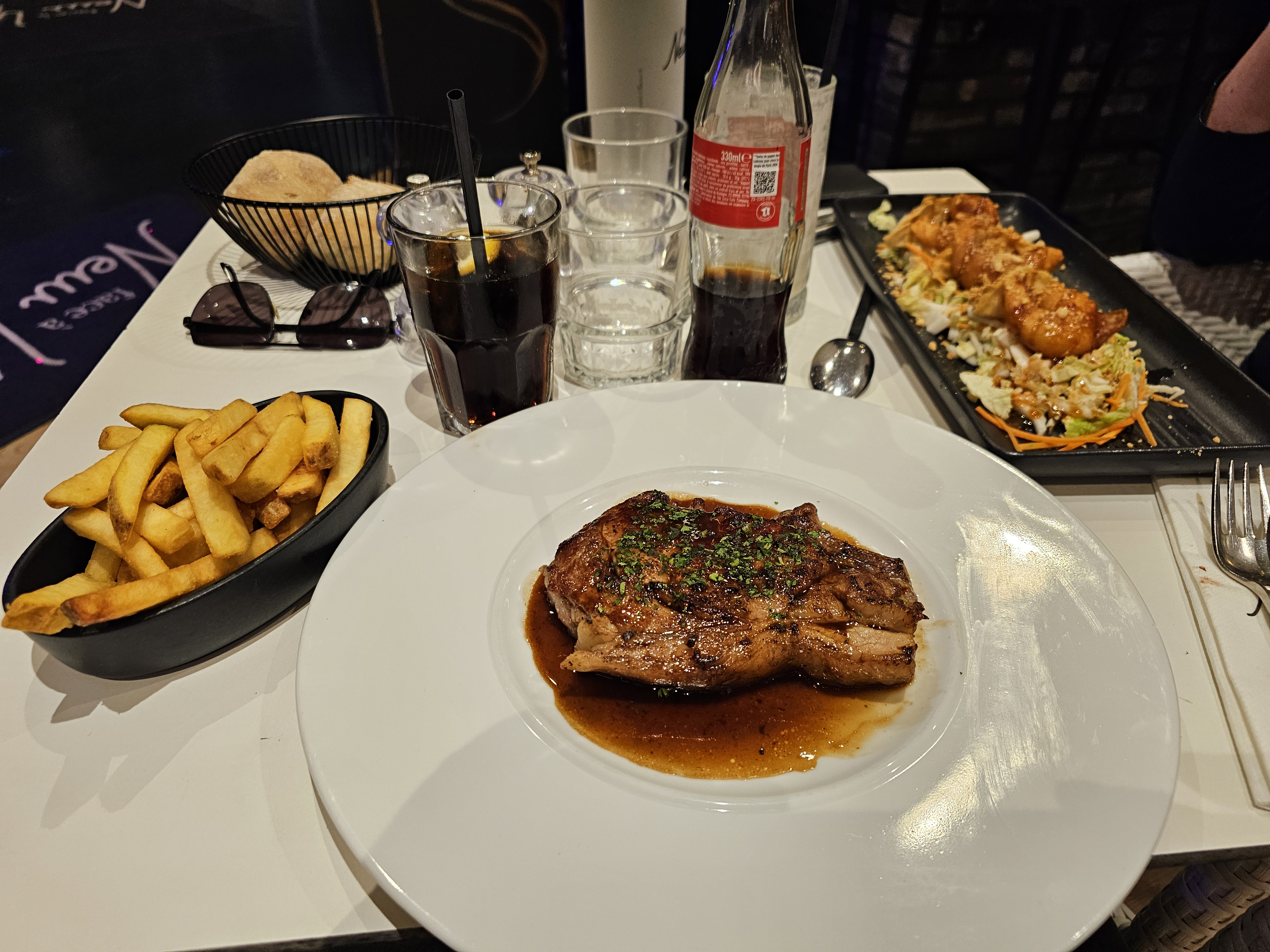 Bon restaurant, on mange bien les produits sont bons, cependant l'organisation est déplorable. 5 serveurs différents pour une table. Des plats qui arrivent froid, la cuisson de la viande pas comme demandé. Le plat revient sans l'assaisonnement. La bouteille de vin qui arrive bien tard une fois les plats servis. Deux bouteilles de coca pour deux whisky. Trois pauvres légumes avec le poisson. Bref bon restaurant mais il y a sûrement mieux. Le pauvre serveur très sympa qui fait ce qu'il peut.