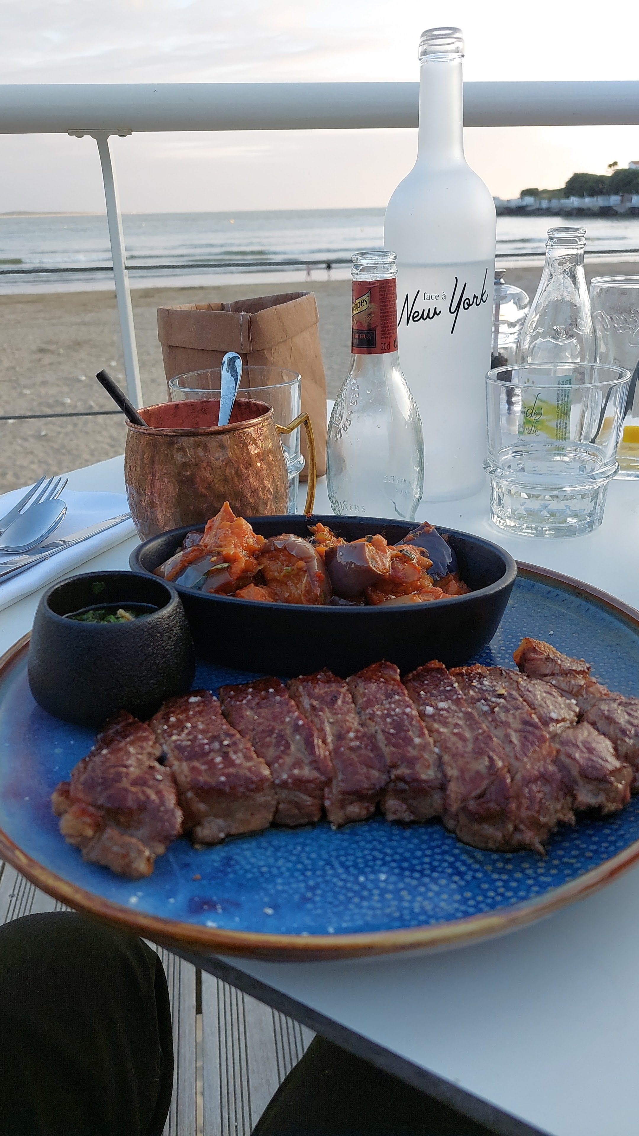 La terrasse face à la mer et donc face à New York 😎. Le serveur nous accompagne jusqu'à notre place, prise de commande rapide ainsi que le service. Ensuite on prend son temps face au soleil. Animation proche avec des boulistes.