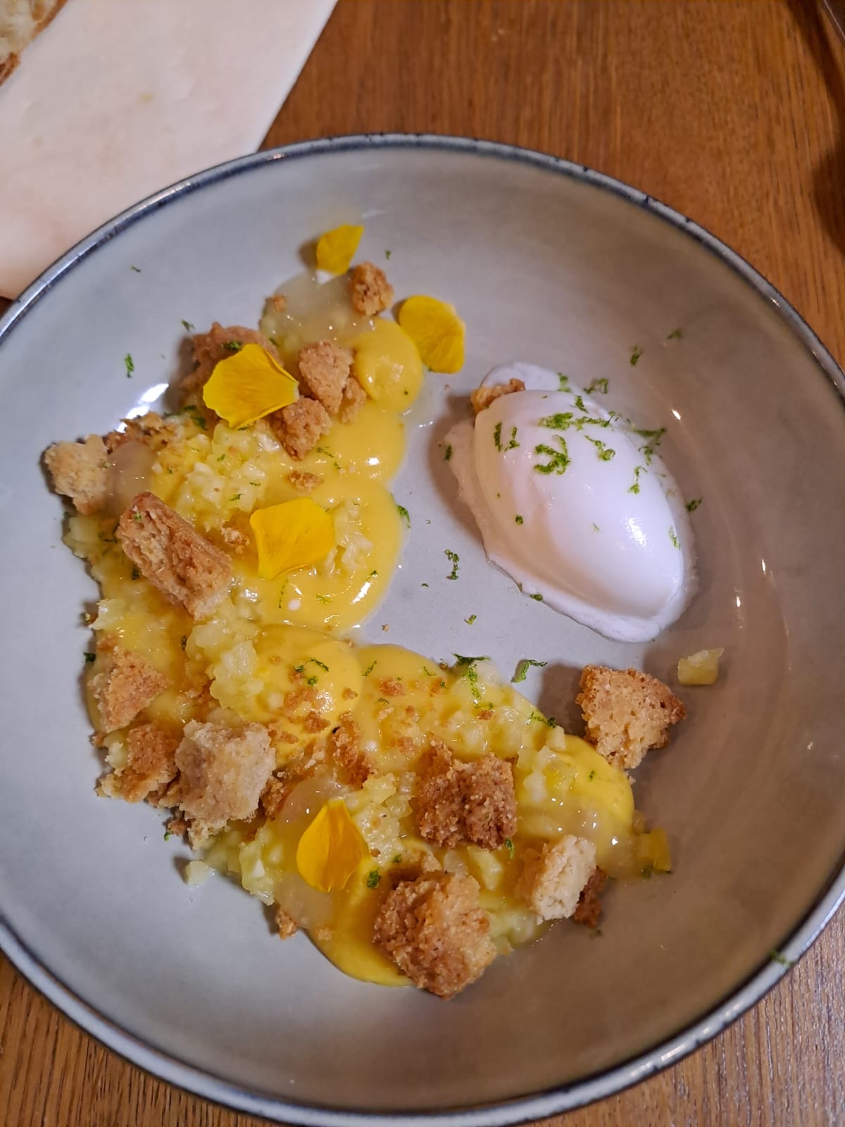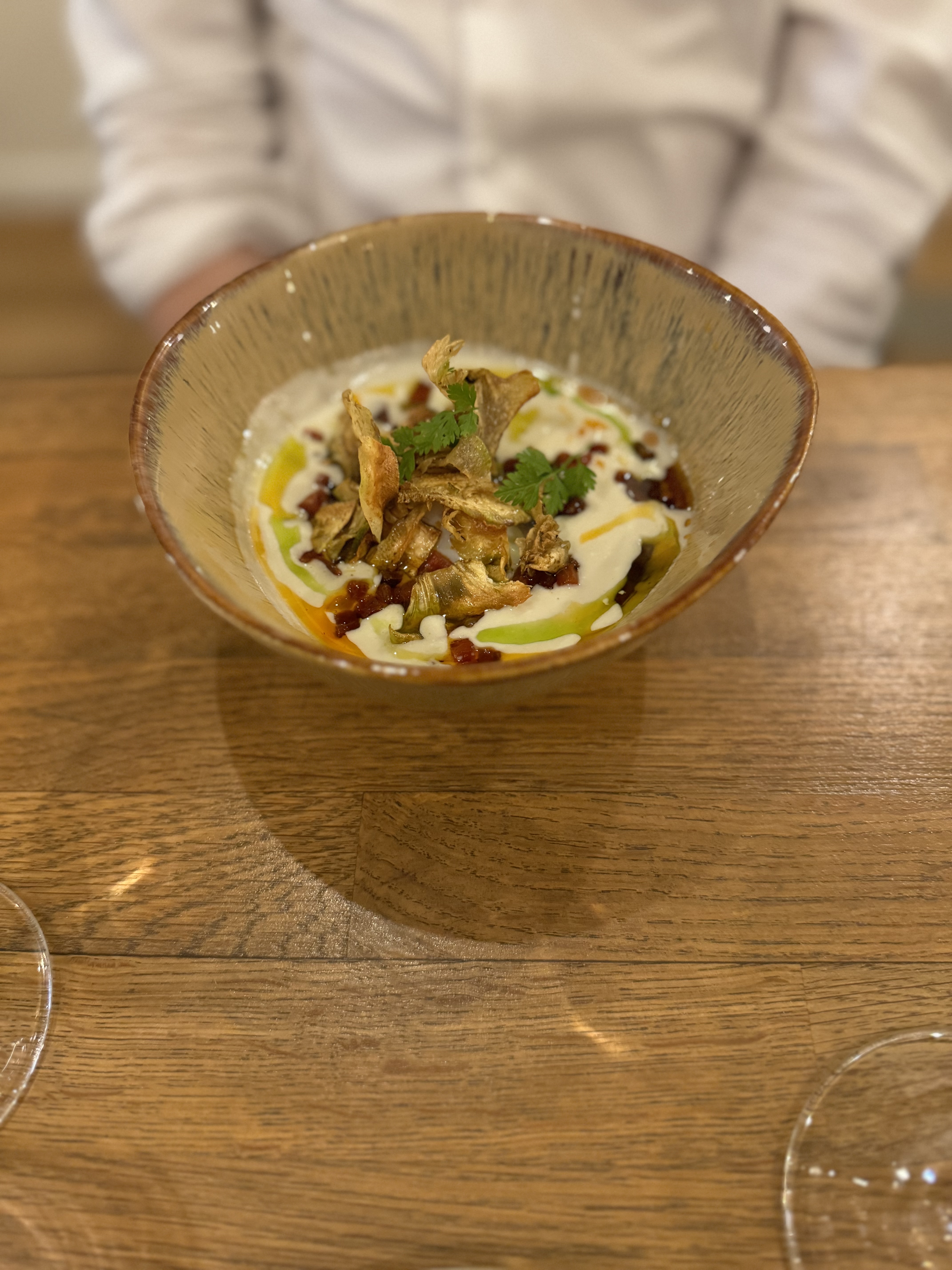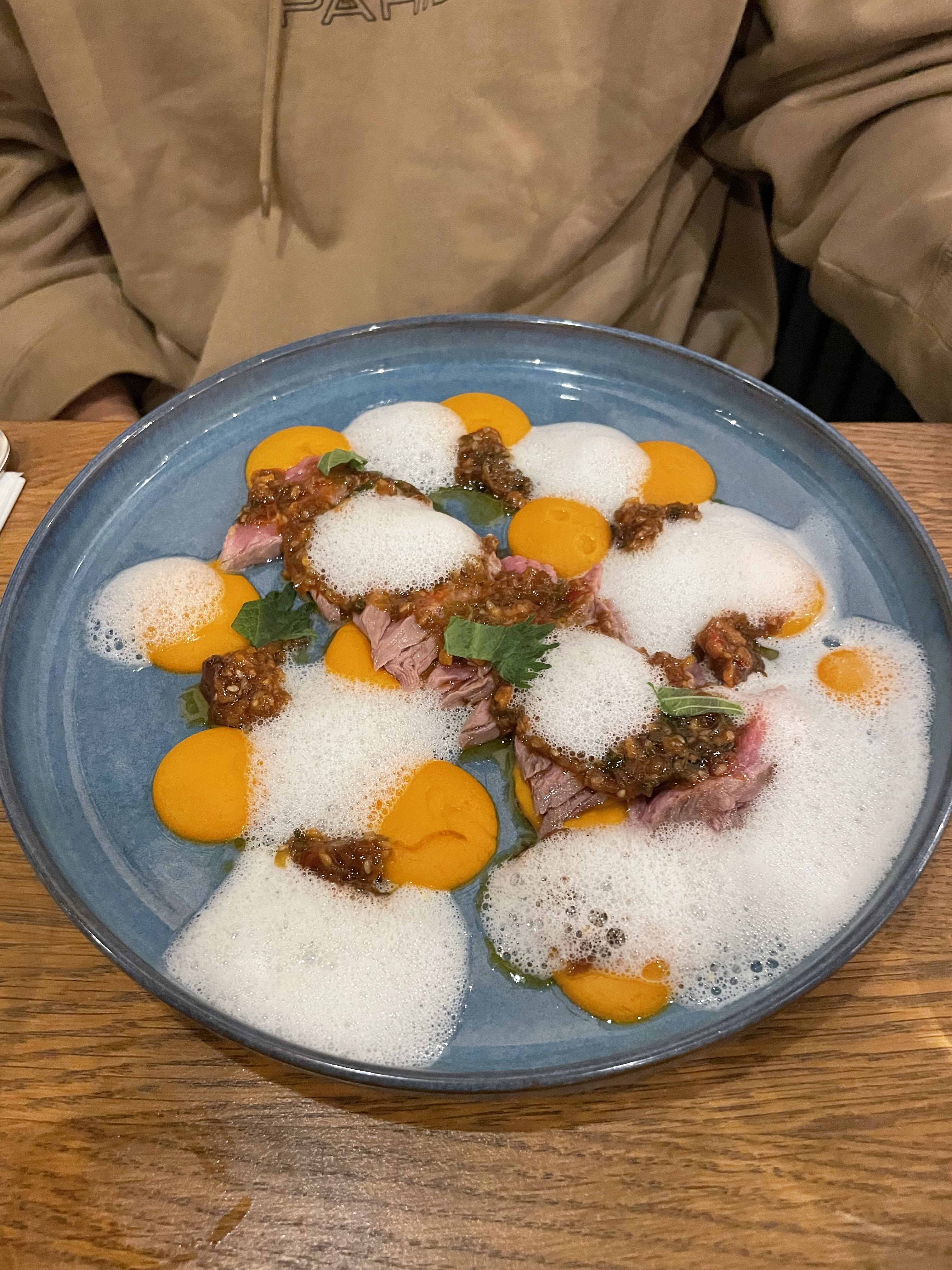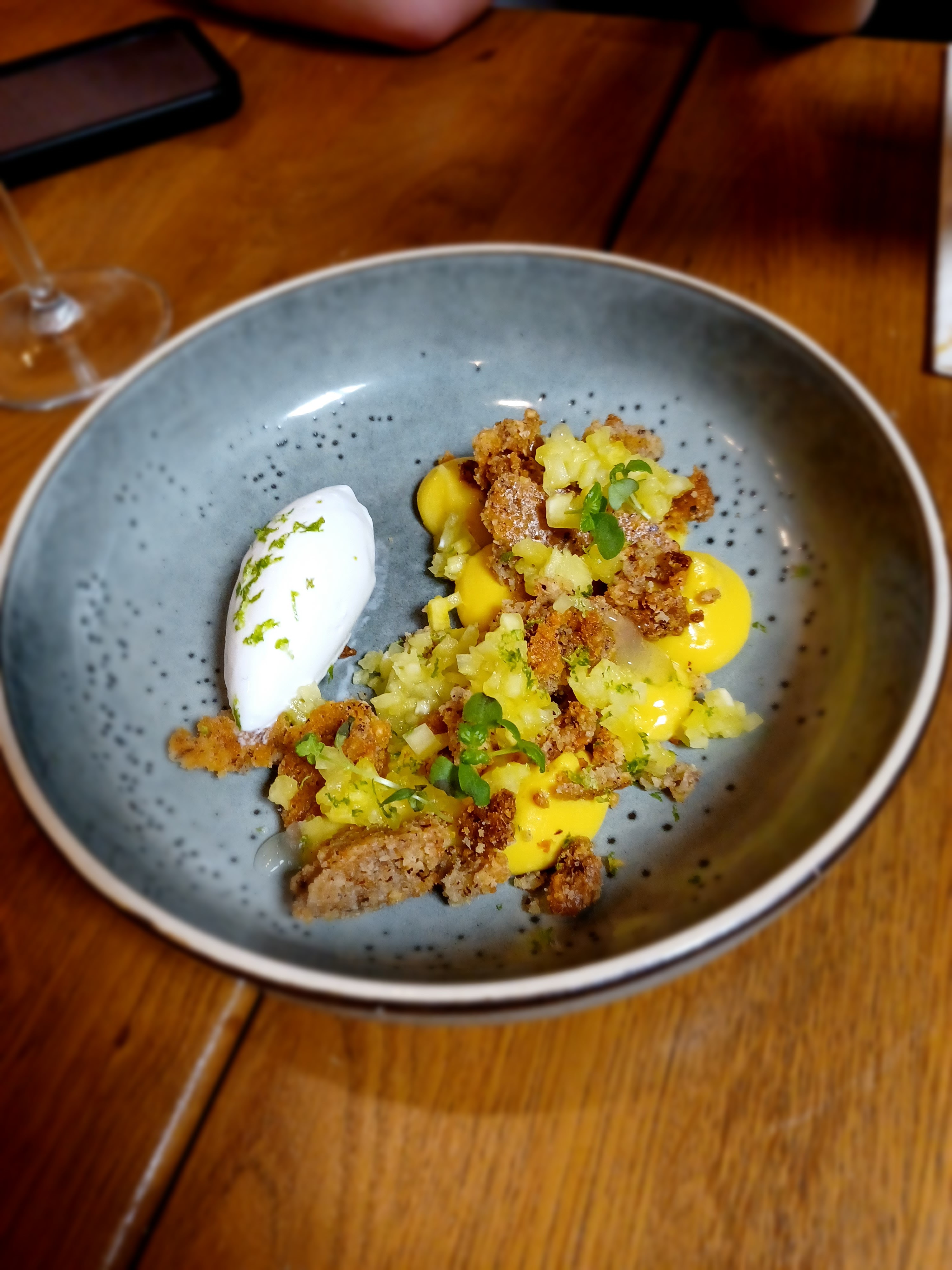 Le service est impeccable, la décoration très agréable, les plats absolument délicieux ! Merci pour cette expérience 🙏🫶 J’ai commencé par un poulet croustillant et son aïoli, puis j’ai été conquise par une canette et sa purée de carotte avec leur sauce aux agrumes 🤤😍 la crème à la verveine et tout ce qui allait avec pour le dessert étaient également exceptionnels ! Il faut aussi que je parle du pain et du beurre au sésame, mais que dire ? Miam ☺️ L’attention des mignardises de début et de fin (rillettes de poisson et gel citron sur un sablé au parmesan 😋 puis madeleine aux agrumes) était très appréciable, quoique la madeleine était un poil sèche 🫣
