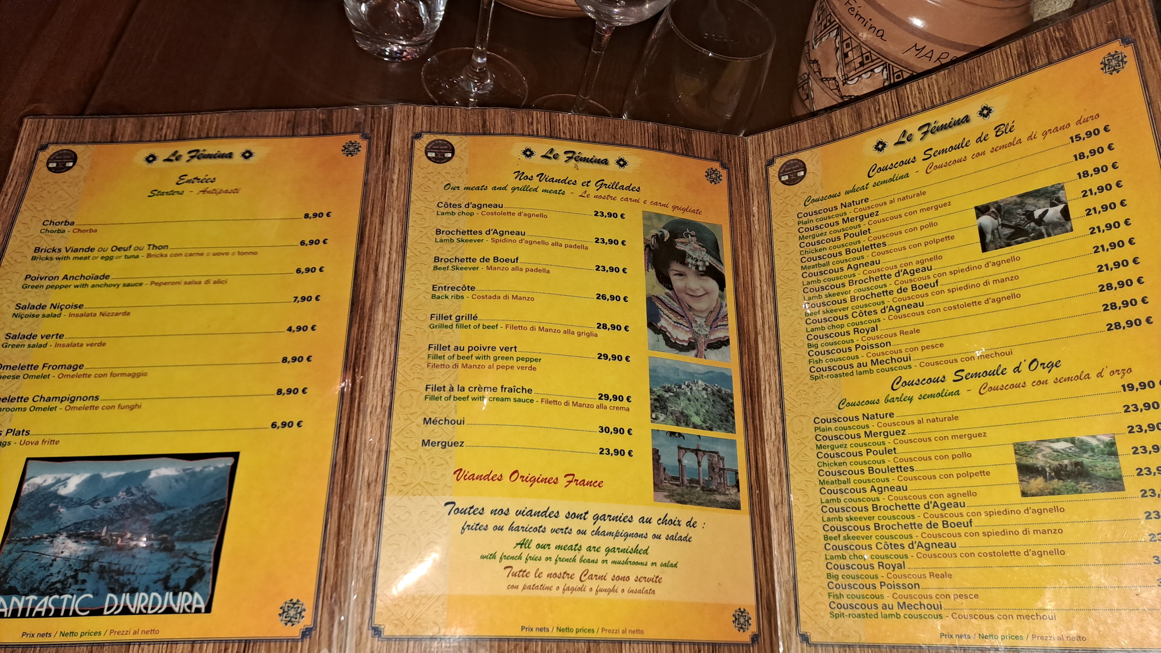Une seule chose à dire : Restaurant surcôté : très cher pour un couscous médiocre. On nous sert la semoule comme à la cantine, sans nous laisser le plat sur la table...infantilisant. Mon amie a pris une brochette avec accompagnement salade... 24,90 €. Nous faisons une remarque sur le prix excessif pour 1 brochette, réponse désagréable du patron : vos n'avez pas lu la carte avant de commander. L'argument de la cherté, c'est de l'agneau de Sisteron..cela fait quand même cher la simple brochette. On a goûté, on n'a pas aimé, on ne recommande pas. A quelques pas de là, vous aurez de meilleurs couscous beaucoup moins cher.