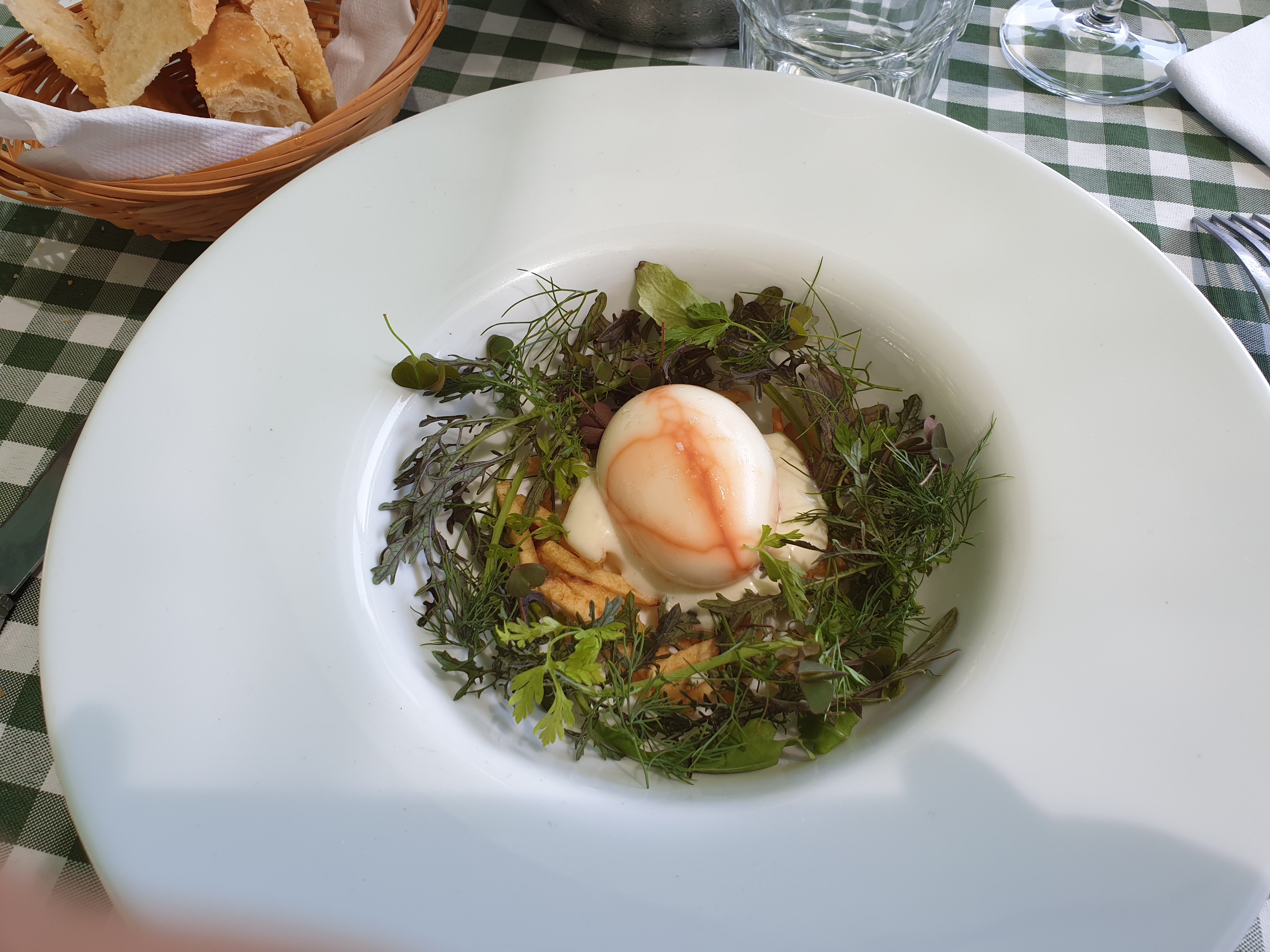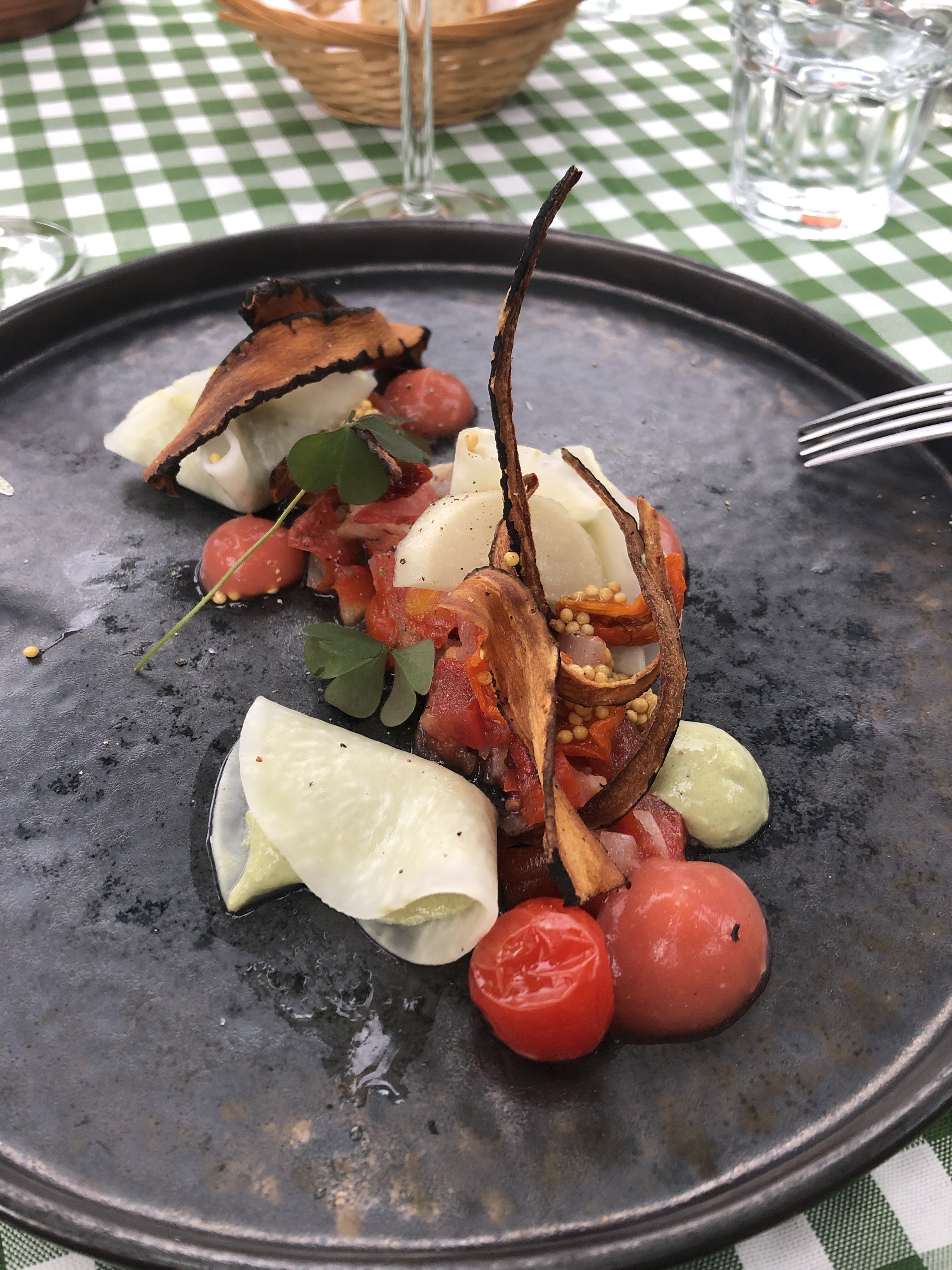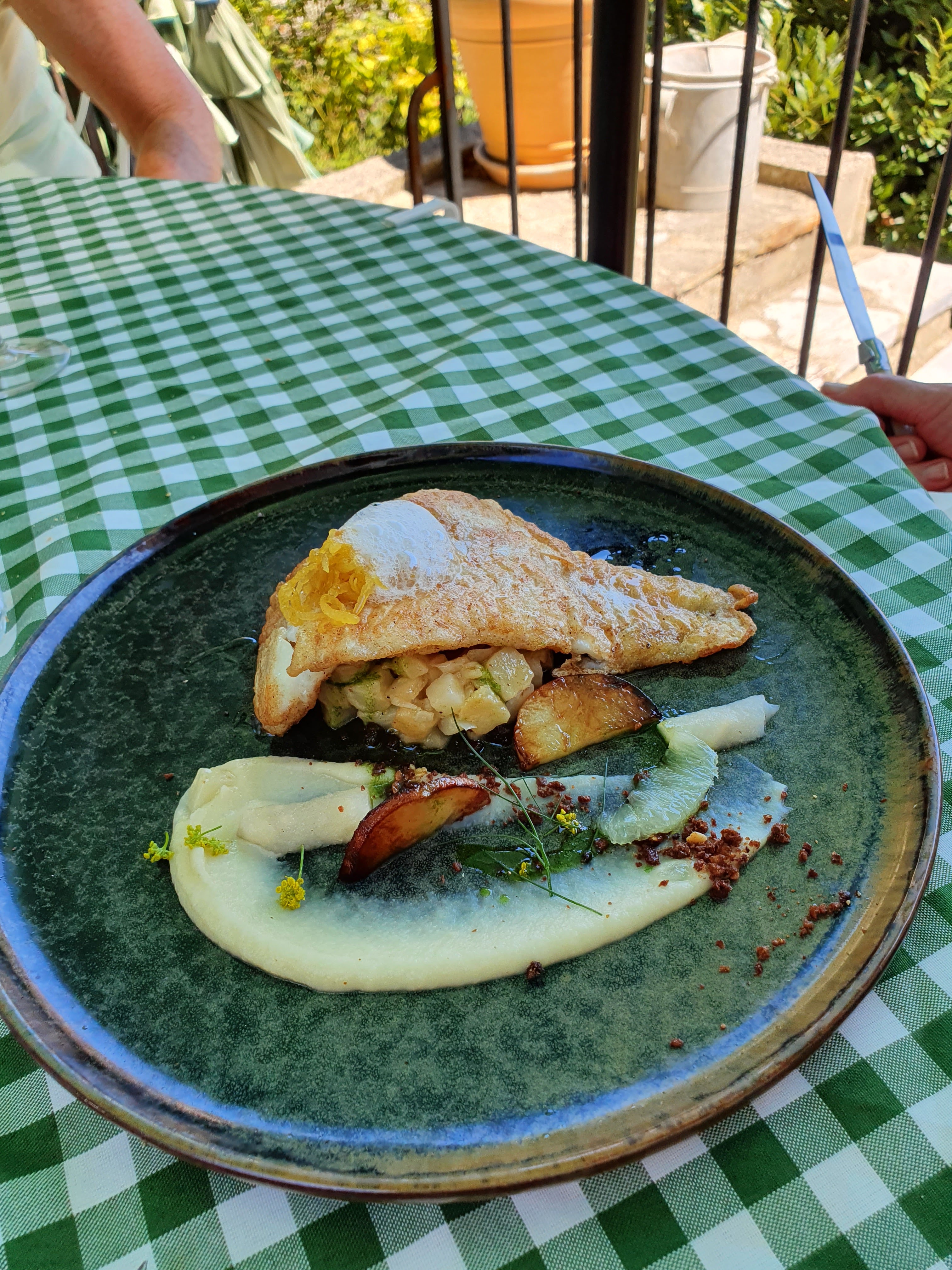 Mangez simplement un morceau après une visite dans cette ville médiévale endormie avec son pont spécial. Très agréablement surpris et heureusement il restait encore une place disponible même si nous n'avions pas réservé. Menu du jour choisi en association avec une belle bouteille de chardonnay. Super! Tout est frais, joliment préparé et parfaitement parfumé. Cuisine ouverte et un chef que l'on voit se promener physiquement plusieurs fois dans le potager adjacent pour récupérer quelques ingrédients. Merci pour ce délicieux déjeuner.