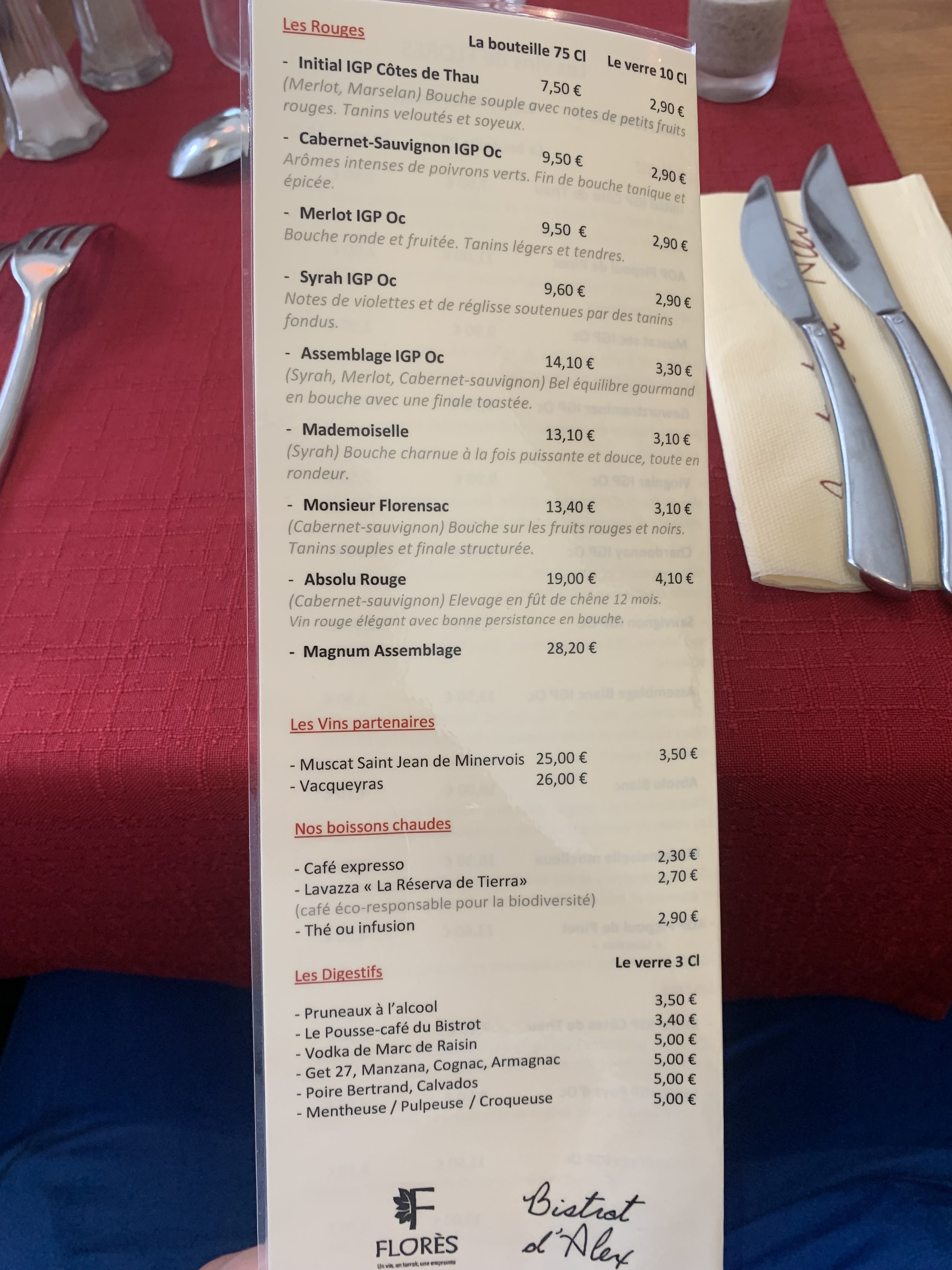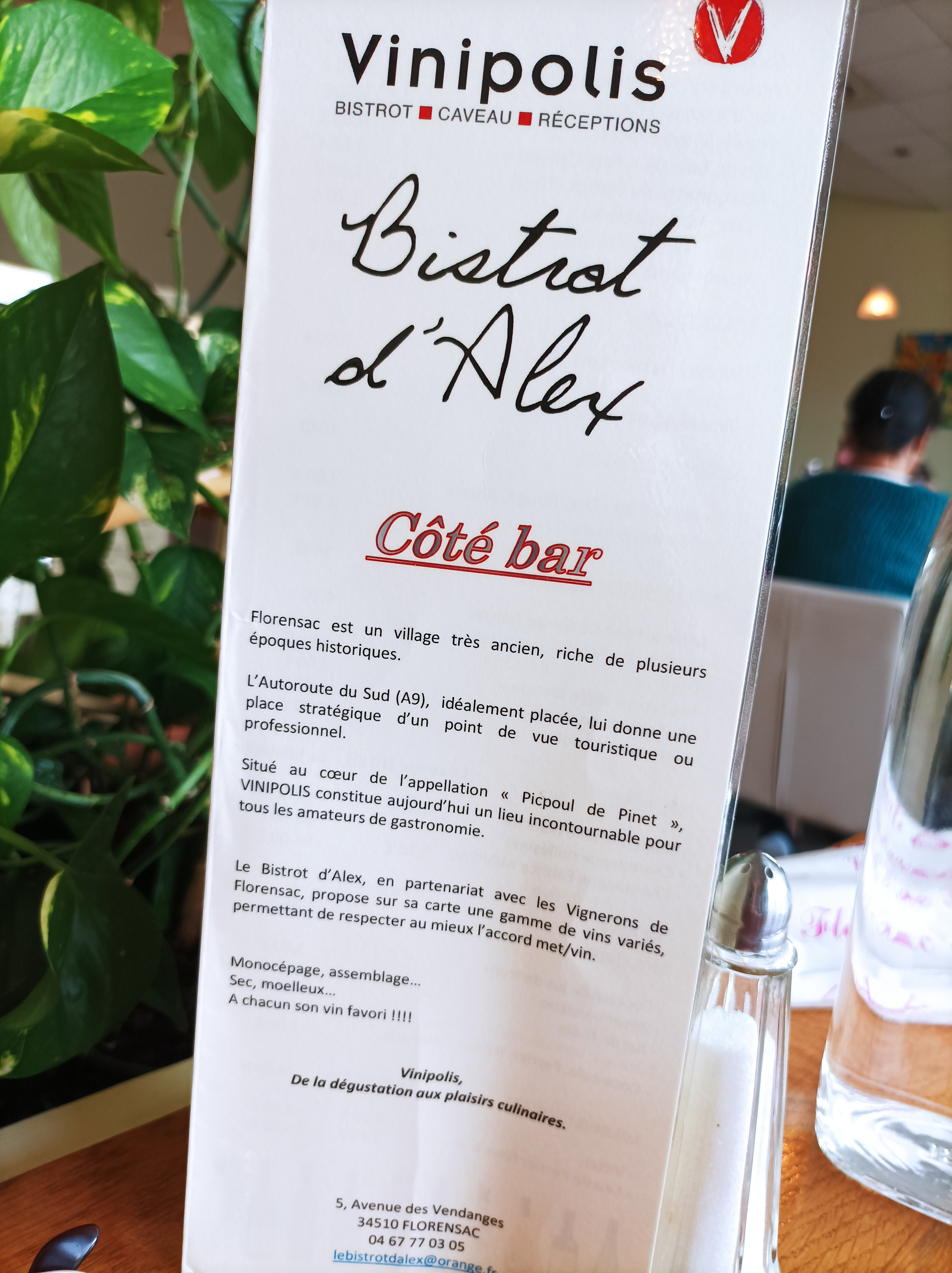 Acceuil parfait . 🍽Carte originale et très variées. Table excellente. 🍷Carte des vins sans commentaire le bistrot d'Alex est juste à côté de la cave de florensac donc belle carte. 👍Très bon rapport qualité prix. ⛾Bon café 📄Menu à 23 euros ou 28 euros. Ps: si il fallait vraiment trouver un point négatif la qualité de la cuisine mérite une déco de salle plus sympa ainsi que plus de convivialité entre les tables. Mais ils sont top en cuisine donc 5 étoiles car leur métier c'est ça et non la déco. 👌Merci à l'équipe et bravo chef. 🤗Je conseil sans aucune exitation 😊