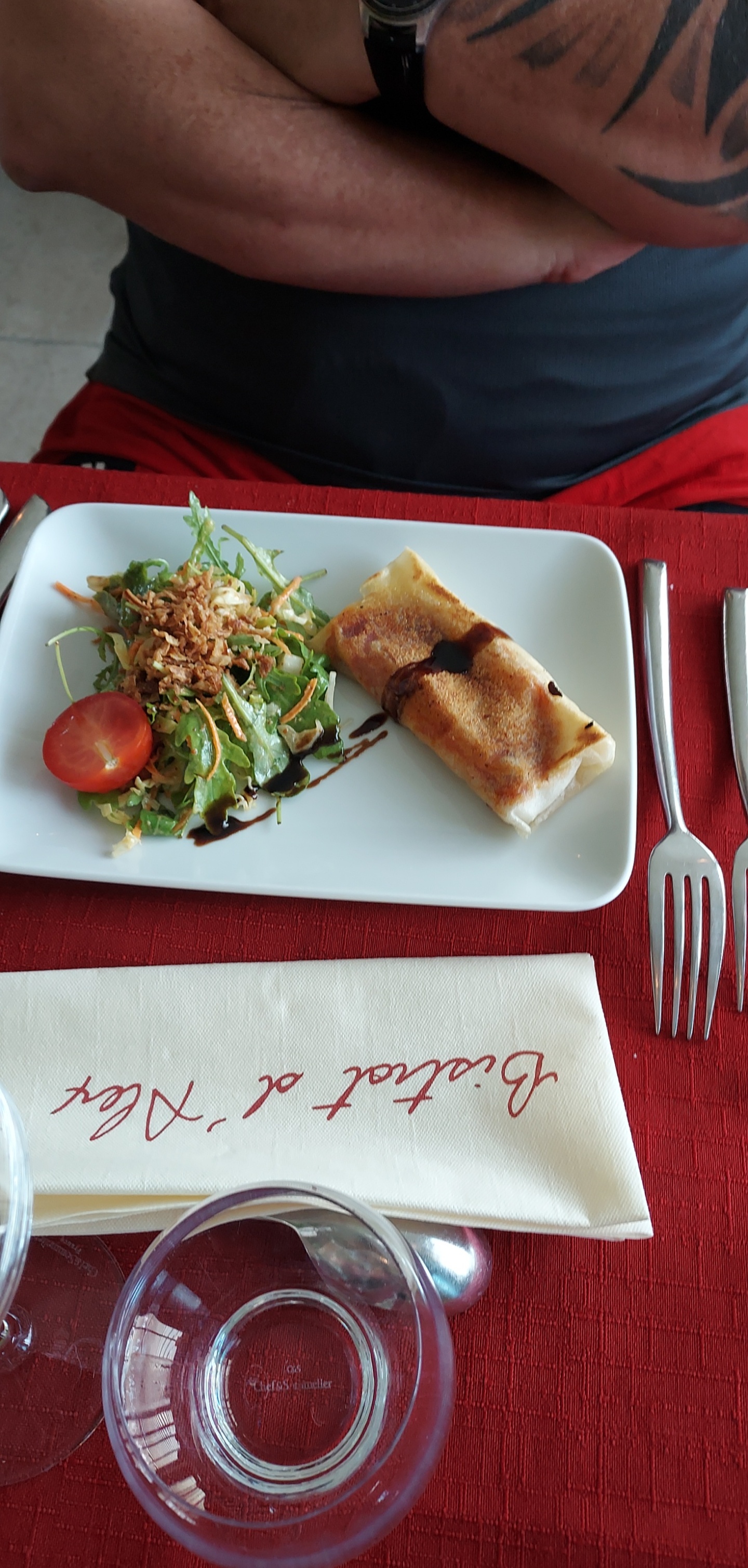 Les porteurs d'assiettes ont la grosses têtes et considèrent les clients comme des copains, et ceci n'est pas acceptable ni agréable. La seule serveuse que j'ai vu ne se comporte pas de la même façon et est bien plus efficace. Pâté en croûte (catastrophe !) acheté chez Carrefour ?? ou autre ?! Pâtes à l'encre de seiche (servies avec la brochettes de lotte) moins que tiède) c'est dommage . Rougail de saucisse excellente et chaude (saucisse en quantité homéopathique) Baba au rhum vous pouvez zapper, il est sec, mauvaise présentation, crème sans saveur, et la seringue de rhum ressemble à un accompagnement de dessert de self-service. Tout ceci pour annoncer un rapport qualité-prix très-très moyen. Si l'on considère le prix du menu plus les suppléments. Salle bruyante, et si vous venez avec un manteau, en gros, vous vous débrouillez, (dixit la réponse du porte assiette)