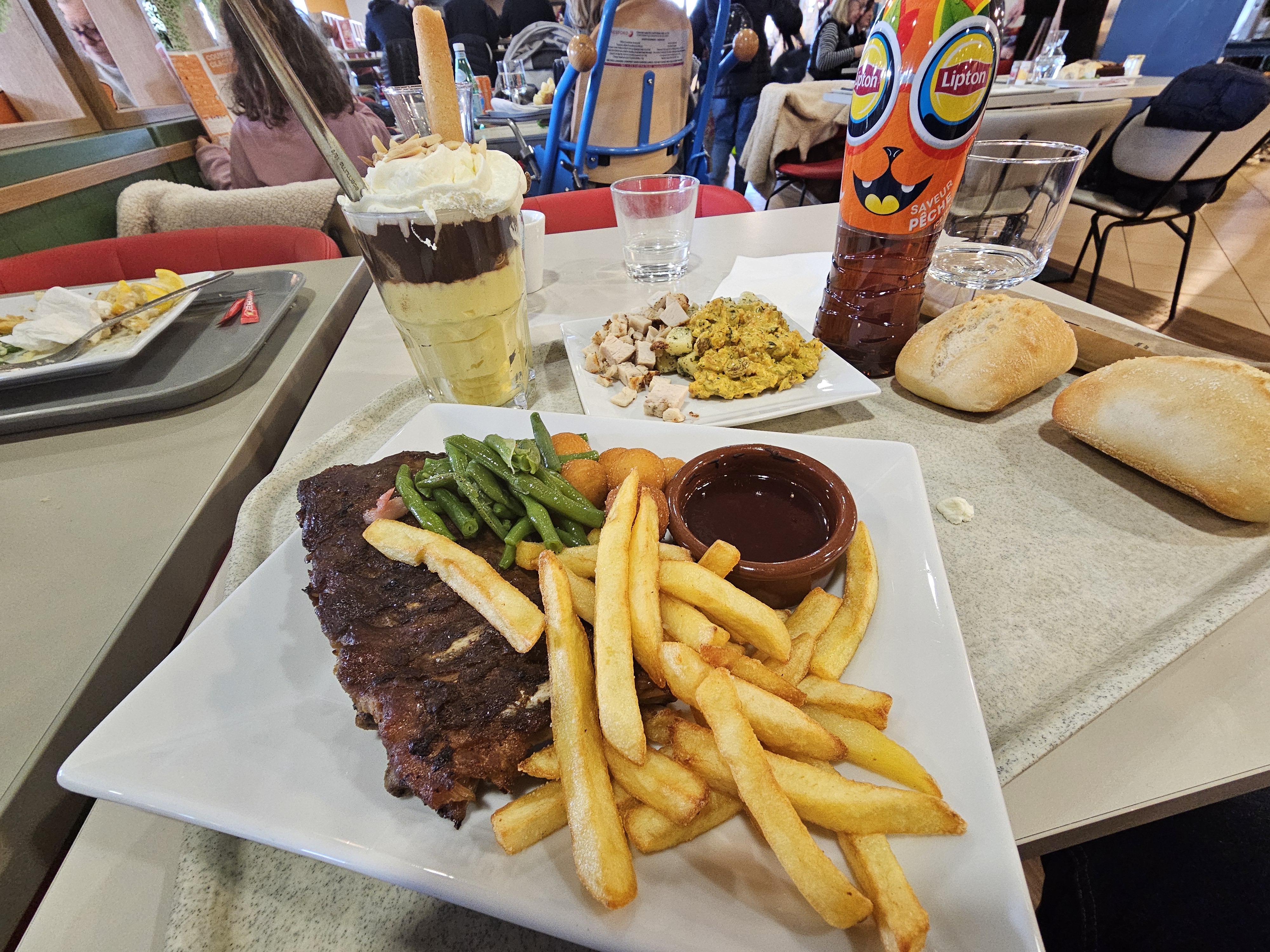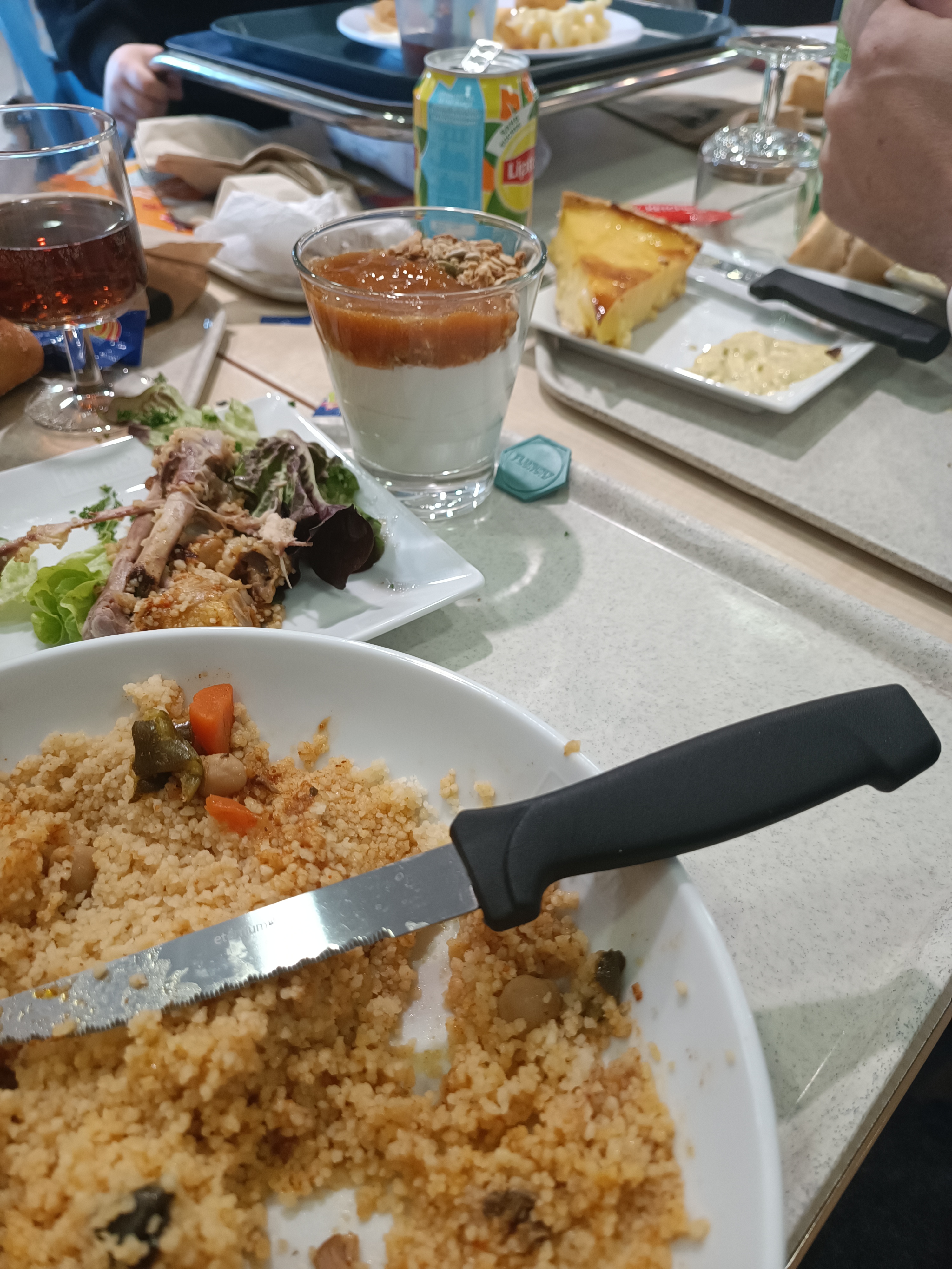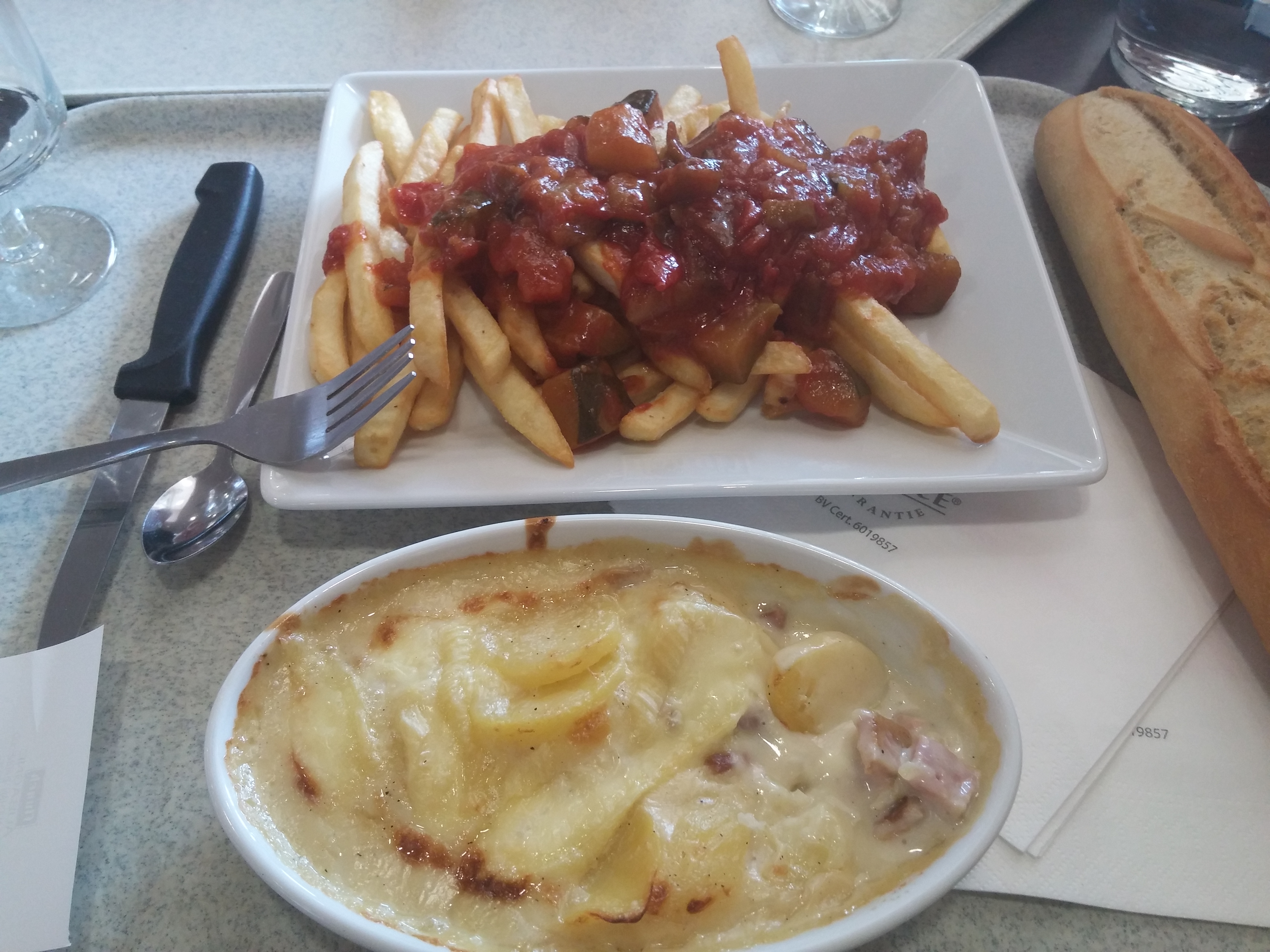 Bonjour. Repas pris à environ 13h30 gros manque de vaisselle dès le début. Boissons manquantes, entrée aussi. Plat de légumes limite, purée solide pouvant être servi dans le bâtiment. Demande de cuisson cuite de la viande hors cœur cru. Bref restauration limite.