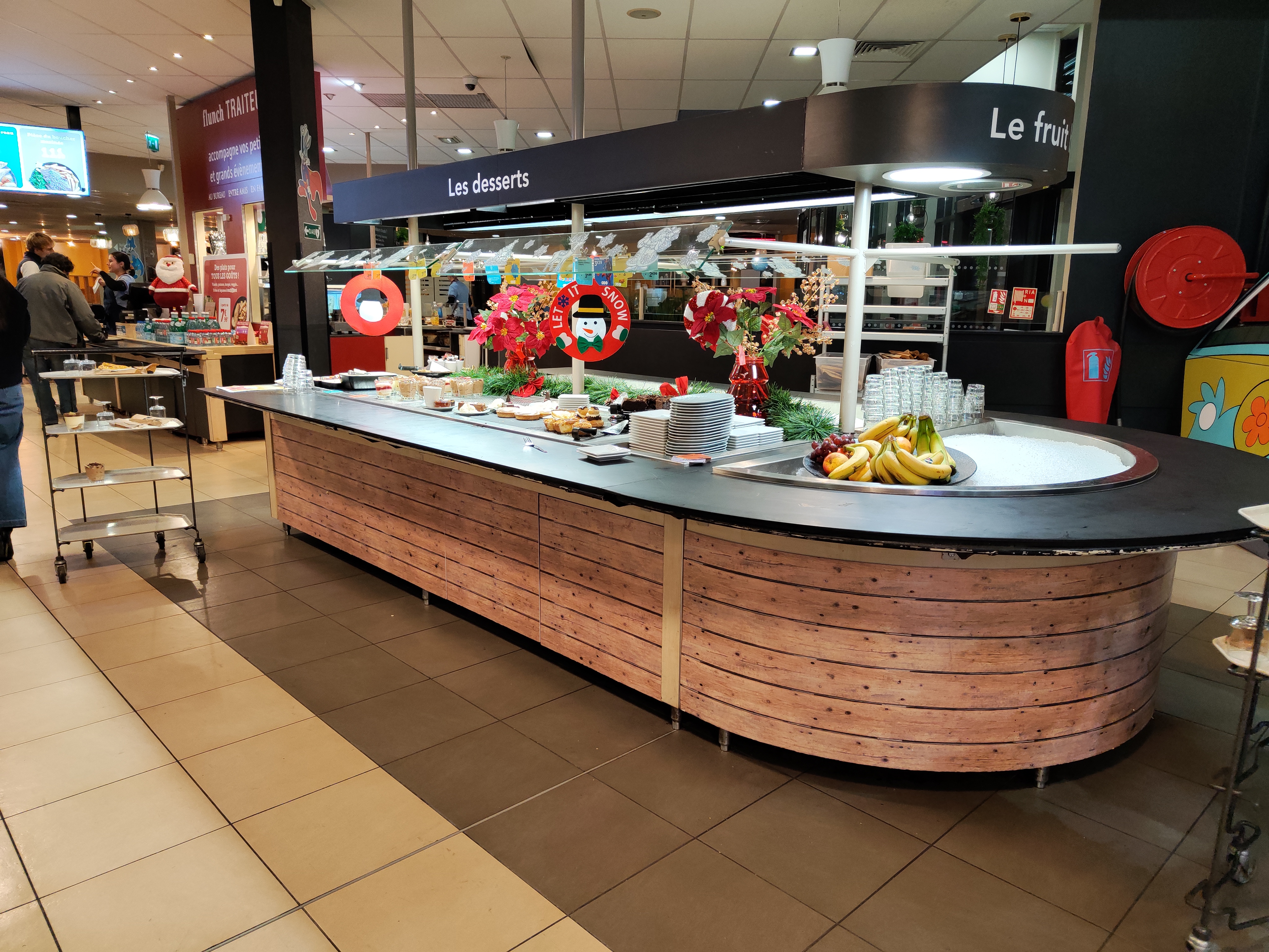 19h20 Une seule caisse ouverte avec une longue queue, pas de gaufres ni de crêpes, nous avons commandé un riz porc au curry , en cuisine plus de riz après avoir payé, choux de Bruxelles en purée goût brulé, , merguez sèche, pas d eau à la fraise pour le menu enfant après avoir payé . Personnel énervé et arrogant.