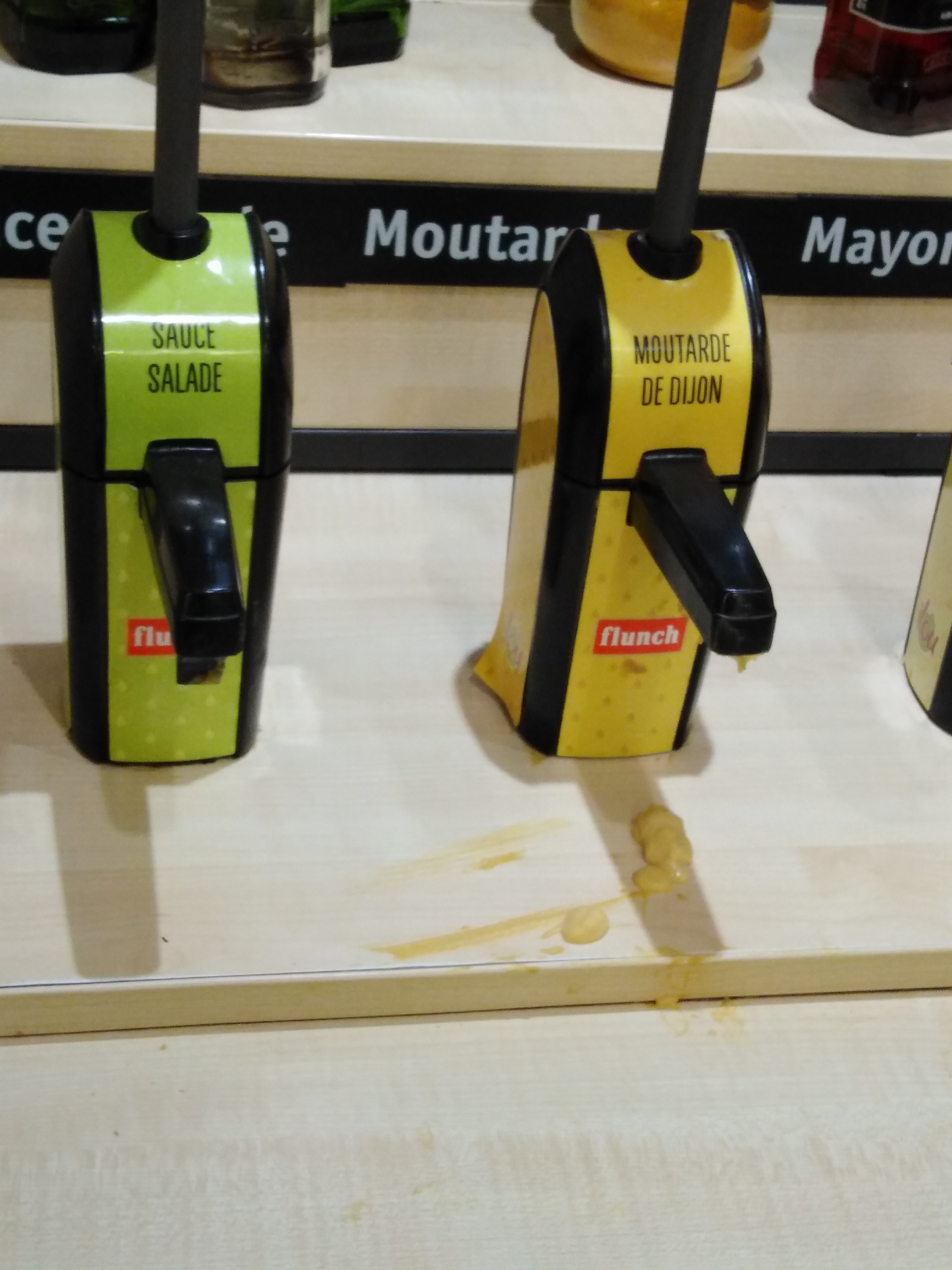 Je ne peux considérer ce Flunch comme un restaurant, mais plutôt comme une sorte de cantine. Vous saisissez un plateau, un verre et des couvert dans les paniers et vous partez pour un self services comme au collège! C’est pas cher, c’est plutot bon, rapide! Le principe est simple: choisir un plat principal chaud, et la garniture est à volonté et avant de passer en caisse, vous avez la possibilité de choisir votre propre entrée froide, votre dessert ( sucré ou salé), vous pourrez choisir aussi votre boisson( vin rouge blanc, rosé, sodas, eau gazeuse). Les accompagnements à volonté sont très très sain! Haricots, courgettes, purée (en sachet!!) petit pois, gratin de chou-fleur, sauf les frites et les pommes dauphines. L’eau en carafe est à volonté, les sauce aussi ainsi que la salade verte.