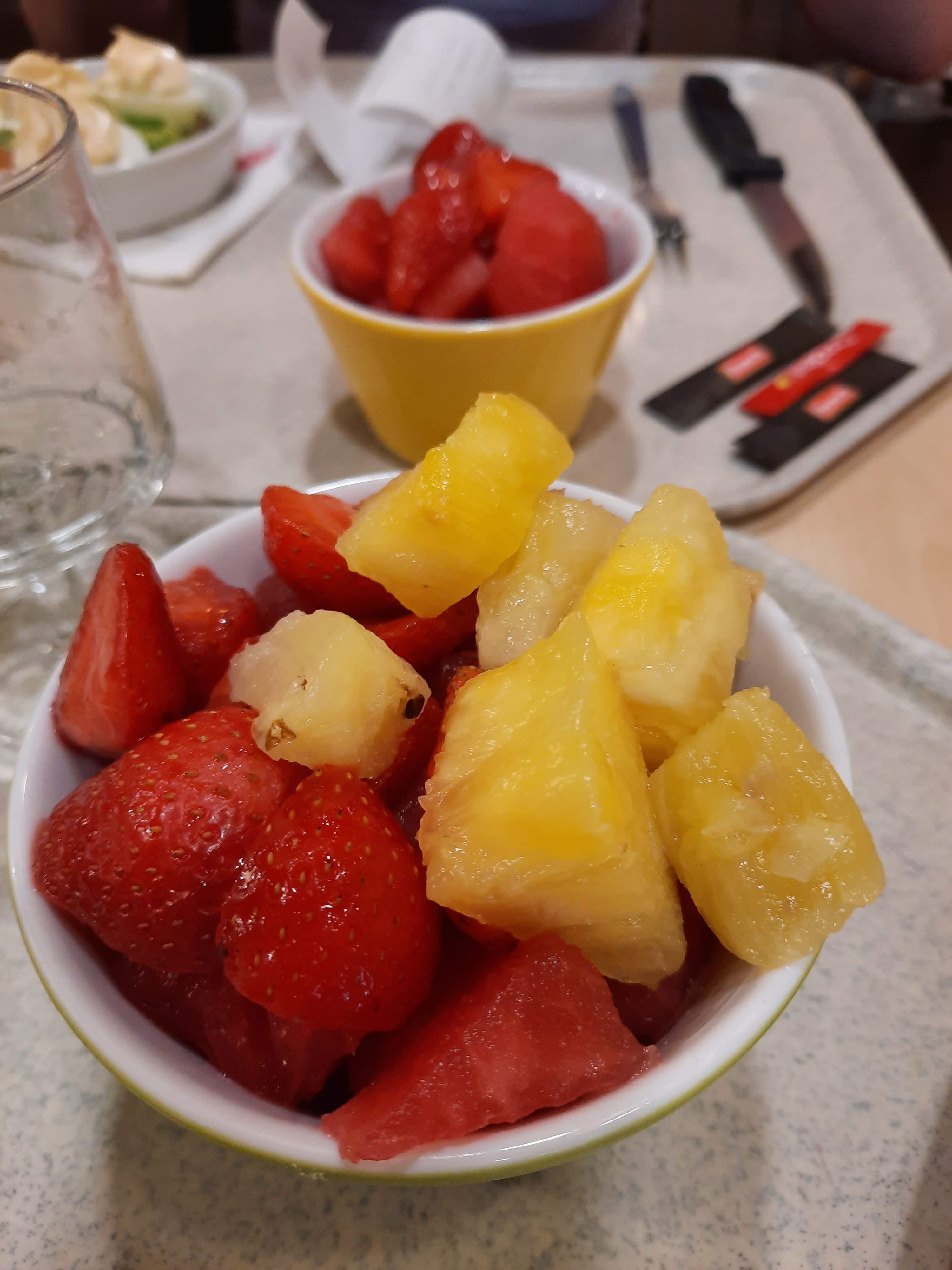 Vraiment très peu d'entrées de legumes dignes de ce nom et aucune salade de fruits ou fruit tout simple. Propreté irréprochable. Des légumes variés, mais pour moitié à l'eau, et pas grand chose pour les aromatiser. Pour finir, plus de 20 minutes pour cuire un steak haché ! 🤔 Après une journée chargée, ça permet de se restaurer, mais ça fait pas rêver.