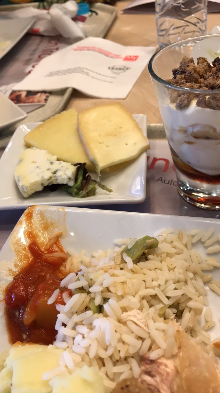 Déjeuner à 2 : pièce boucher matinée, mousse chocolat et fraises. La viande bonne mais les sauces insipides. Légumes : frites et pommes noisettes molles, industrielles surgelées. Mousse correcte, sans plus. Fraises sans trop de goût et sans sucre. Expresso correct.