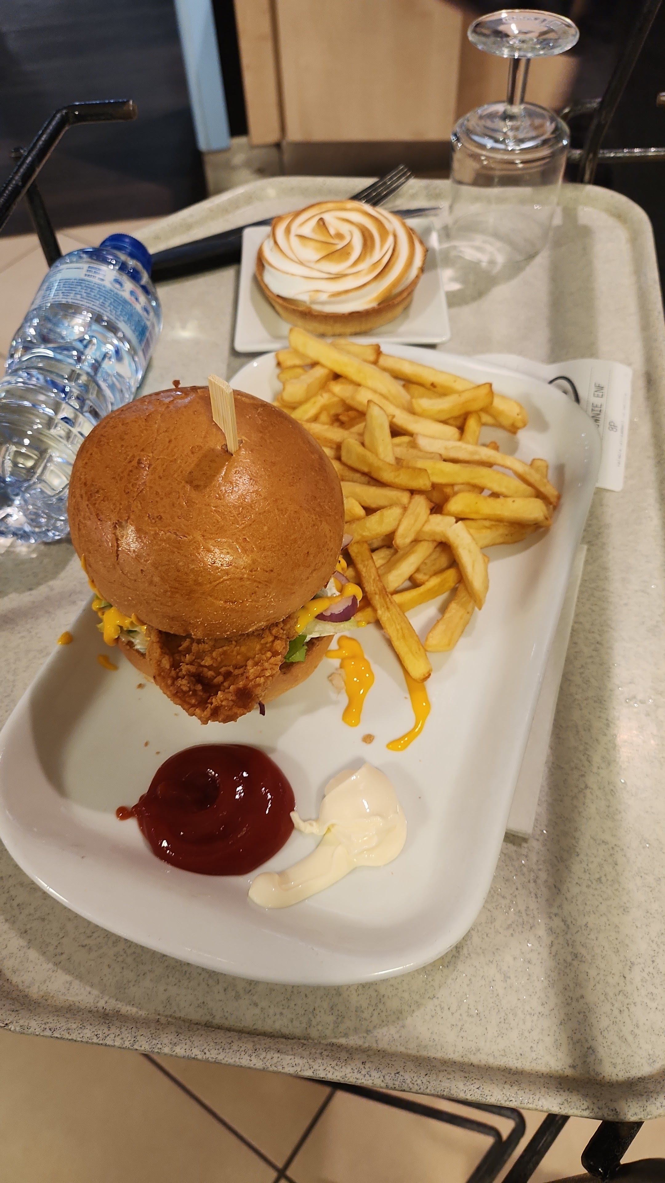 Assez bon pour une cafétéria, le prix est assez correct 👍🏼 Le burger que j’ai pris était froid mais très bon, il a du potentiel, je pense que si il serait fait un peu plus vite et chaud, il serait vraiment très bon ✅ La tarte au citron était cependant un peu trop chargée en citron (j’aime bien ça mais quand même 😭) Clin d’oeil pour le personnel qui est très accueillant 👍🏼