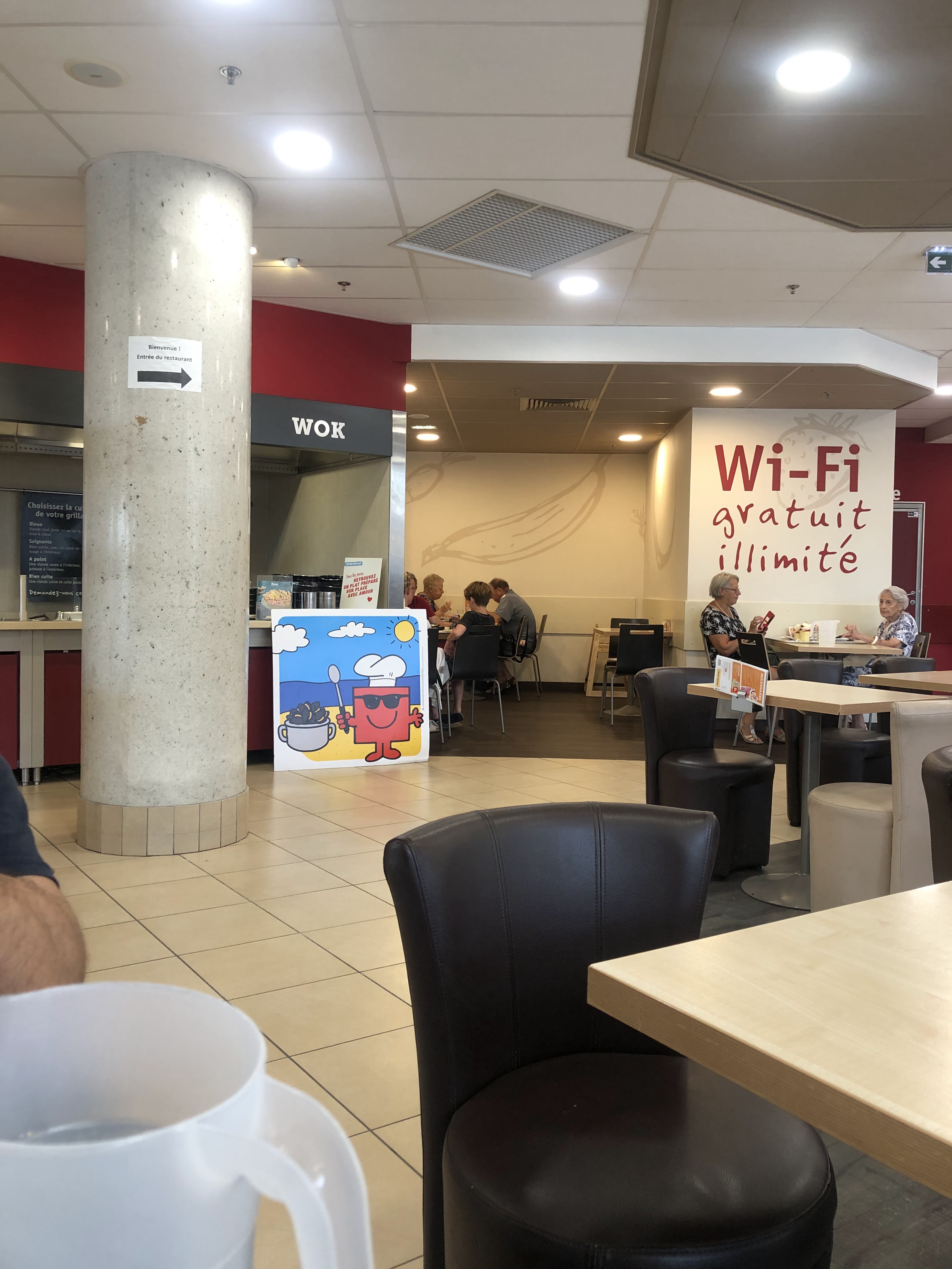 Nous étions 25 personnes à venir déjeuner, le service était rapide pour la plus part, le passage en caisse fluide, la cuisine est relativement correct (mise à part certaines cuissons de viande ainsi que la salade de fruits pas très fraîche). Nous sommes, cependant satisfait de notre visite. Cordialement,