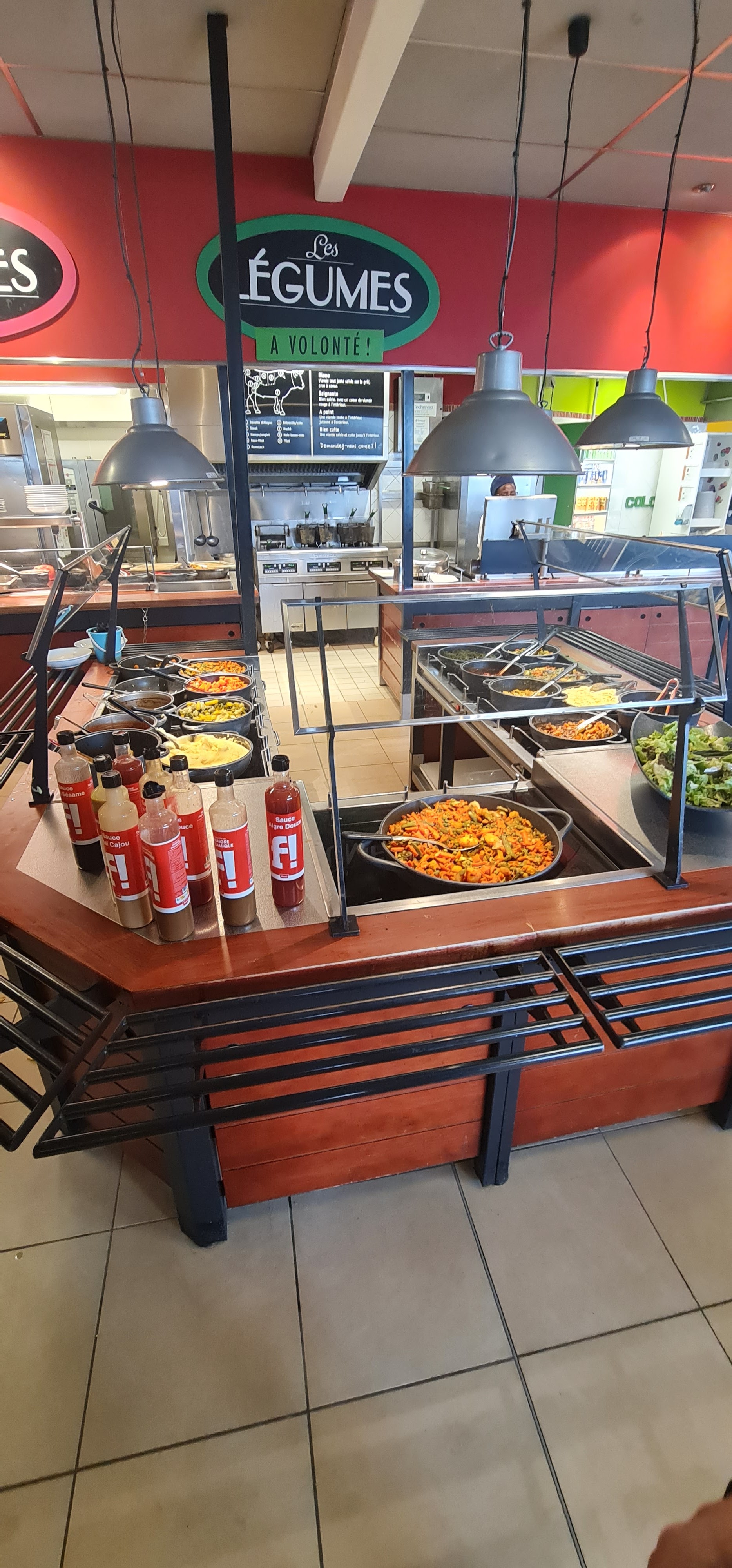 Nous sommes arrivés à 19h55 un dimanche devant les légumes chauds avec pas grand chose en choix (pâtes, carotte, riz, haricots verts, un petit reste de PDT grenailles ainsi que ratatouille). Pour ceux qui viennent pour les frites alors ça vous en trouverez à n'importe quelle heure. Sauf que moi je ne mange ni pâtes ni frites. Je n'ai mangé que le petit reste de PDT grenailles, ratatouille et haricots verts avec le filet de Colin, une petite tartelette de framboises et une petite bouteille de rosé pour un total de 16€ et je repas de là bas en n'ayant encore faim car n'y a plus de pommes noisettes, ni de PDT grenailles, ni de ratatouille (il restait un fond qu'ils ont rempli de sauces tomates donc je me suis pas reservi) heureusement que j'ai pu me servir un peu avant. Cher pour ce qu'on mange cencé être à volonté, oui pour les frites et les pâtes. Client très déçu, ne reviendra pas, vous pouvez compter sur moi.