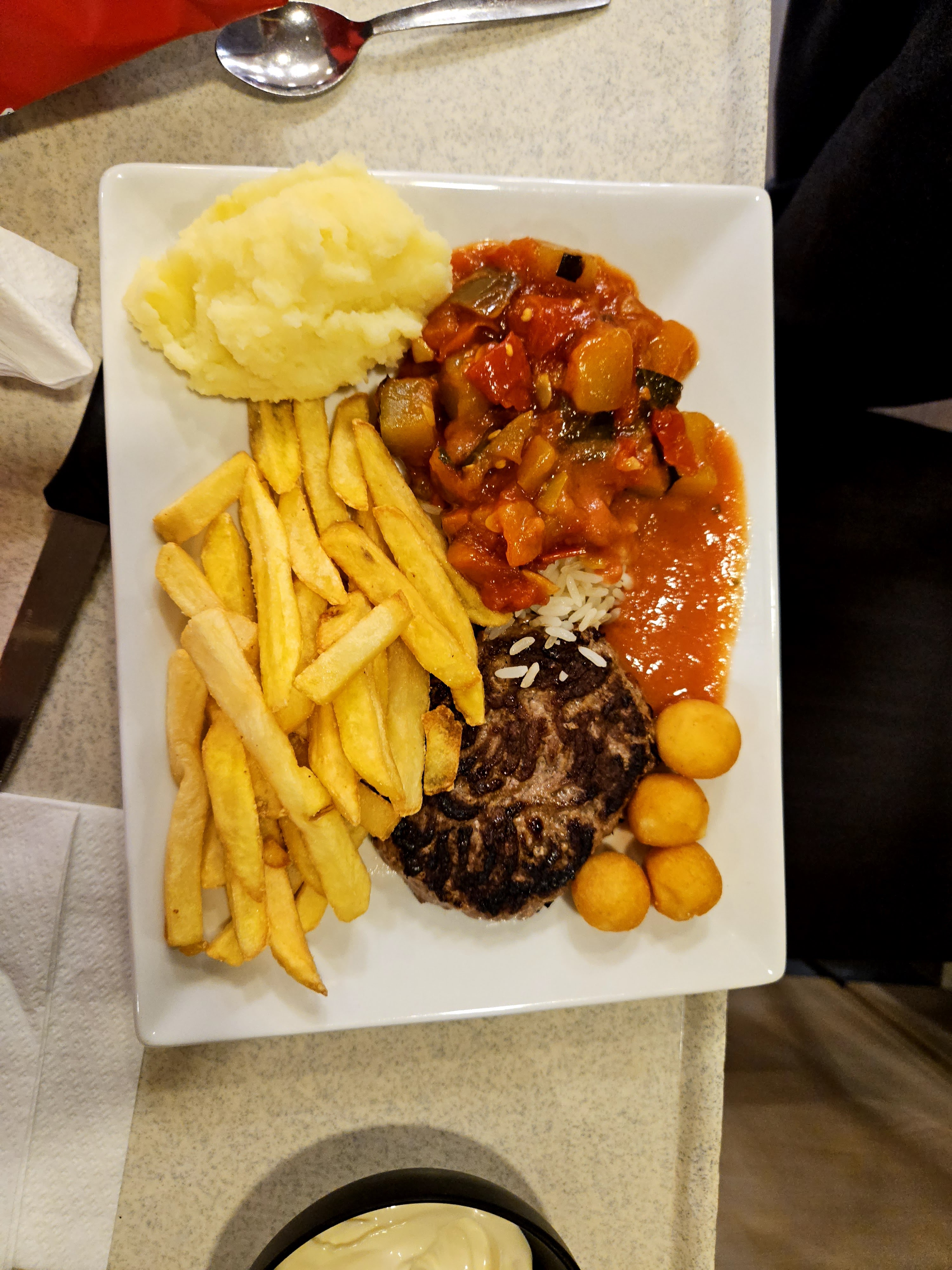 Arrivés vers 13h30, buffet de légumes peu fournit, choux de Bruxelles croquants.. frites à peine plongées dans la friteuse ! Et au moment où je vais chercher mon café 😳, l’état des machines à café interpelle… les buses sont incrustées… Je ne vous conseille pas ce lieu .