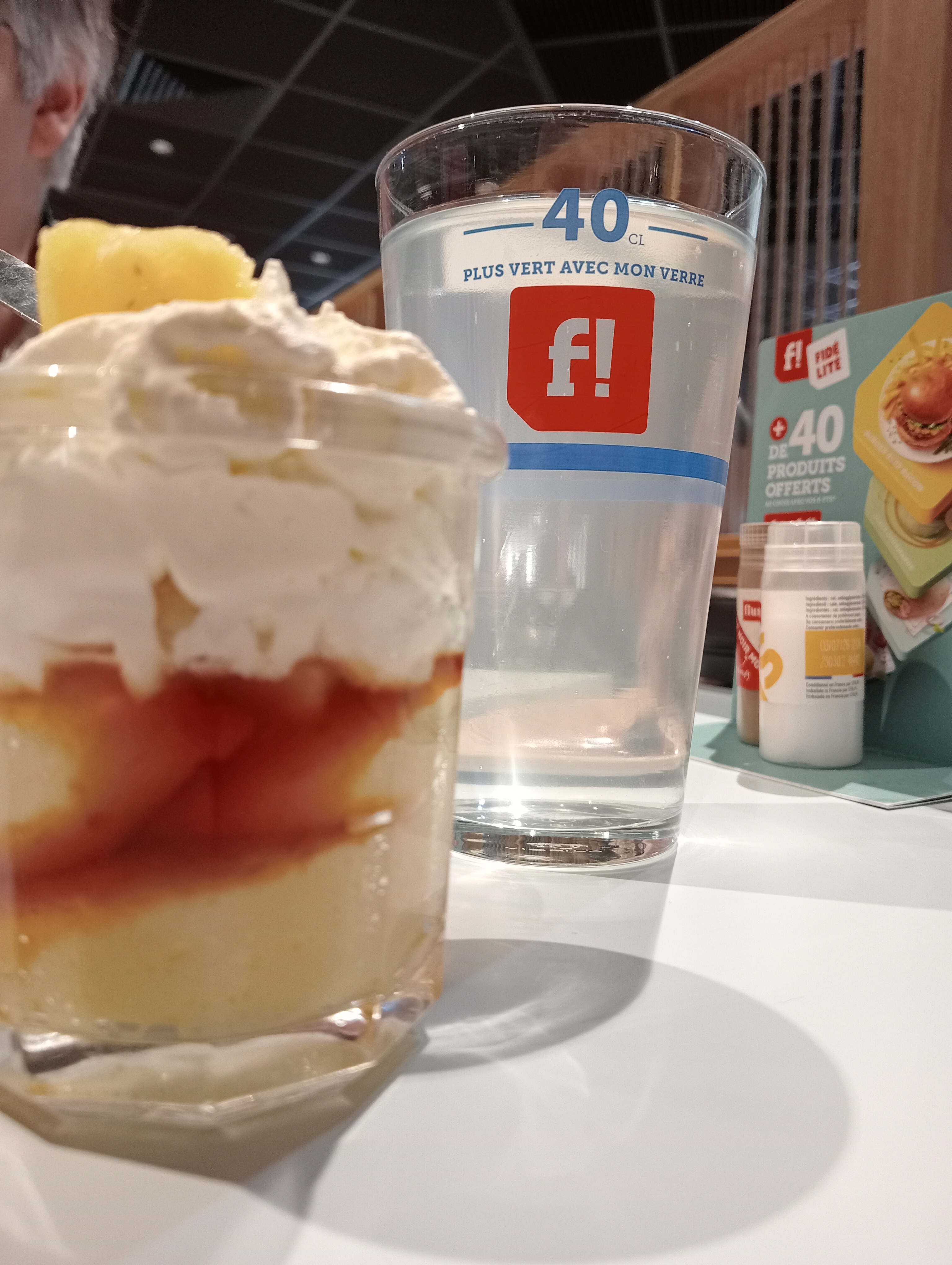En regrettant de ne pas avoir eu la possibilité d'avoir un verre à pied pour mon choix de boisson, chopes hautes (40cl) totalement inadaptées à la dégustation du vin. Laissez tout au moins le choix d'un verre à pied comme précédemment, même, on peut le comprendre, dans une volonté de rationalisation de la vaisselle vraisemblablement orientée sur les boissons gazeuses de type américaines favorables à l'embonpoint...