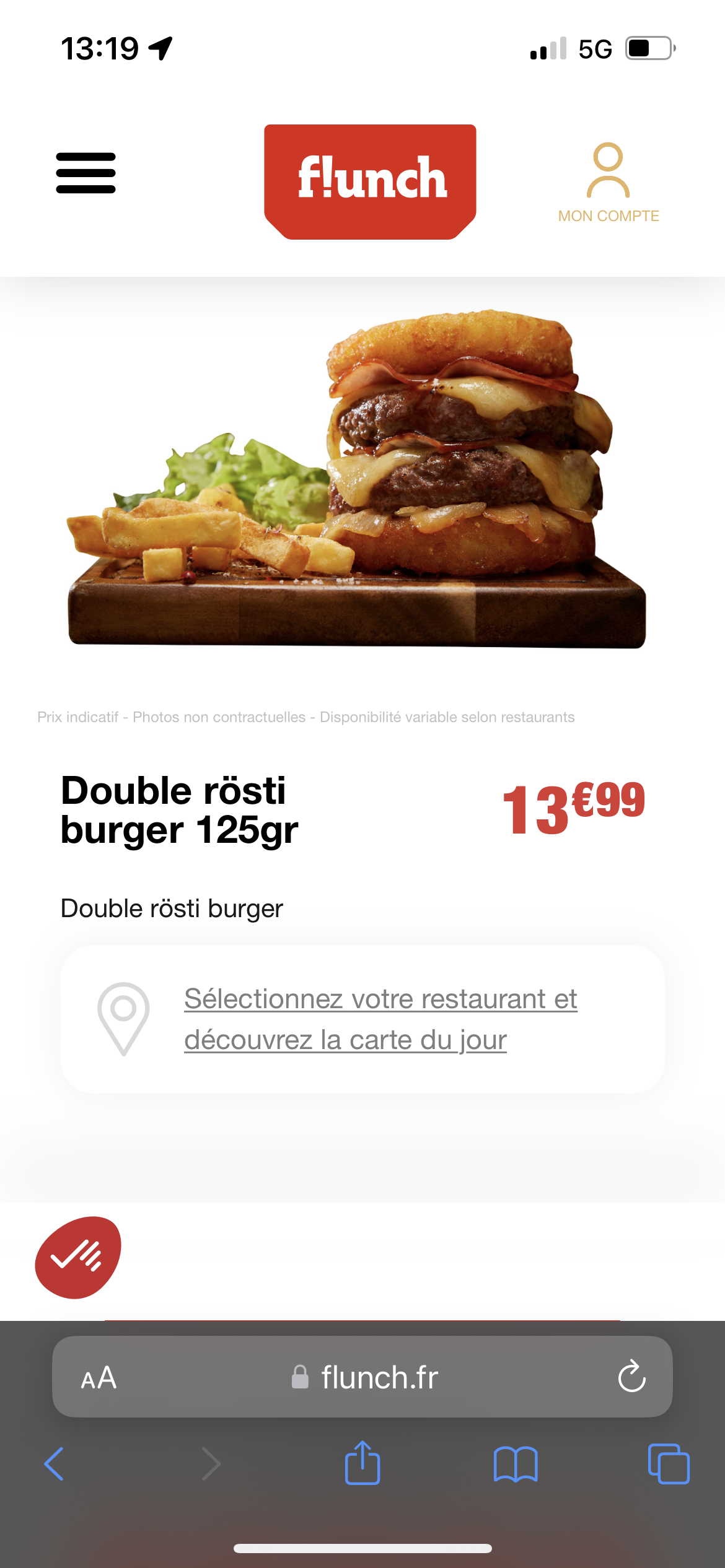 J ai pris le roasty burger et j ai été très déçu ! C est 1 galette de pomme de terre 1 steak et par dessus tranche de fromage et 1 tranche de bacon. Sauf qu ils posent le fromage et le bacon sortis du frigo sur le steak du coup c est froid et pas top! Faudrait voir a faire chauffer la tranche de fromage sur le steak ça serait bien meilleur!