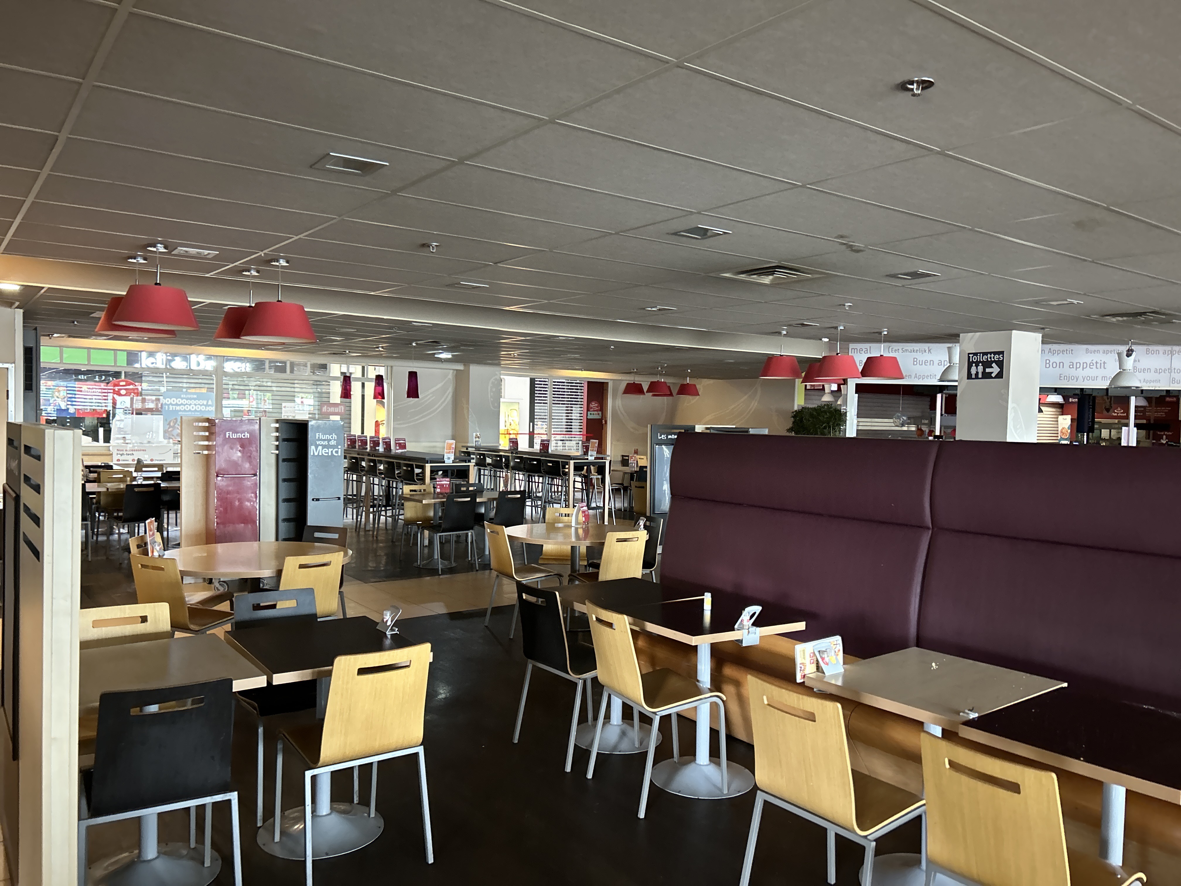16h00. Salle jonchée de plateau non débarrassés, salles dégoûtante et pas de personnel aperçu pour débarrasser. On dirait que tout est à l abandon. Un samedi après midi ! Seuls au stand crepe les employés peux polis (2 fois le vendeurs prend ma commande et au moment où je lui parle part pour aller voir sa collegue), il me sert une crepe vraiment mal présentée (très grossiere) et un chocolat chaud qui finalement est de l eau au chocolat. Lamentable