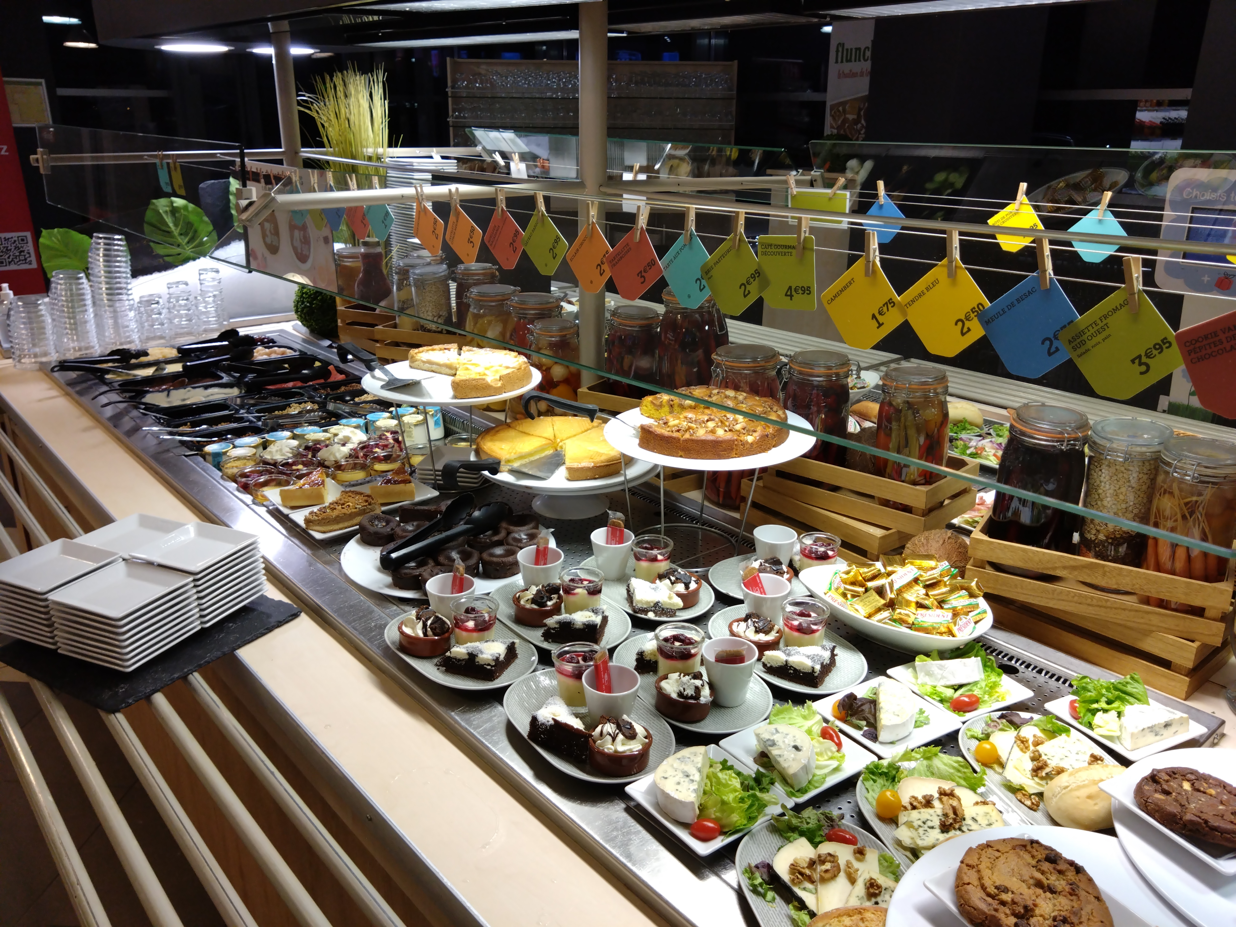 Arrivée vers 13h00. Plus beaucoup de choix. Obligé de trouver une employée pour demander les manquants. Beaucoup de prix sont absents. J'ai changé de plateau et de verre, pas propres du tout. Plats chauds corrects Par contre toilettes vérifiées à 13h00, après mon déjeuner, pas du tout de savon !!!