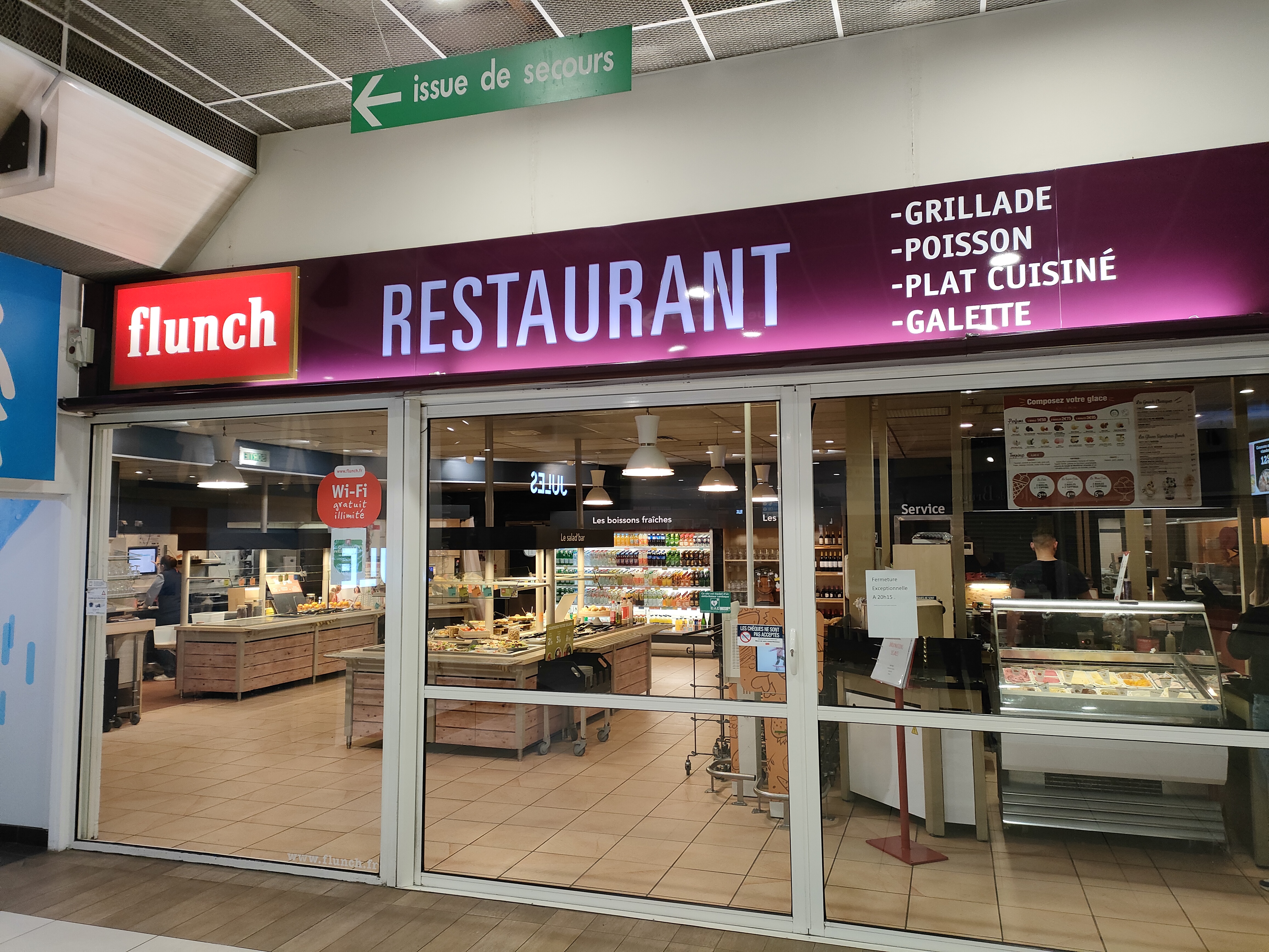 Dimanche soir nous avons mangé à Flunch Ollioules 19h..pas grand monde..une seule caisse l autre en panne...les gens s impatientaient..niveau hygiène pas top ..sol sale..un enfant a cassé une bouteille on ramasse le verre vite fait on laisse le liquide au sol (attention aux chutes) la personne au caisse (Mr) et la même personne pour les glaces on a pas de gants on ne se lave pas les mains (vu de mes yeux 😱 hygiène) pour les glaces faîtes à l arrachées.. voilà pourquoi 2 étoiles.. cela faisait longtemps que je n'y était pas allé..il va se passer encore un moment avant d'y retourner.