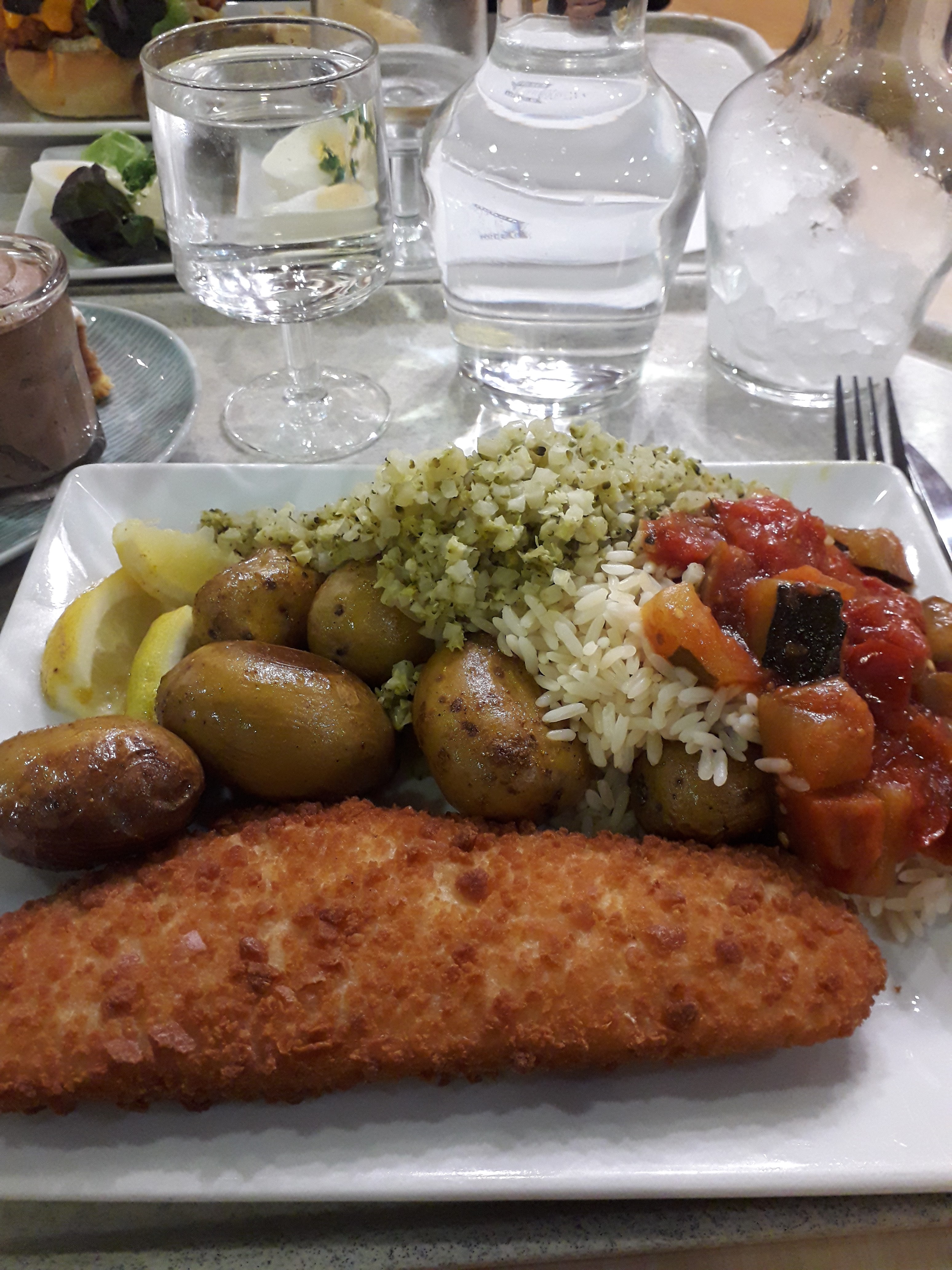 J'ai beaucoup aimé le choix de légumes. Alors évidemment on peut choisir les classiques riz blanc ou frites... Mais quel plaisir de se servir de la très bonne ratatouille, du riz safrané, des lentilles, des courgettes, etc. Dans la vie, il faut manger des légumes ! En dessert, ma tarte aux framboises crème pâtissière était plutôt pas mal aussi.