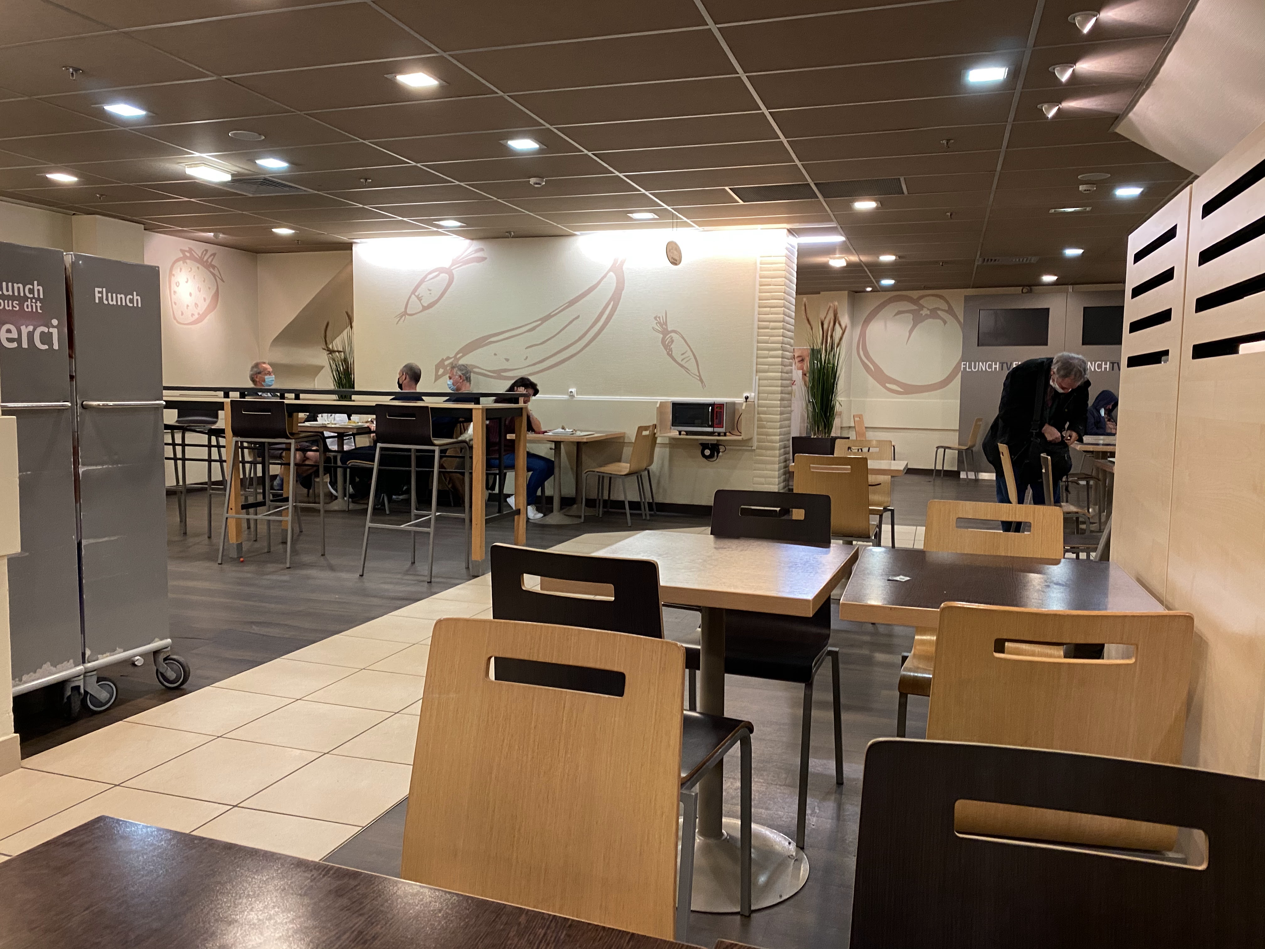 Flunch grande cafétéria qui se trouve au sous-sol. Moi qui aime bien voir l'extérieur, il n'y a aucune lumière directe venant de l'extérieur. Ceci dit, le repas est un peu cher rapport qualité / prix ( ca a vraiment augmenté par rapport à l'avant Covid ) mais les légumes sont à volonté. Mais dirais-je on peut aussi trouver des restaurants au même prix. On a nettoyé nous-mêmes les tables car le personnel qui est gentil fait de son mieux mais pas assez nombreux au vu de la surface de ce Flunch. Les toilettes aussi devraient être nettoyées plus régulièrement et faut aussi que les clients mettent du leur. Le robinet d'eau ne marchait pas. Bref en un mot, ce que je dis là, peut paraître complètement glauque. Toutefois, je ne mets pas une étoile, car je pense que c'est une cafétéria qui rend bien service 👍👍👍 à tous car on ne nous embête pas une fois que nous avons consommé notre repas et on peut discuter tranquillement sans être les uns sur les autres. Oui peut-être qu'il y a des gens qui dorment sur les tables ou qui viennent y fondre leur solitude et je trouve cela bien que Flunch fasse preuve d'humanité et qu'on les laisse tranquilles. Je me suis dit que la prochaine fois que je viendrai, j'animerai une petite séance gym douce ou autre chose☺ à ces gens qui semblent, pour certains, paumés et qui s'ennuient à mourir. Laissez les tranquilles et merci Flunch. Le repas est un peu fade mais j'ai rajouté du sel et c'était très bien ; j'étais avec une personne radine et elle a pu se servir en 3 fois de lentilles et je trouve qu'alors le repas ne revient pas si cher, même si je connais un bon restau qui ressert à volonté des légumes. C'est vrai que les cuisiniers pourraient faire preuve de plus d'amour 😉en cuisinant et en servant des portions un peu plus importantes, mais ca va quand même. C'est une cafétéria. Le café est excellent !