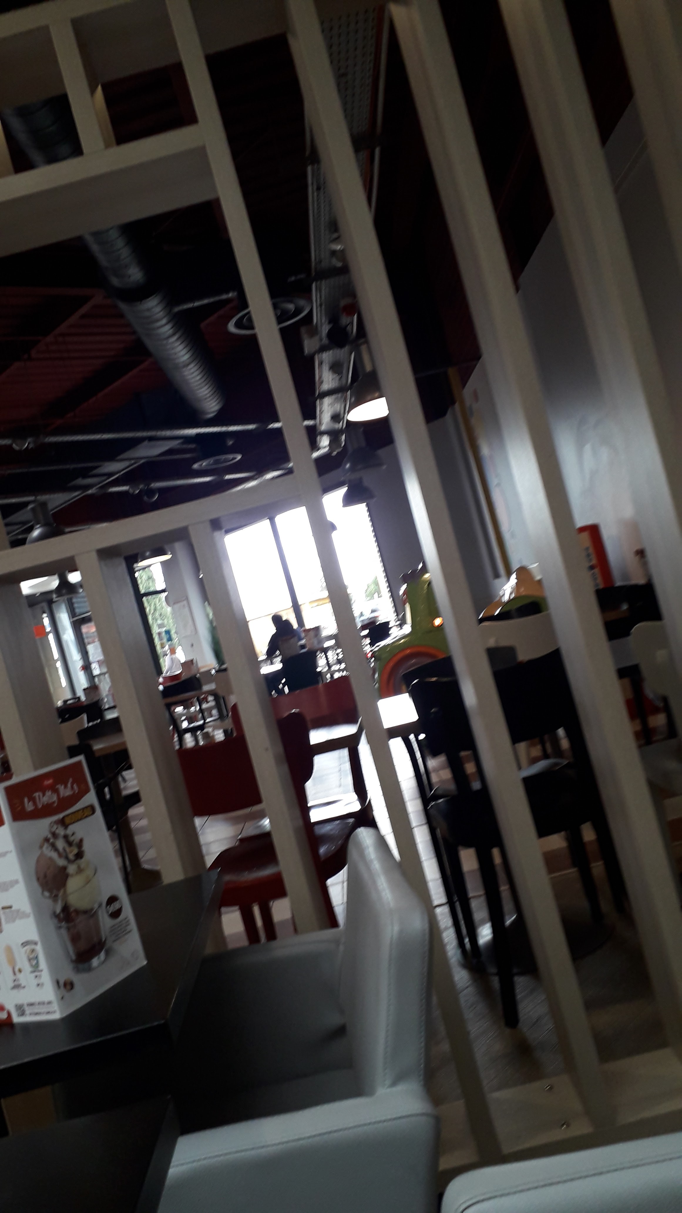 Arrivés un peu tard d'accord (14h), nous n'étions cependant pas les derniers! Pour la commande d'un menu enfant, passage obligatoire par une borne qui ne propose pas tout (pas de steak haché alors qu'on a eu par la suite la possibilité et la gentillesse de m'en faire un) On commande une escalope milanaise, comme affiché mais en réalité il n'y en a pas, il s'agit d'une escalope à la crème. Je commande un steak haché, on me dit qu'il sera obligatoirement bien cuit, même si je préfère saignant. Aux légumes en libre service, pas de frites et même s'il reste encore un peu de monde, ils n'en refont pas L'eau n'a pas bon goût du tout (s'agit il de la qualité de l'eau ou du produit nettoyant sur les verres?). Quant aux jeux pour enfants, cela se résume à des jeux payants ou des écrans !