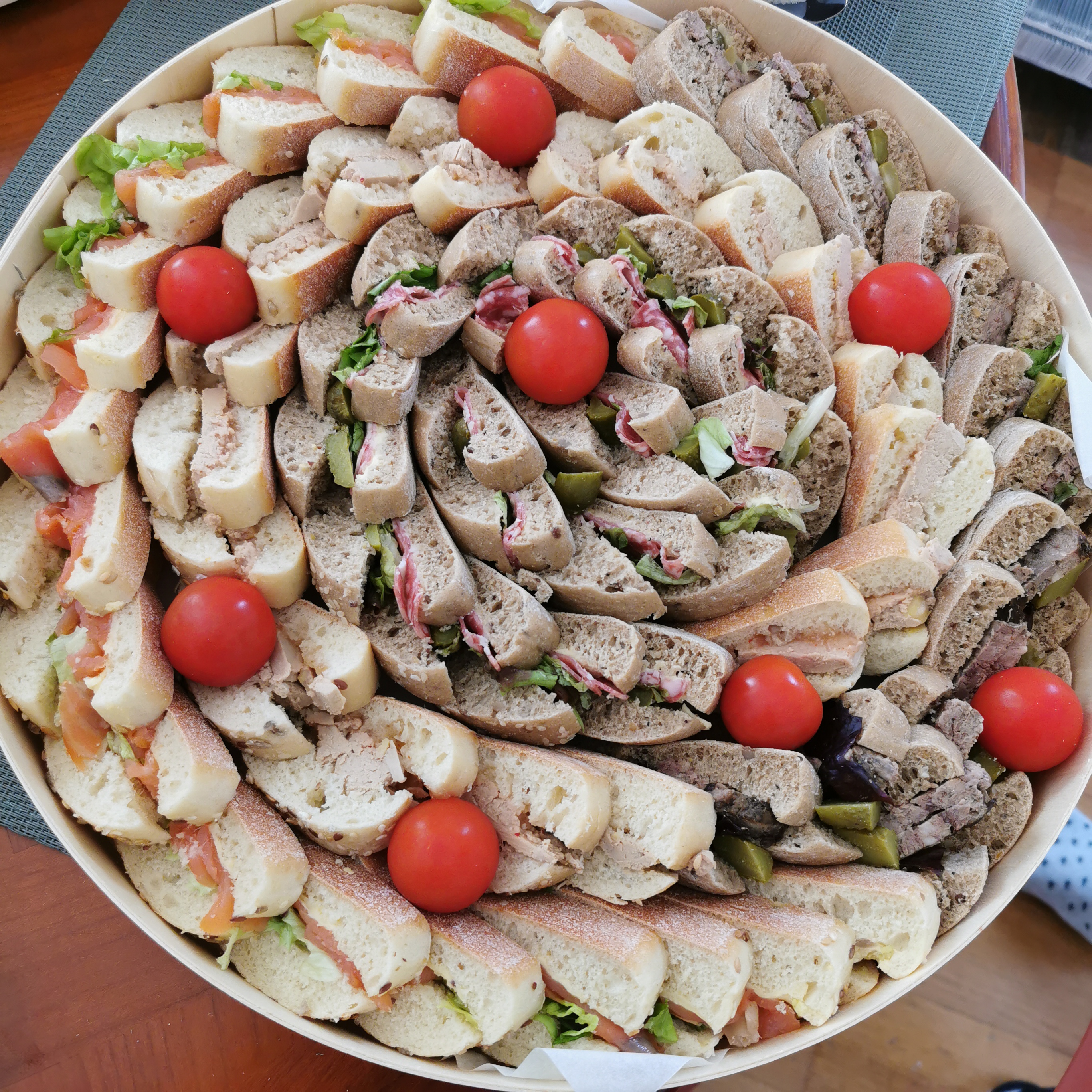 Retrait traiteur de deux pagnotes françaises. Les wraps sont toujours très bons. Les petits sandwichs pourraient être plus garnis. Belle présentation. Je recommande.