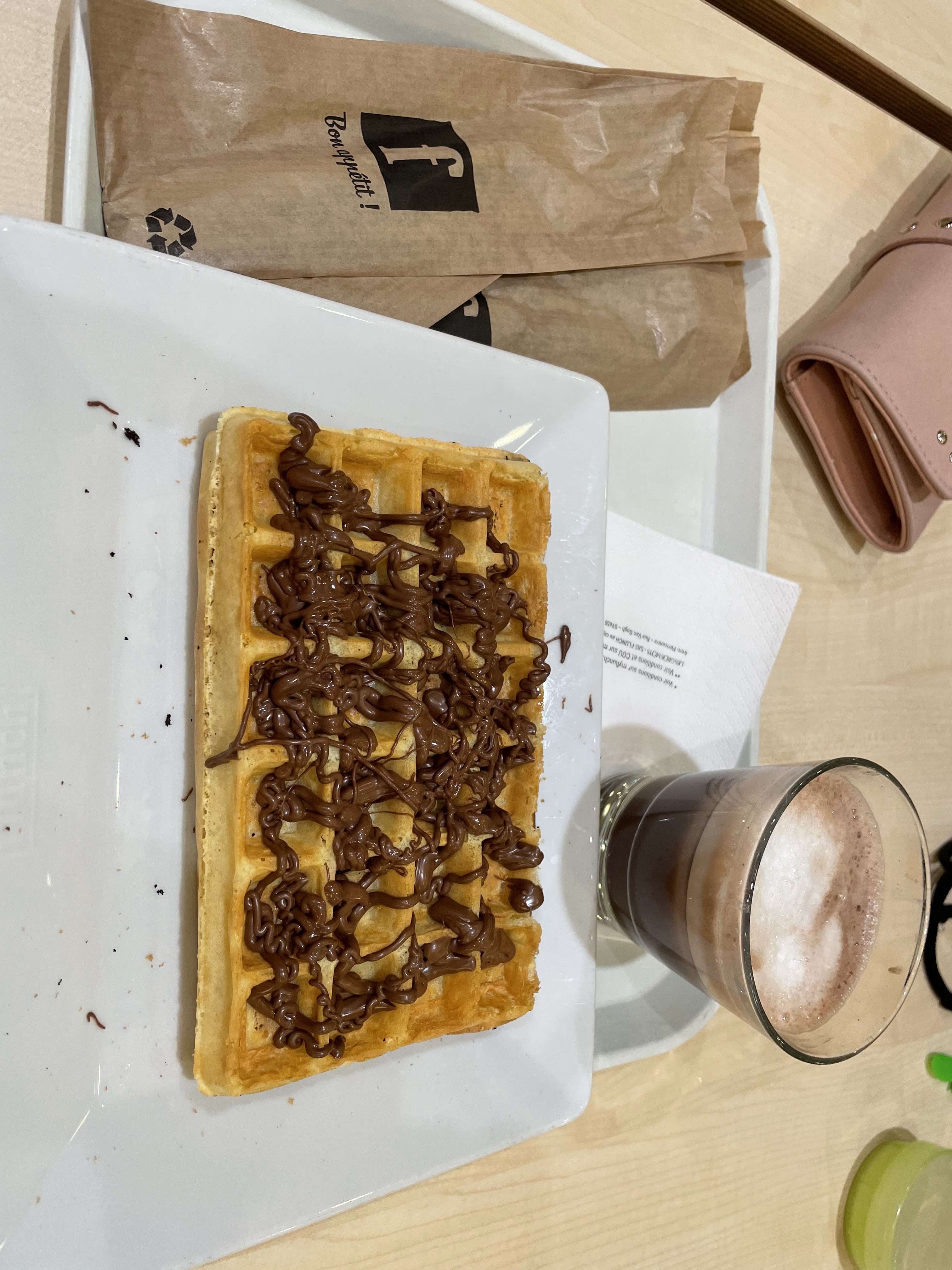 (J’ai oublié de prendre en photo avant de manger) - gaufres bonnes et croustillantes avec trop peu de Nutella. On a du se lever et demander d’en rajouter, ça a été accepté - chocolat chaud est froid ?!? J’ai l’impression que la recette consiste à mettre une tonne de chocolat en poudre + du lait froid ?!? (Voir photo) - tables non débarrassées (du monde un samedi après-midi) - canapé à côté de la salle de jeux pour enfants criants. Difficile de s’entendre.. mais bon ça c’est le flunch on le savait