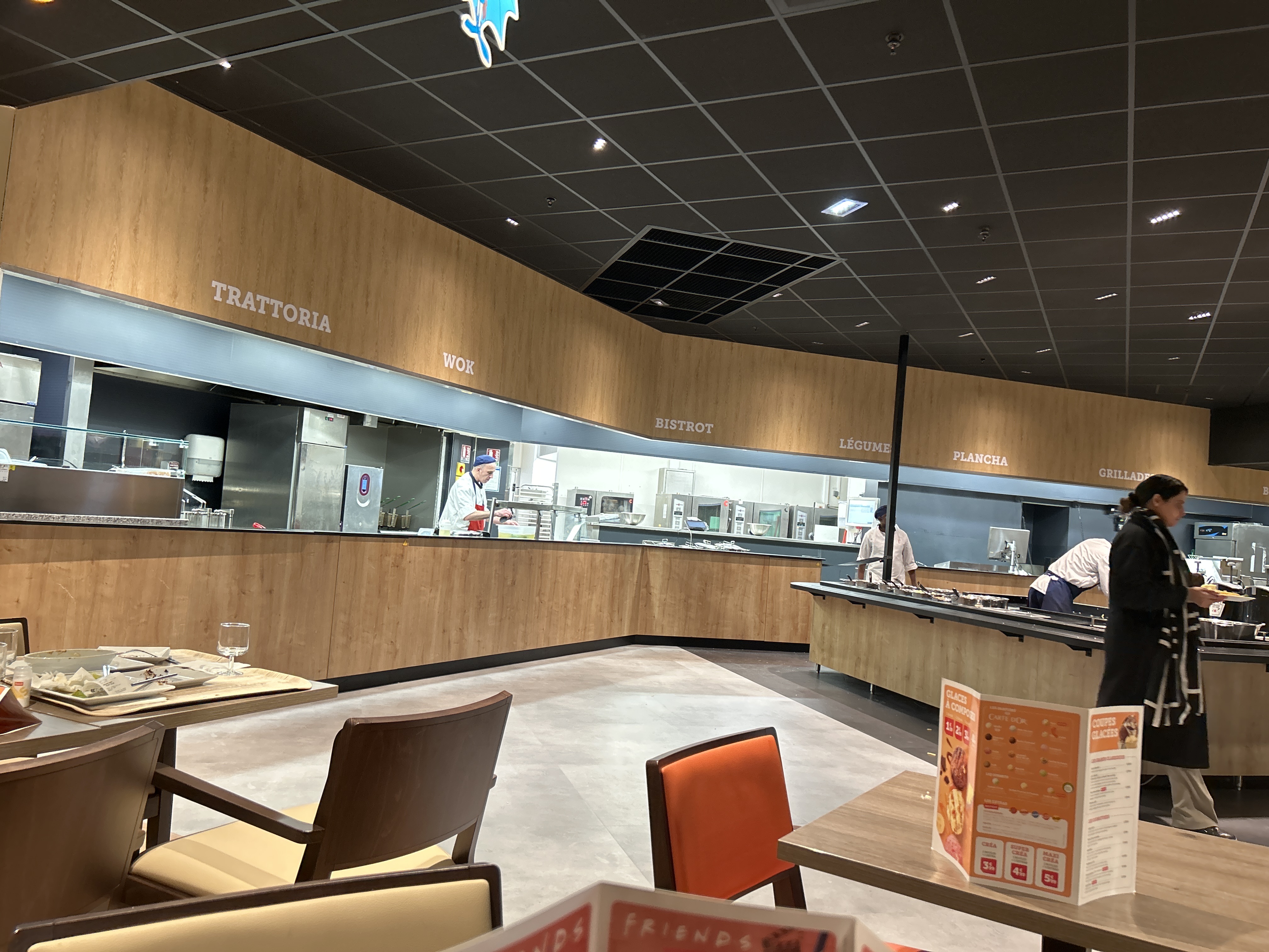 La cafetaria vient d'être refaite je ni suis pas encore allé mais la déco à l'air sympa je suis allé manger un risotto au s Jacques 12 ou 13 euros 2 cuillère de riz de toute petite s Jacques une douzaine et c'est tout un peu juste si on prend entrée plat désert c'est trop cher pour en plus aller se servir et débarrasser sa table un petit restaurant de quartier fait maison et on te sert et debarrasse et beaucoup mieux je ni retournerai pas tout et de la préparation déjà fait