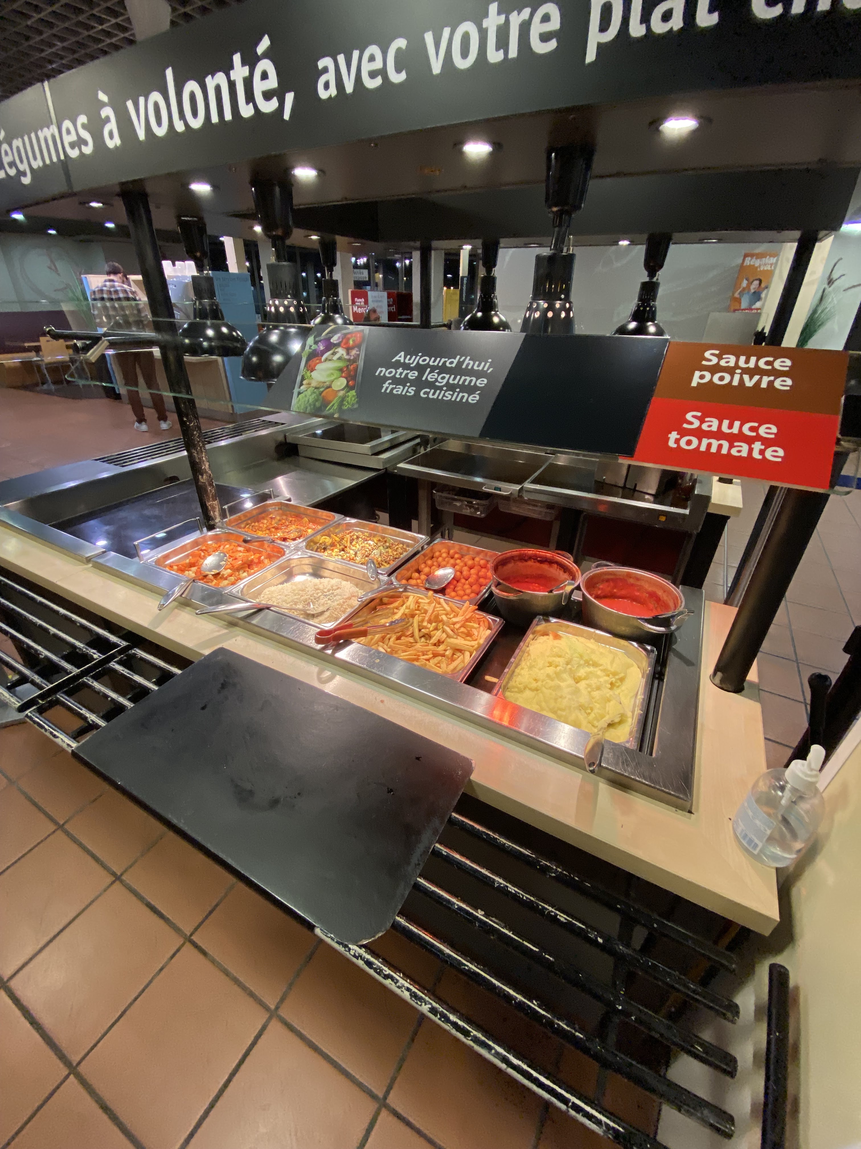 L organisation n ai pas pratique pas assez de choix niveaux légume haricot vert et épinard les enfants préféré d autre légumes la caissière pas très agréable complètement pommet erreur de prix entre ce qui est marquer et ce qu il ont en caisse bref decu et quand je vais chercher mon café mon dessert et m enlève mon plateau débarrasse la table j adore